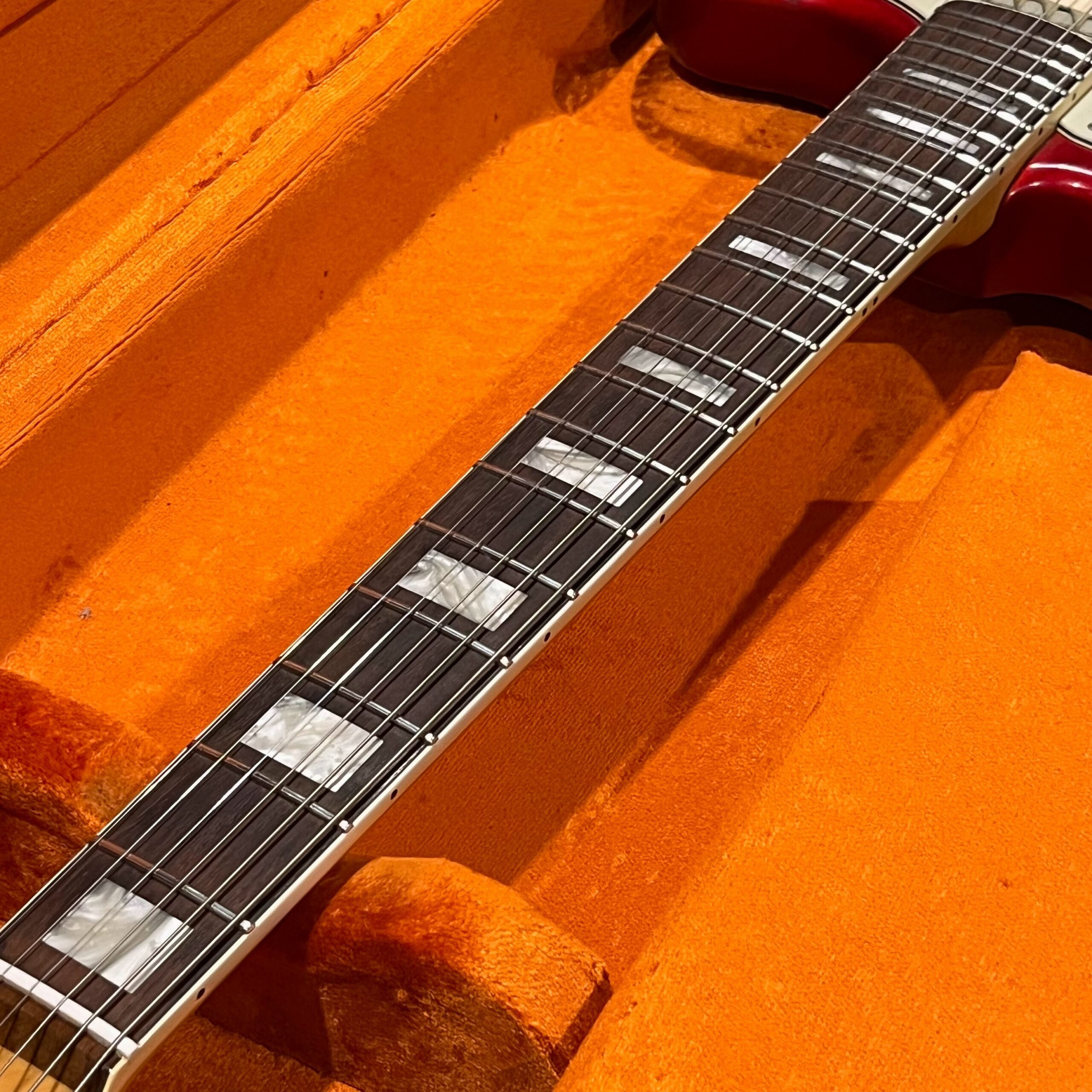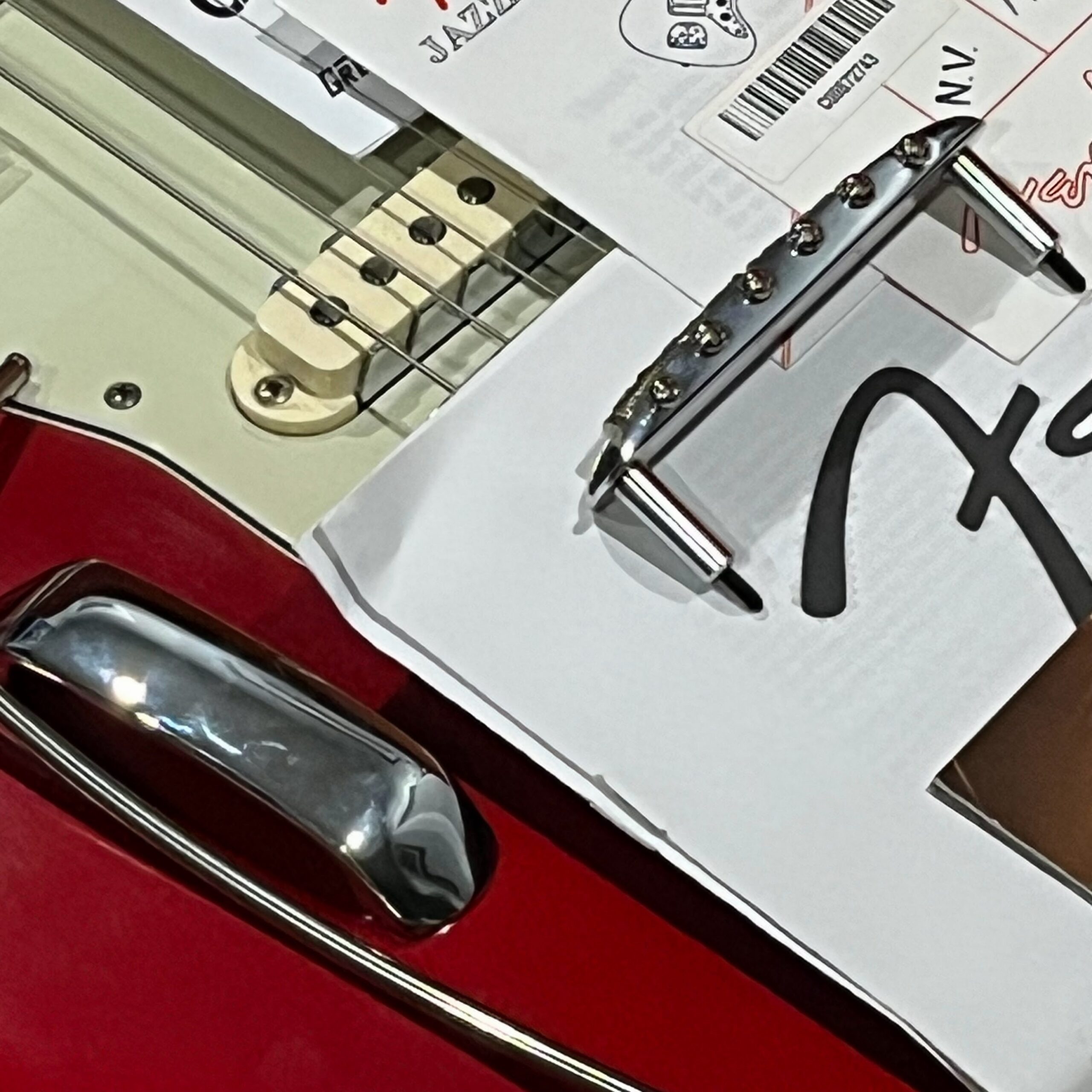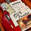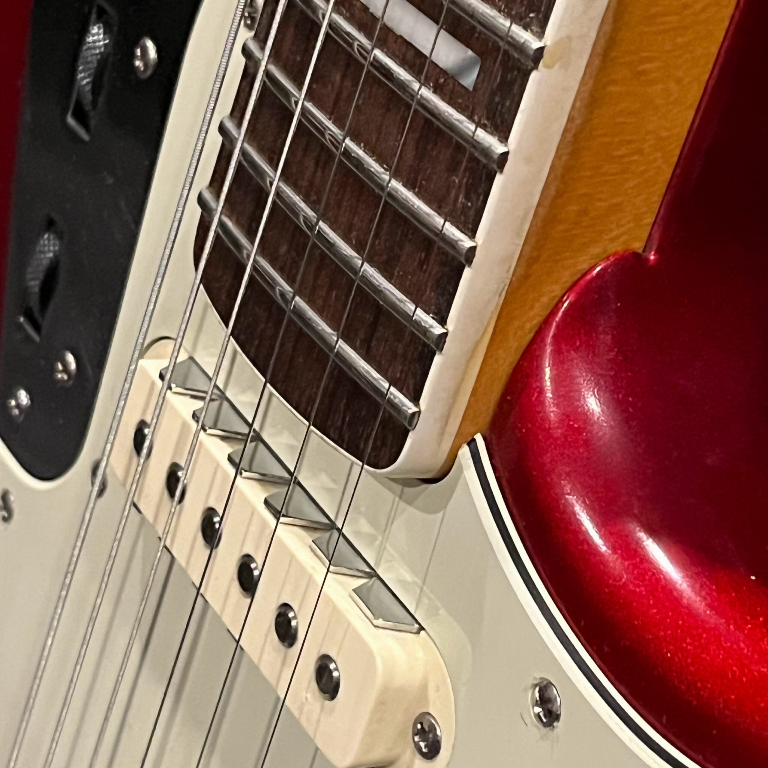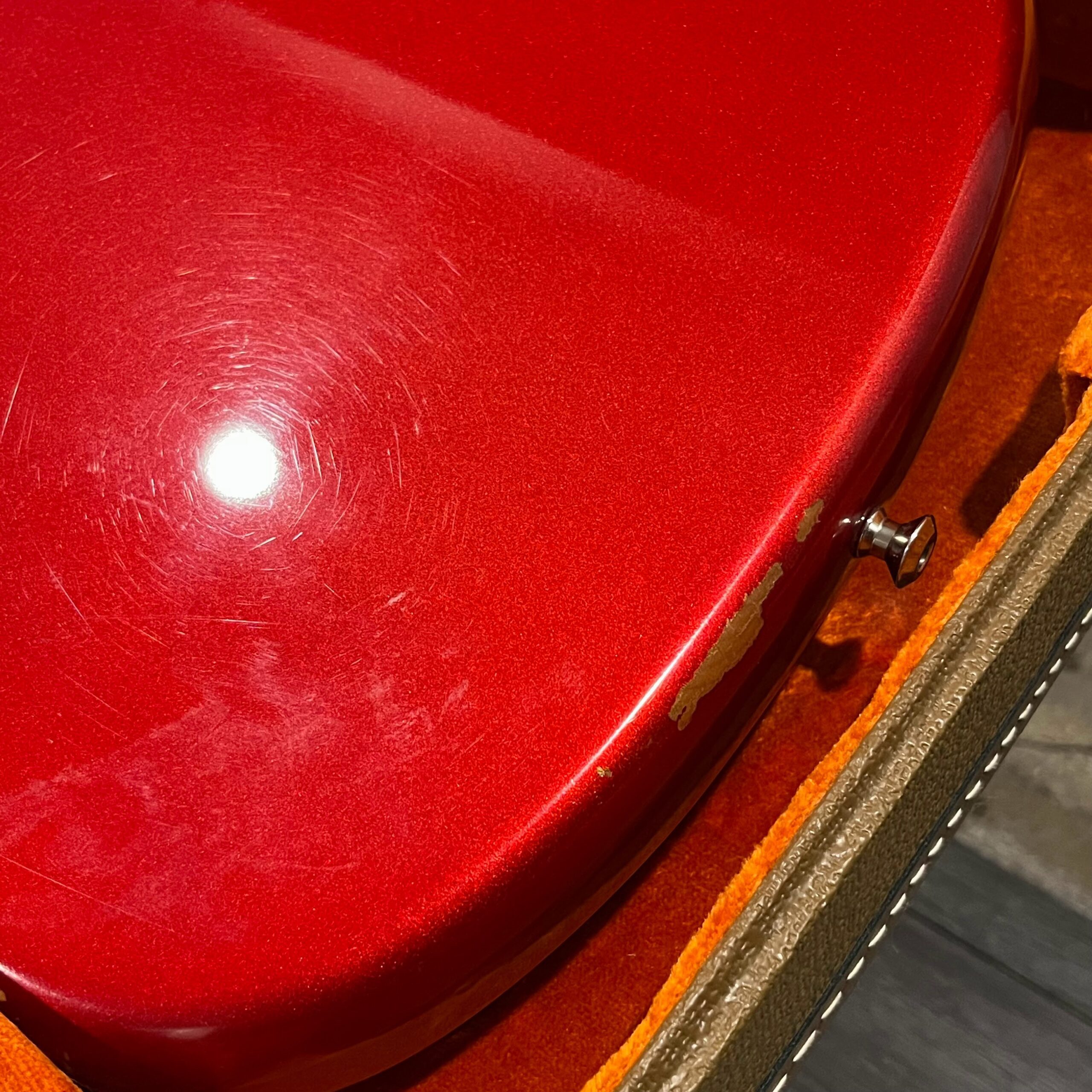 The guitar is in very good, mostly stock condition and is mechanically excellent. Modified with a Mustang style bridge and straplocks. The nitro on the body shows signs of wear, shows missing flakes of the red overcoat on the sides and lower bout, one or two chips on the back as well as swirls, hazing, scratches and impressions. The full spectrum of aging nitro sins – looks great, feels excellent. The first few of every color were hand-numbered, this one is lucky number 7. Frets just leveled, crowned and polished by the pros at Eric’s Guitar Shop in Van Nuys, CA. Lots more pictures of this one at my site which Reverb doesn’t want me to link to, but if you put a dotcom behind my shop name, you’d already be there. See the pictures, ask for more.