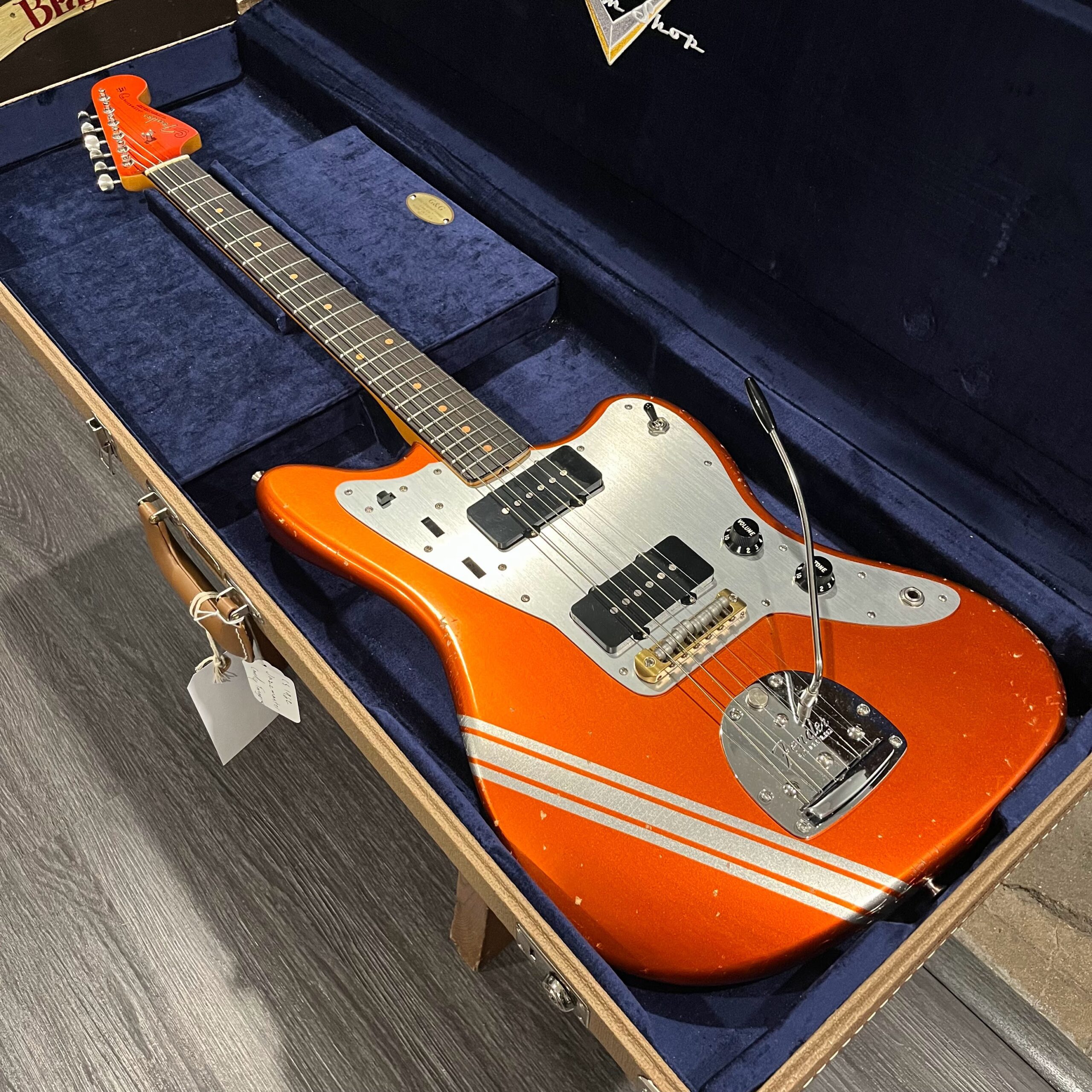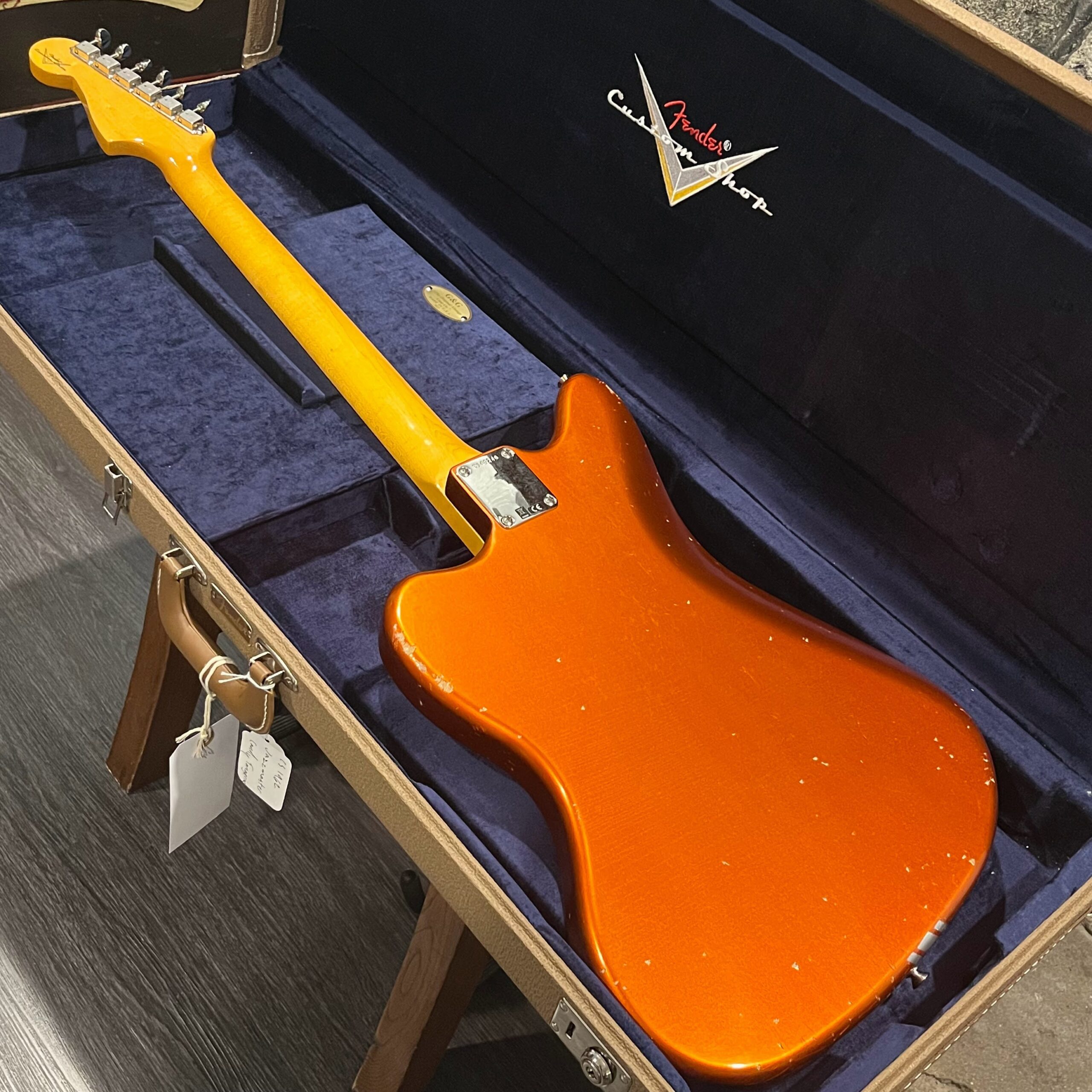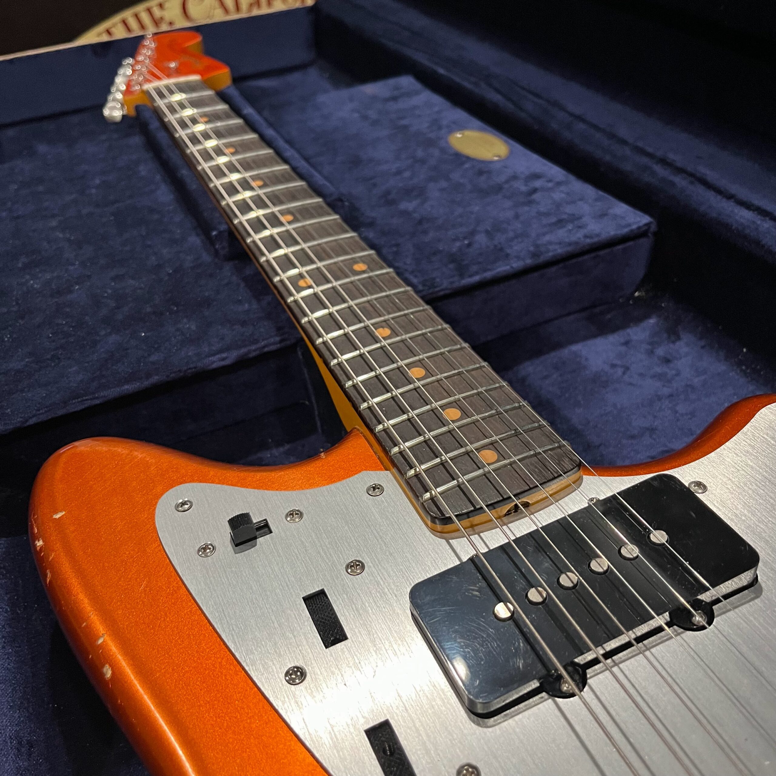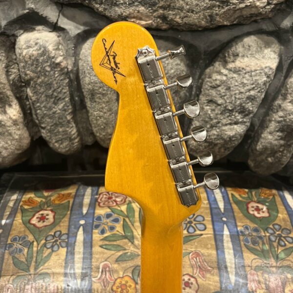 This is the neck with matched headstock, electronics and wiring, hardware from a 2025 JM-62 Fender Custom Shop instrument added to an aftermarket MJT relic competition body. Standard scale, 21 vintage style frets, dark rosewood fretboard with vintage style clay dot markers. The bridge has been replaced with a Bensonite high end aftermarket bridge in the correct 9.5″ radius finished in brushed metal and raw brass. Black pickup covers and switch tip, lead and rhythm circuits, vintage style Fender witch hat knobs, vintage tuners, stock AVRI style Fender reissue tremolo with a brushed aluminum pickguard. The original Custom Shop neck plate holds it all together. Comes in the original Custom Shop case with all papers, tools, floor traveler, strap and all other ephemera from the Fender Custom Shop in Corona, California. Weighs 8lb 2oz, setup on 10s.