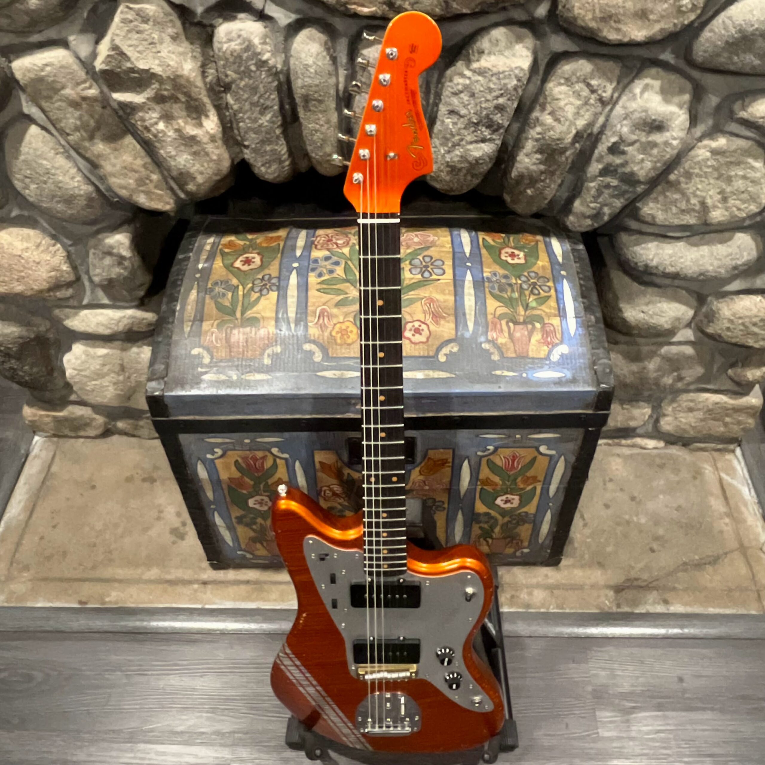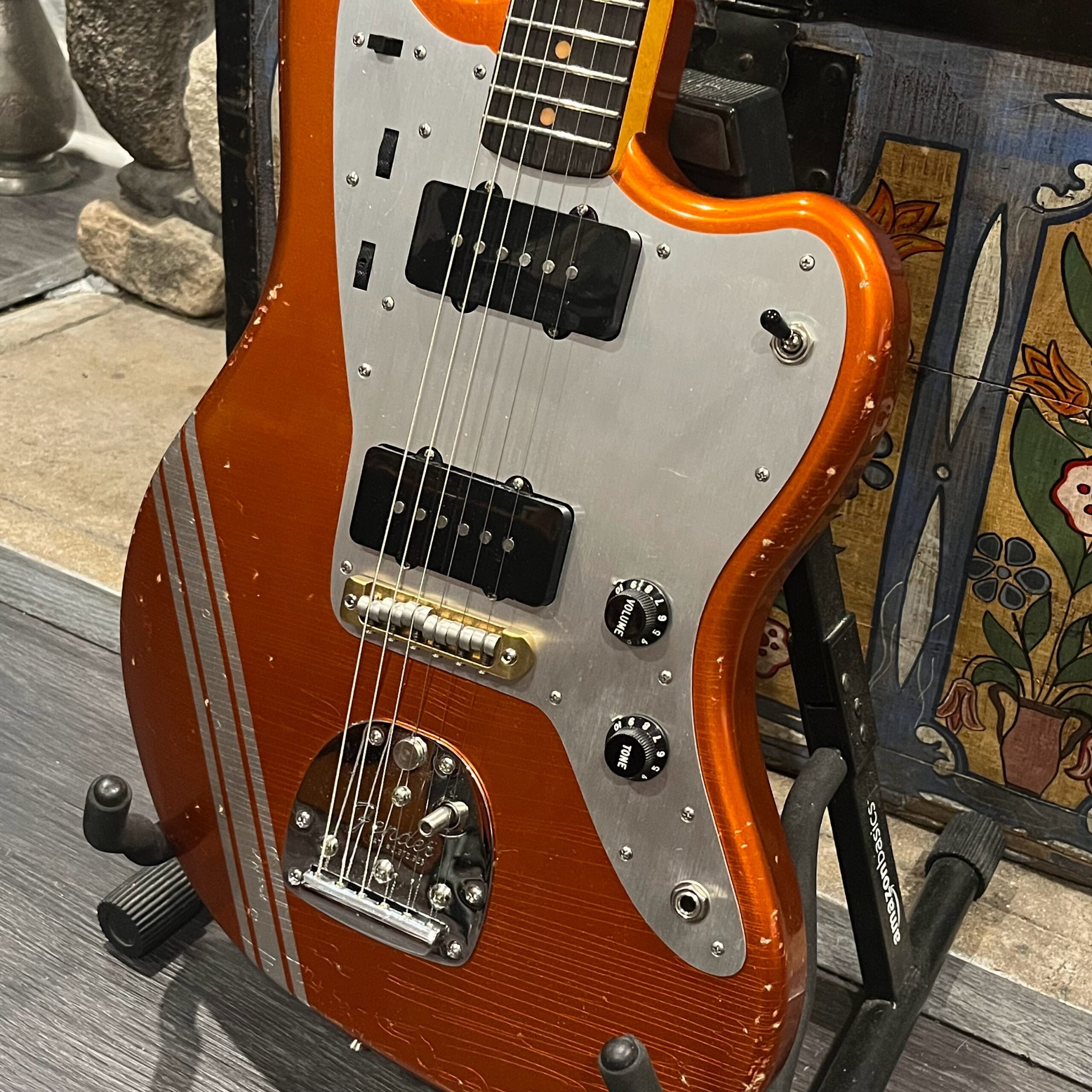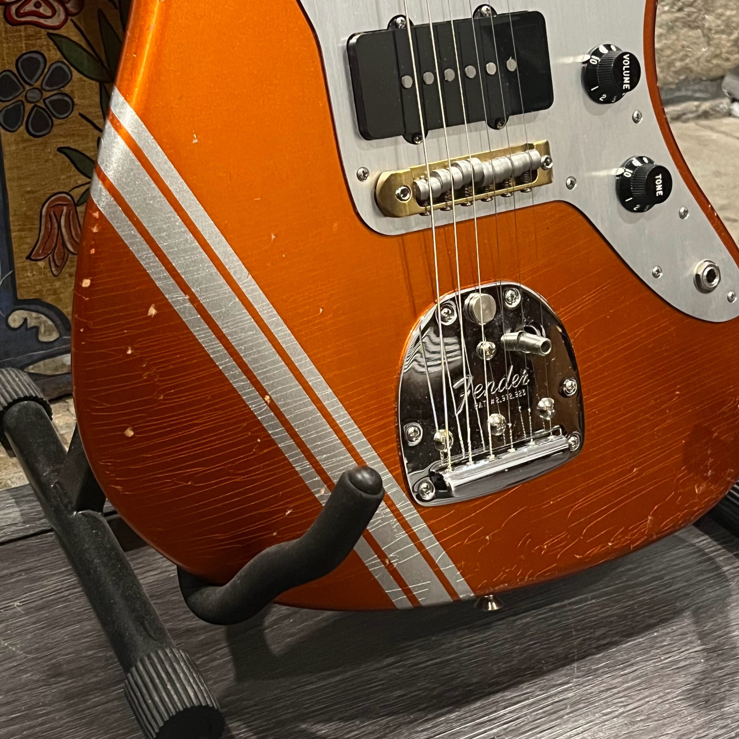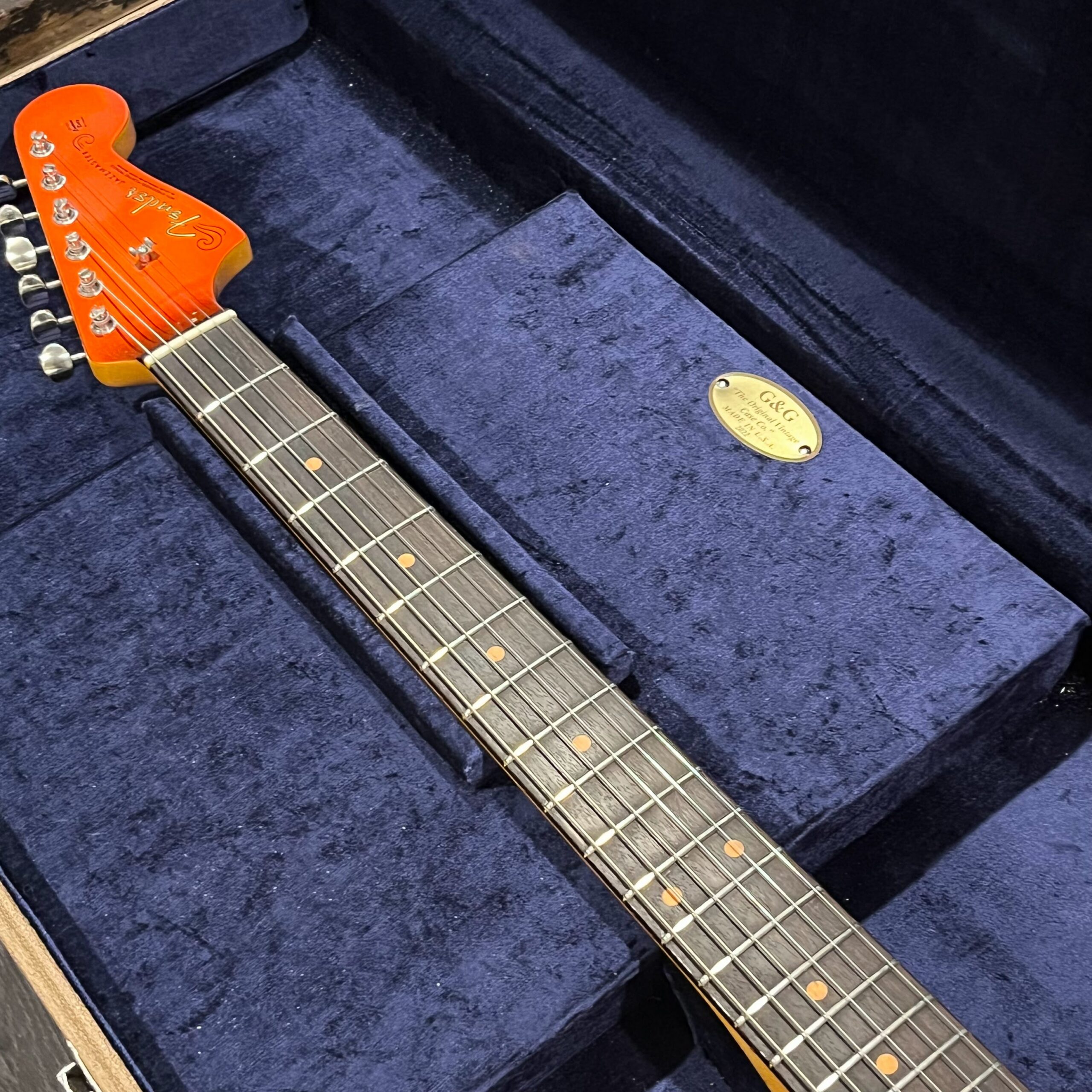 This is the neck with matched headstock, electronics and wiring, hardware from a 2025 JM-62 Fender Custom Shop instrument added to an aftermarket MJT relic competition body. Standard scale, 21 vintage style frets, dark rosewood fretboard with vintage style clay dot markers. The bridge has been replaced with a Bensonite high end aftermarket bridge in the correct 9.5″ radius finished in brushed metal and raw brass. Black pickup covers and switch tip, lead and rhythm circuits, vintage style Fender witch hat knobs, vintage tuners, stock AVRI style Fender reissue tremolo with a brushed aluminum pickguard. The original Custom Shop neck plate holds it all together. Comes in the original Custom Shop case with all papers, tools, floor traveler, strap and all other ephemera from the Fender Custom Shop in Corona, California. Weighs 8lb 2oz, setup on 10s.