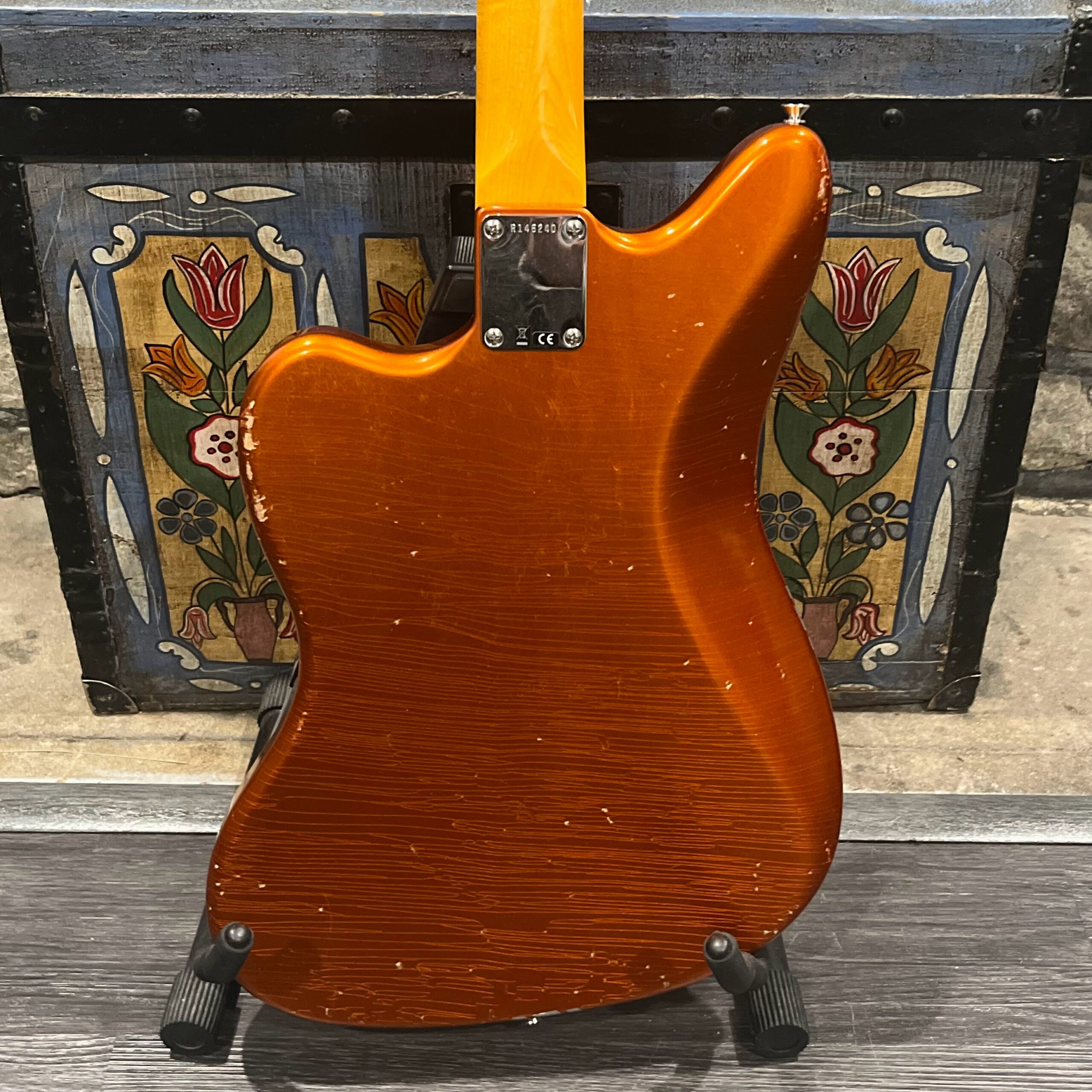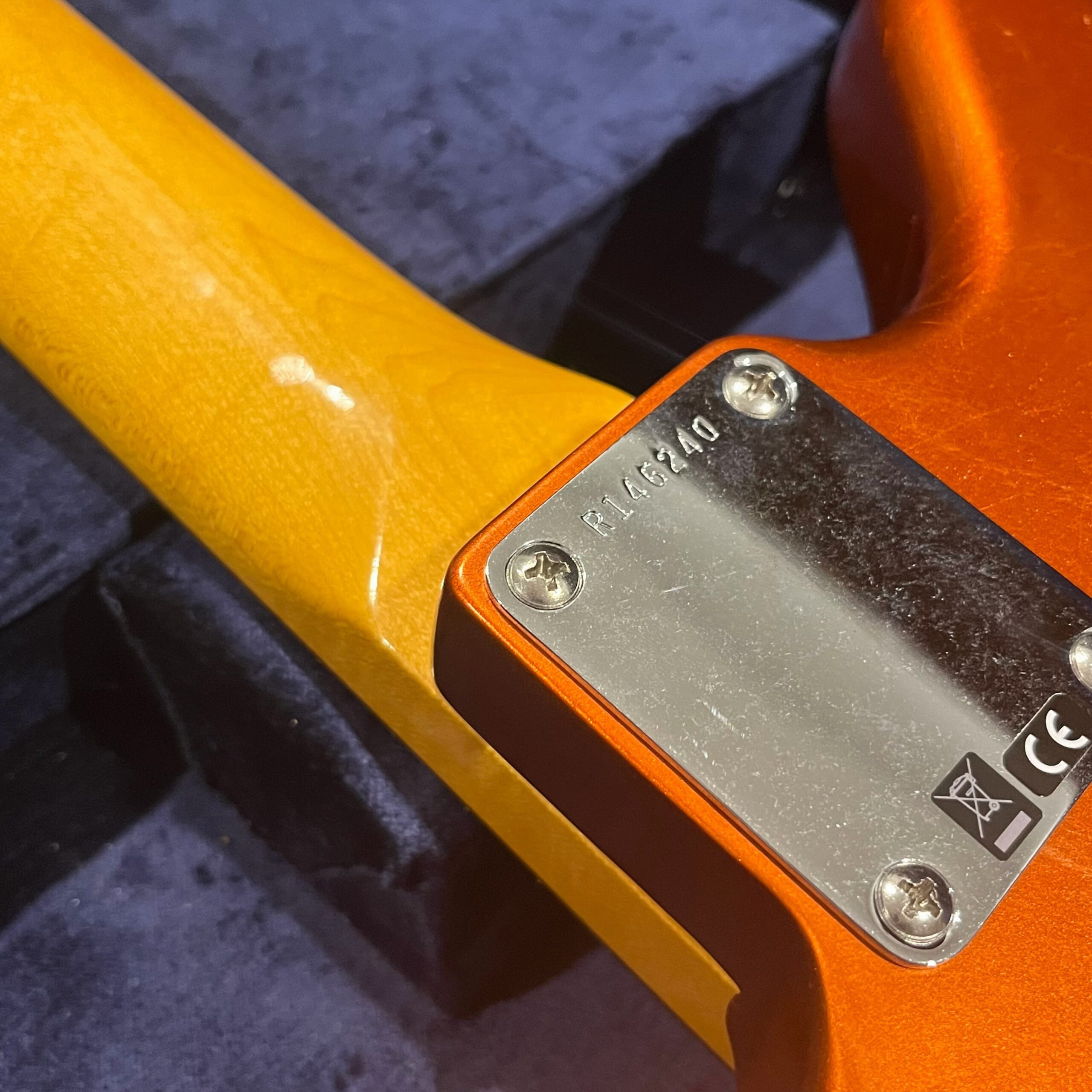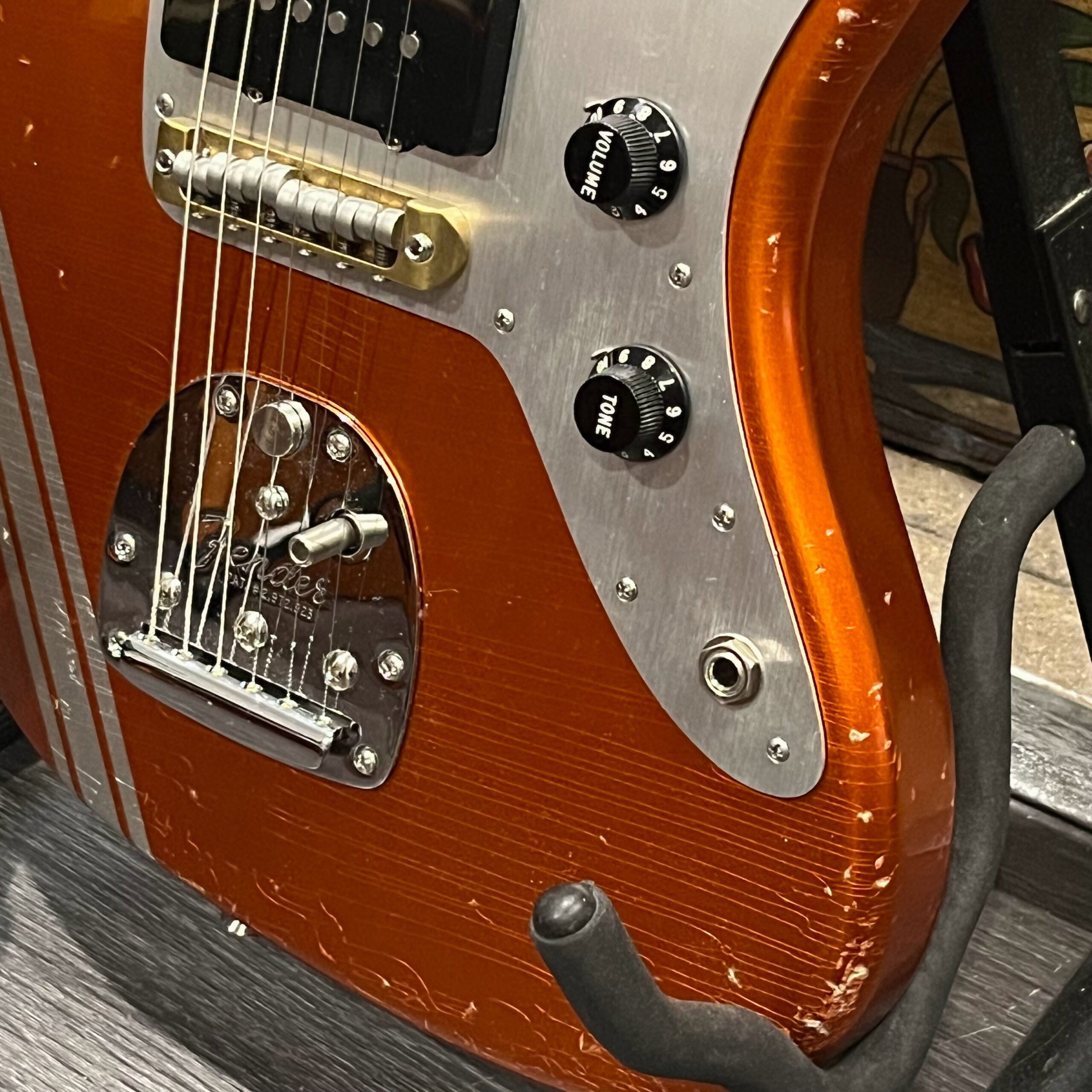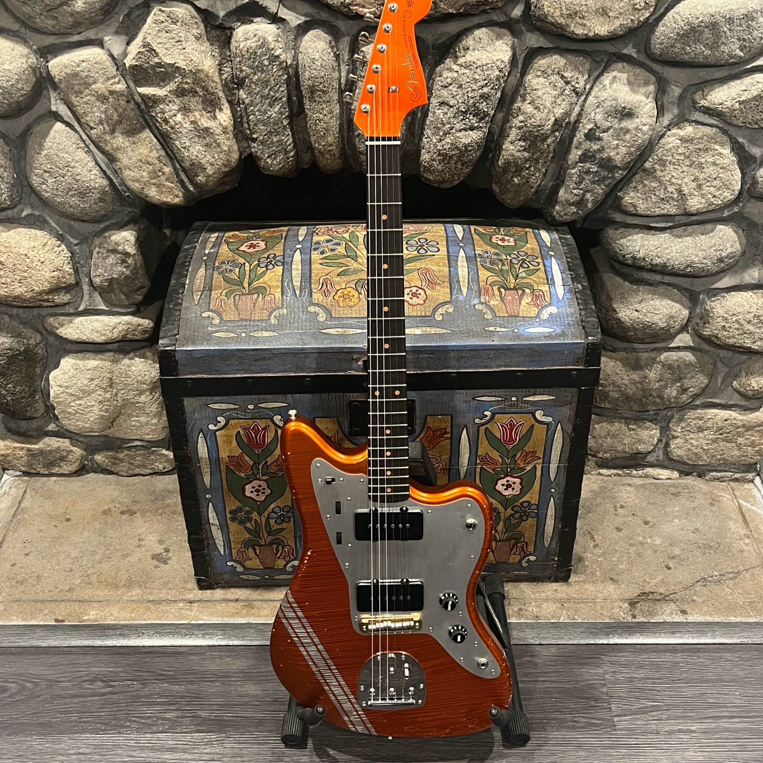 This is the neck with matched headstock, electronics and wiring, hardware from a 2025 JM-62 Fender Custom Shop instrument added to an aftermarket MJT relic competition body. Standard scale, 21 vintage style frets, dark rosewood fretboard with vintage style clay dot markers. The bridge has been replaced with a Bensonite high end aftermarket bridge in the correct 9.5″ radius finished in brushed metal and raw brass. Black pickup covers and switch tip, lead and rhythm circuits, vintage style Fender witch hat knobs, vintage tuners, stock AVRI style Fender reissue tremolo with a brushed aluminum pickguard. The original Custom Shop neck plate holds it all together. Comes in the original Custom Shop case with all papers, tools, floor traveler, strap and all other ephemera from the Fender Custom Shop in Corona, California. Weighs 8lb 2oz, setup on 10s.