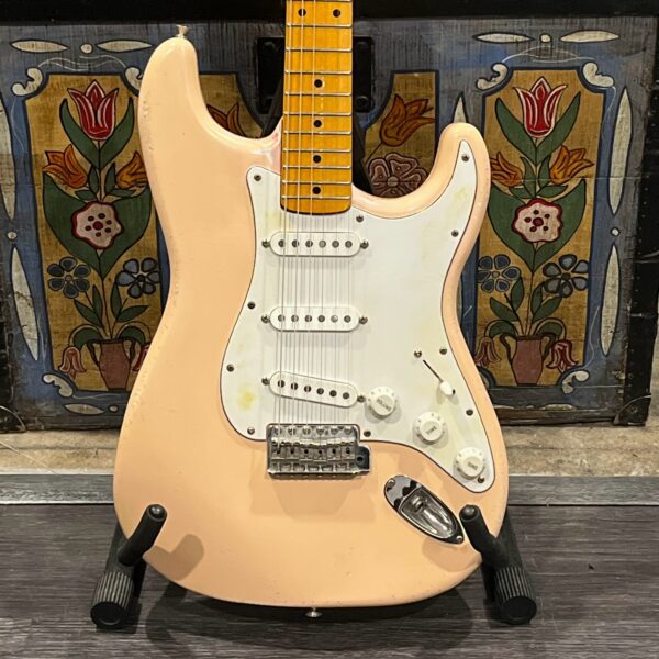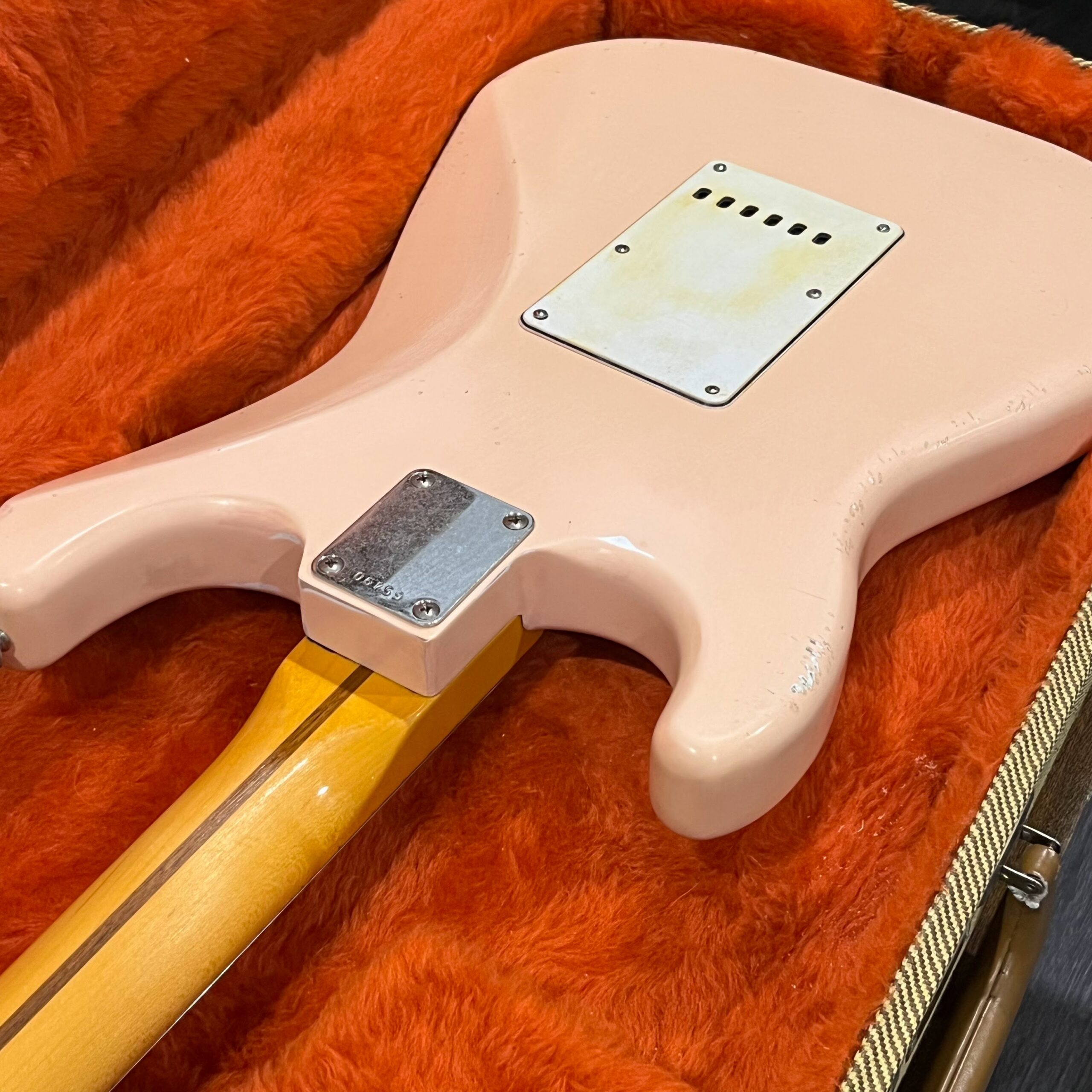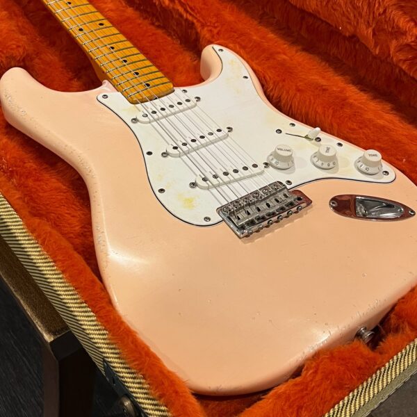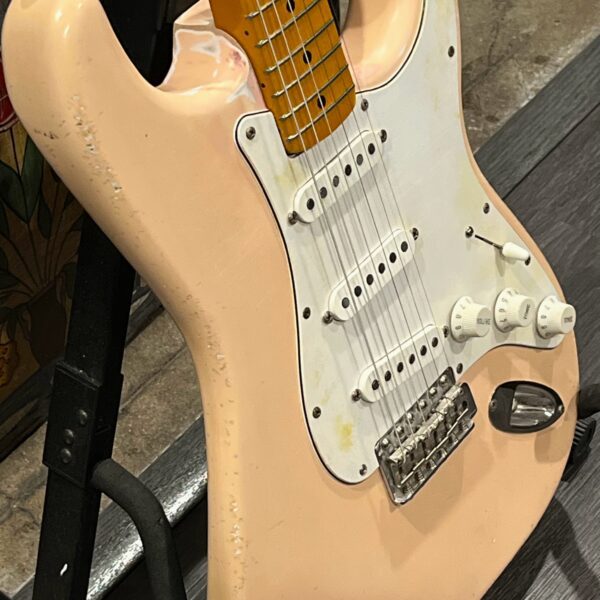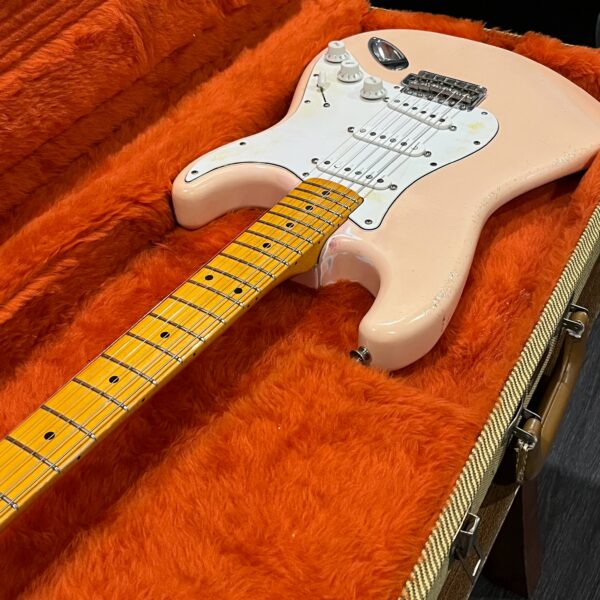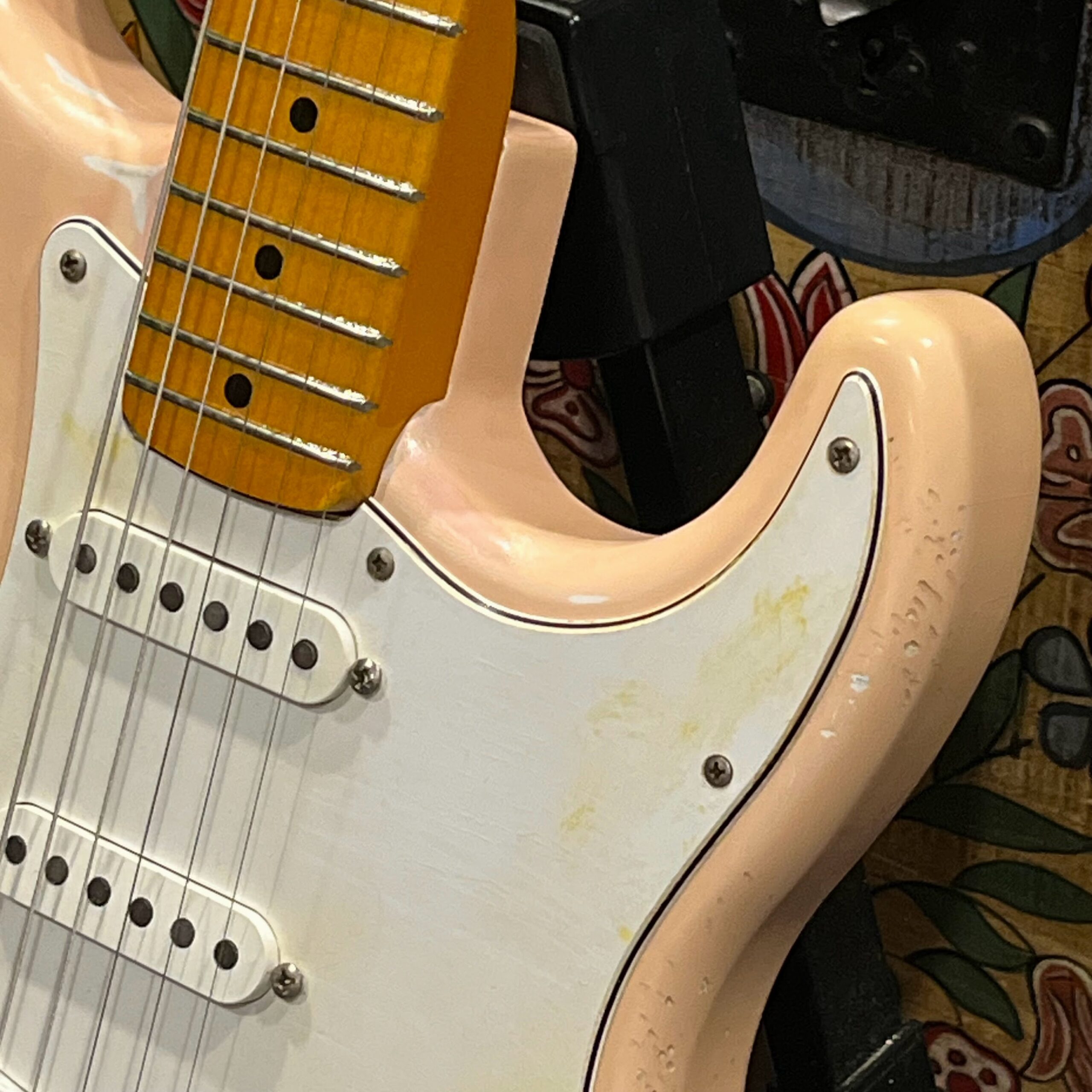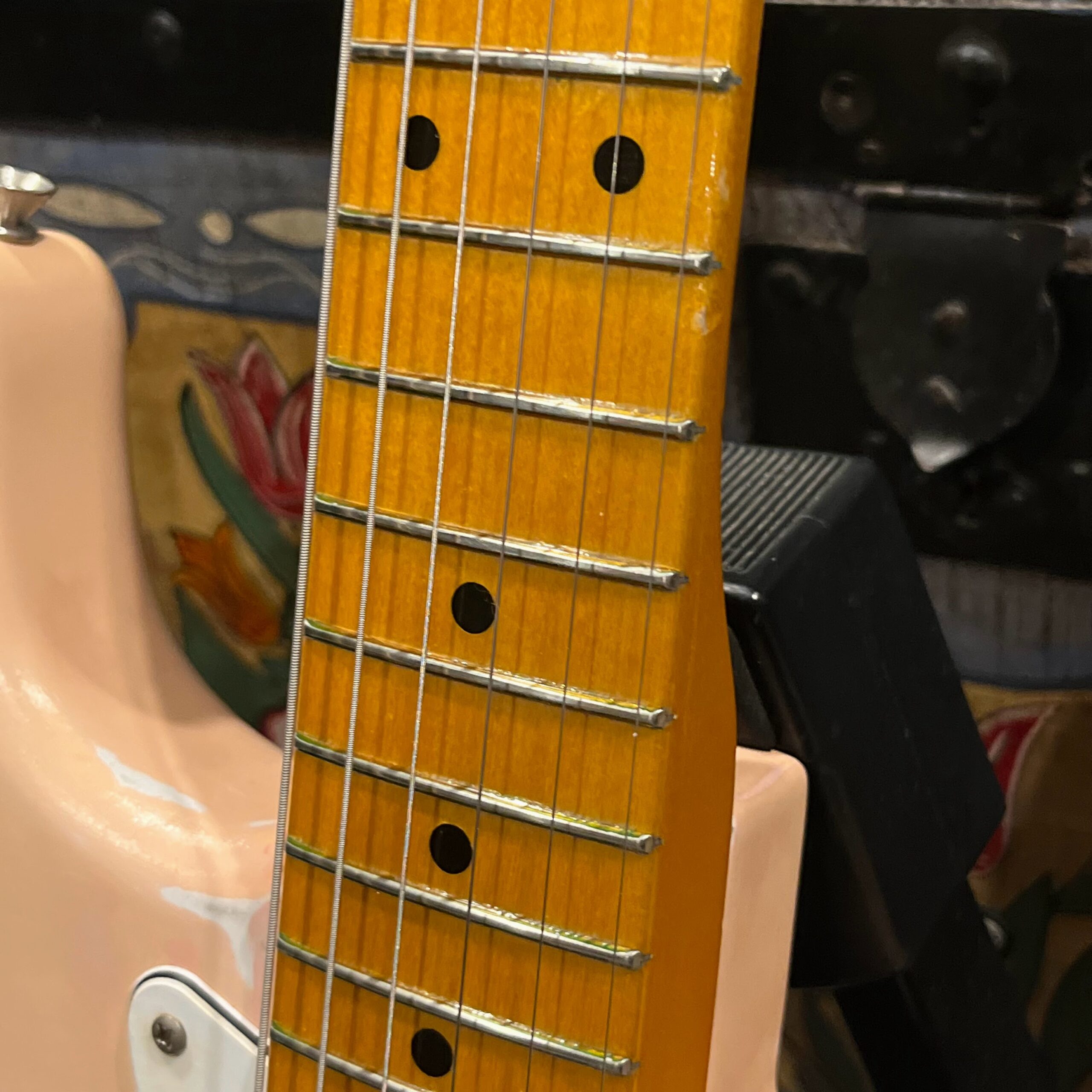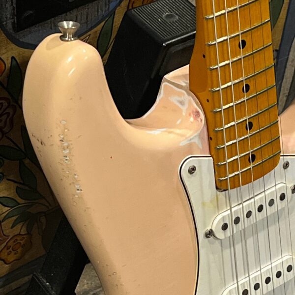 The star of this show is the lacquer nitro maple neck from a 2024 Fender USA 1954 Anniversary Stratocaster with a 7.25″ radius, a C shape profile, and 21 frets, with a maple fretboard and all vintage appointments including Telecaster style string-tree added to a relic MJT Stratocaster faded Coral Pink body with an aged Fender 11-hole 3-ply W/B/W pickguard and a set of vintage 1984 Fender Japan single coil pickups in a SSS configuration with all wiring upgraded to vintage cloth type with Orange Drop capacitor and a 5-way switch. All the hardware is now vintage from the donor ST-57 made in Fujijen. Comes in an older early 1990s AVRI style case, looking good in there, with a vintage style bridge cover, tremolo arm and keys setup on 10s. Weighs 7lbs and 10oz.
