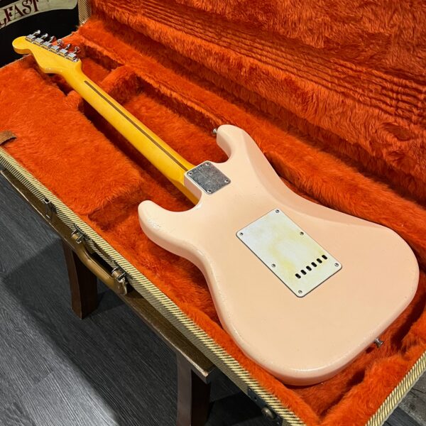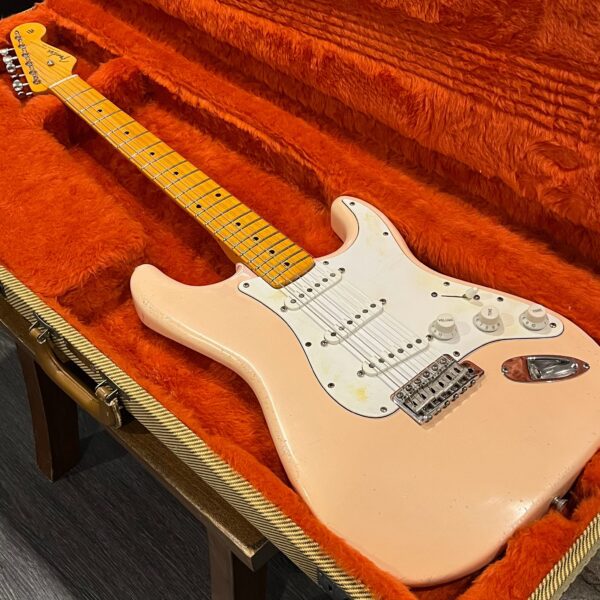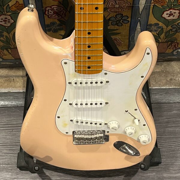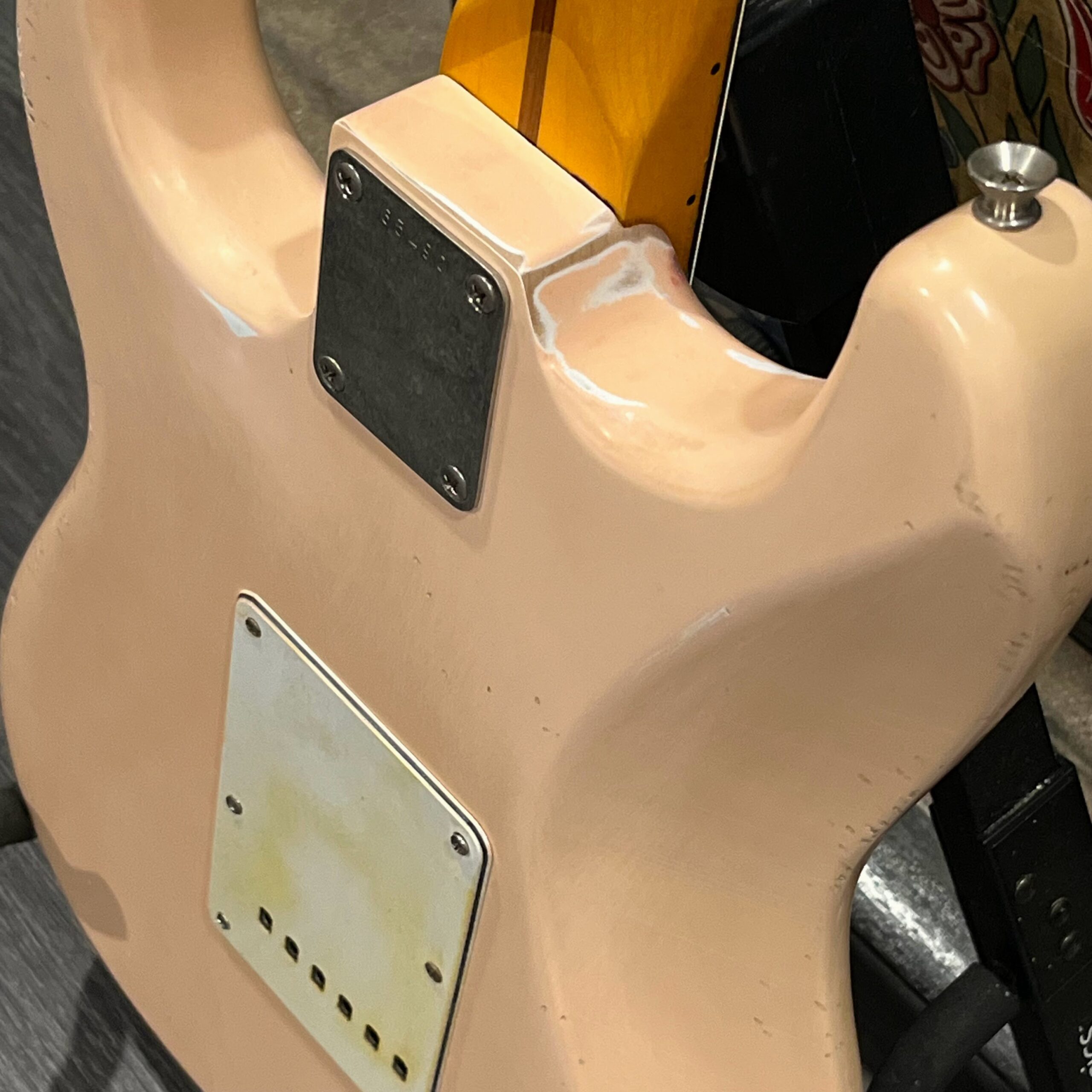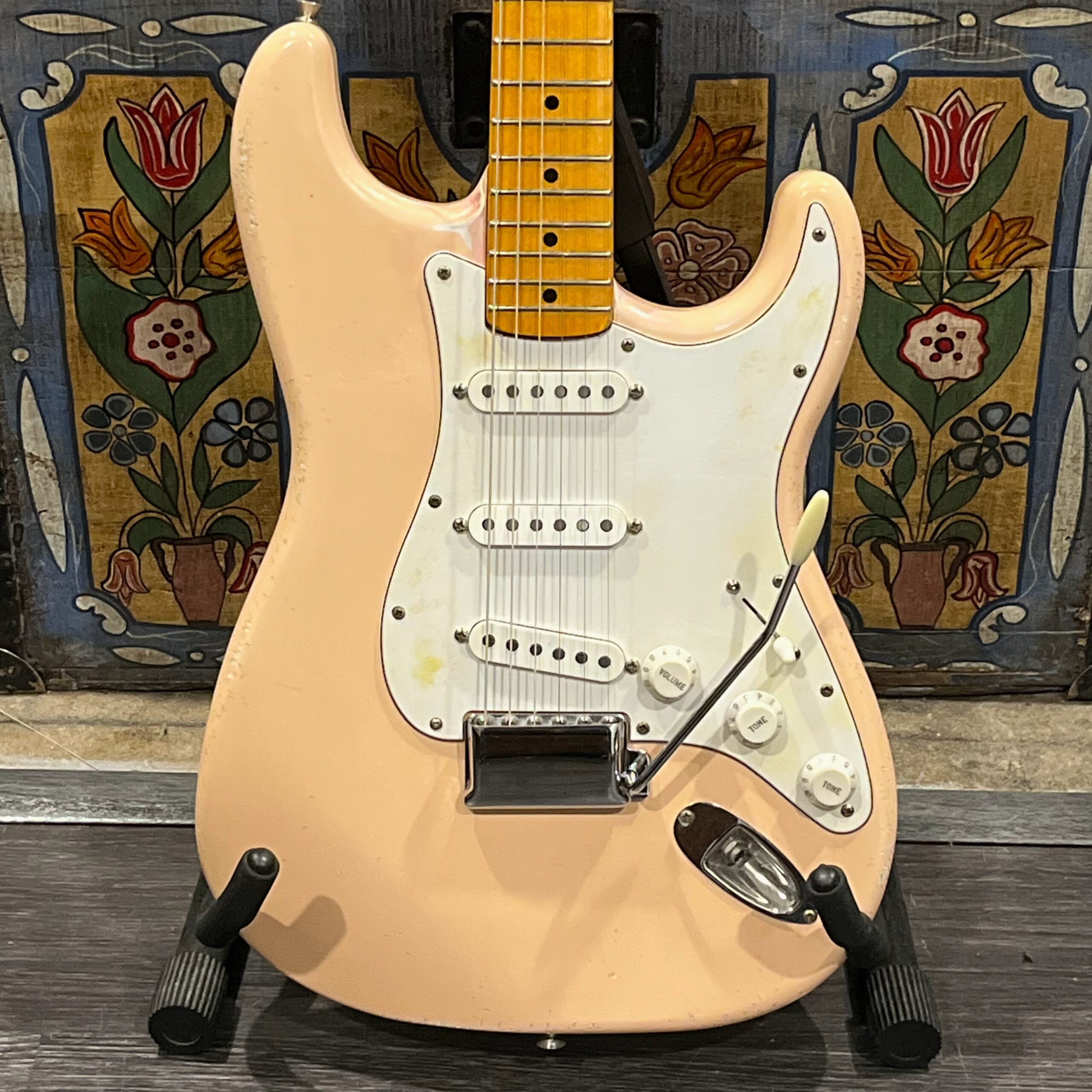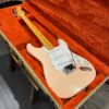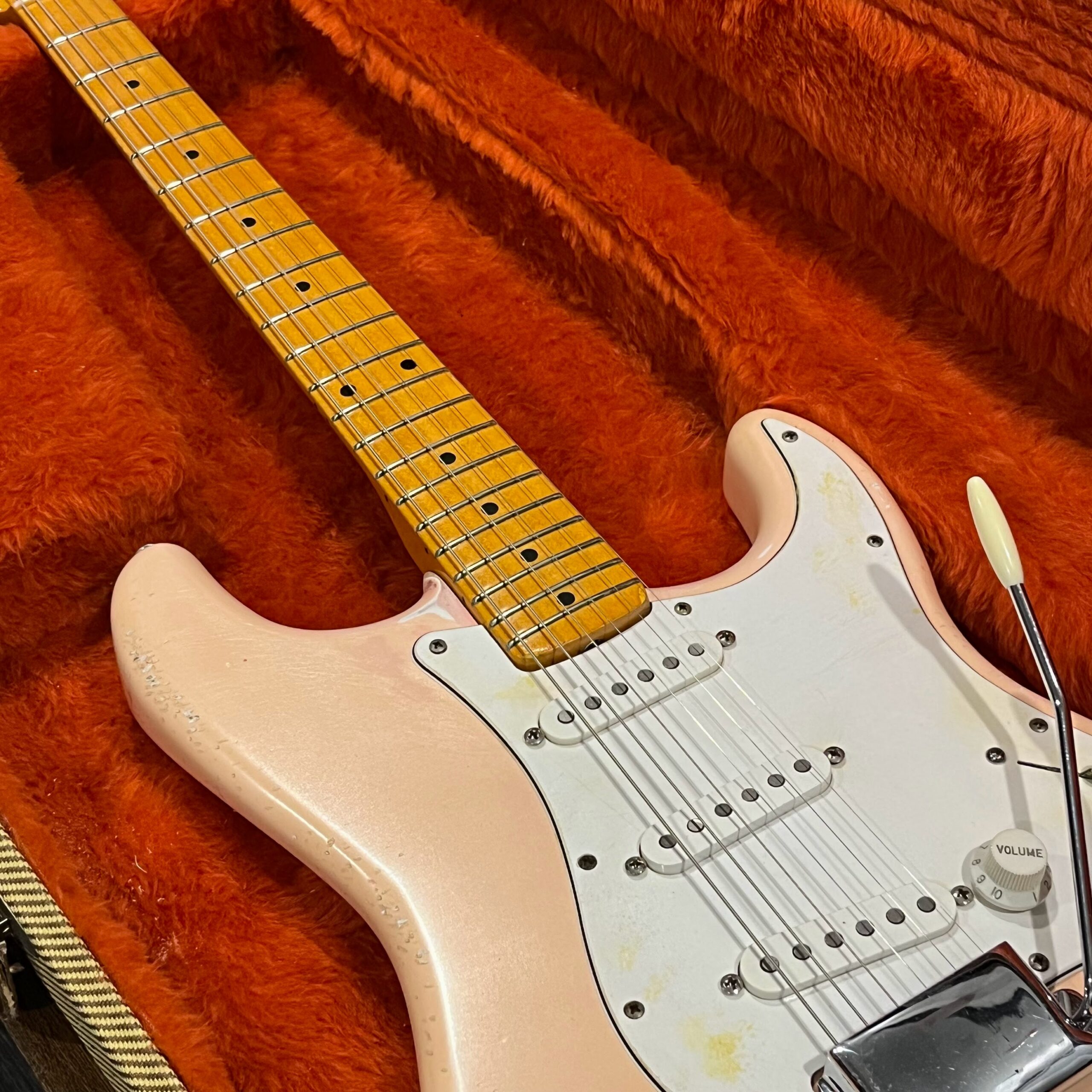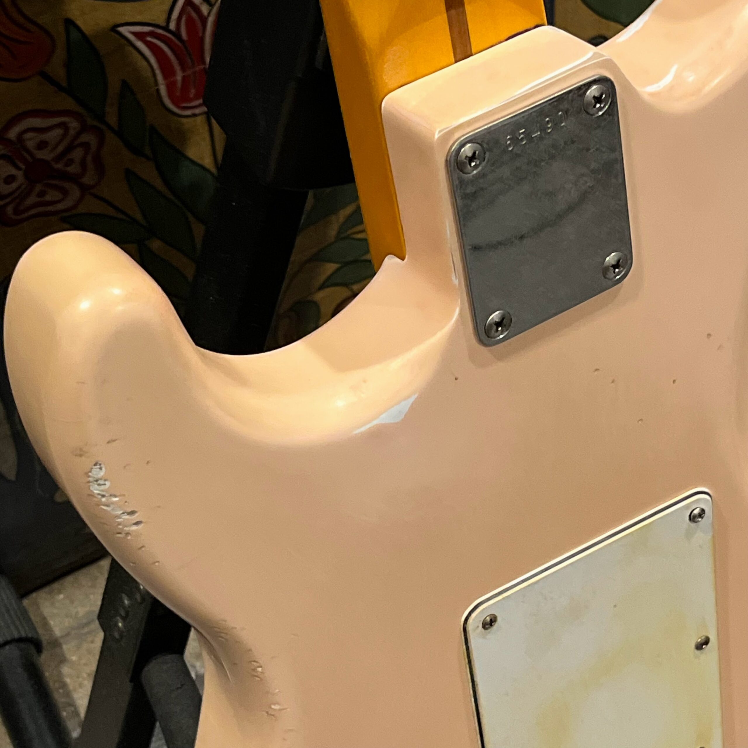 The star of this show is the lacquer nitro maple neck from a 2024 Fender USA 1954 Anniversary Stratocaster with a 7.25″ radius, a C shape profile, and 21 frets, with a maple fretboard and all vintage appointments including Telecaster style string-tree added to a relic MJT Stratocaster faded Coral Pink body with an aged Fender 11-hole 3-ply W/B/W pickguard and a set of vintage 1984 Fender Japan single coil pickups in a SSS configuration with all wiring upgraded to vintage cloth type with Orange Drop capacitor and a 5-way switch. All the hardware is now vintage from the donor ST-57 made in Fujijen. Comes in an older early 1990s AVRI style case, looking good in there, with a vintage style bridge cover, tremolo arm and keys setup on 10s. Weighs 7lbs and 10oz.