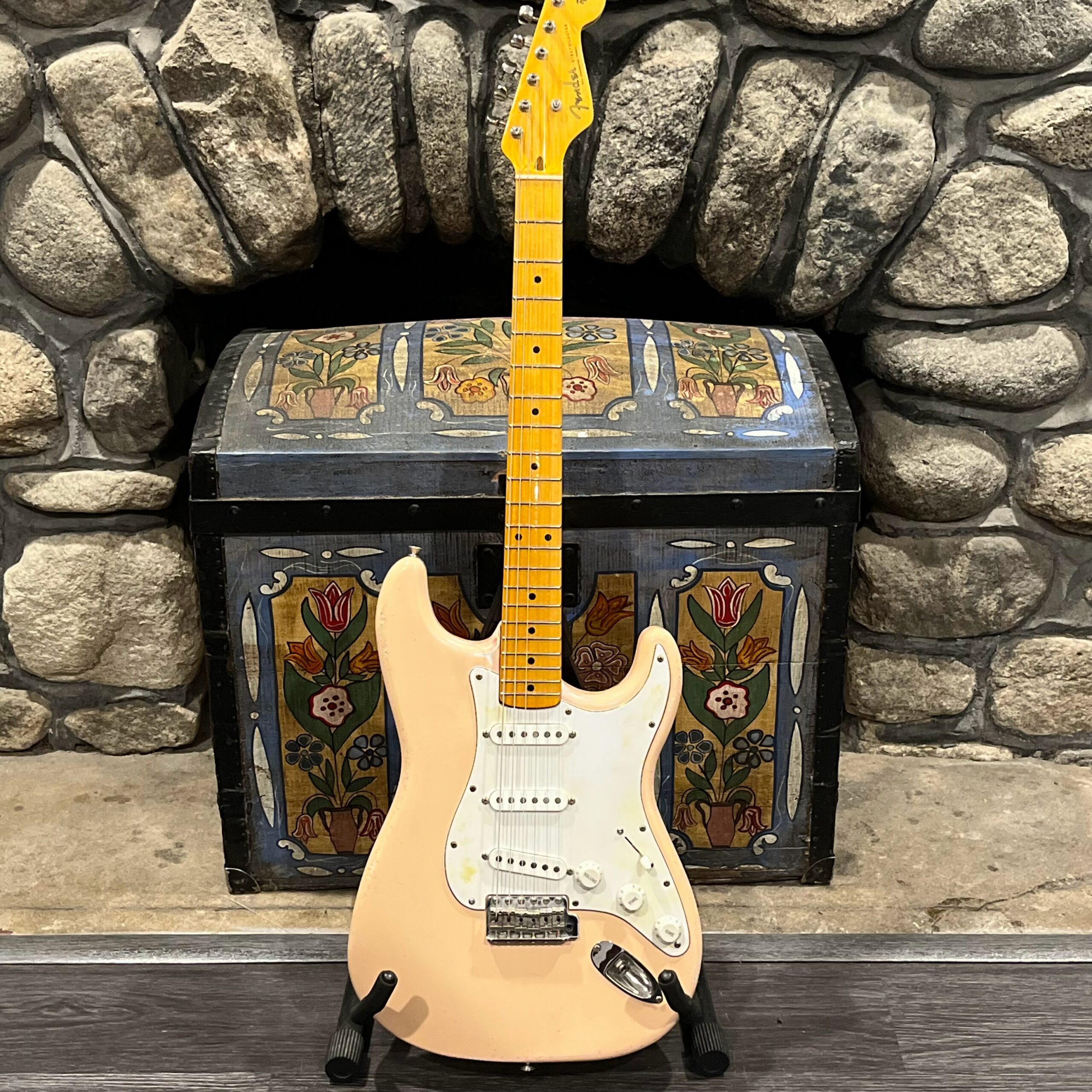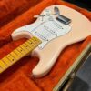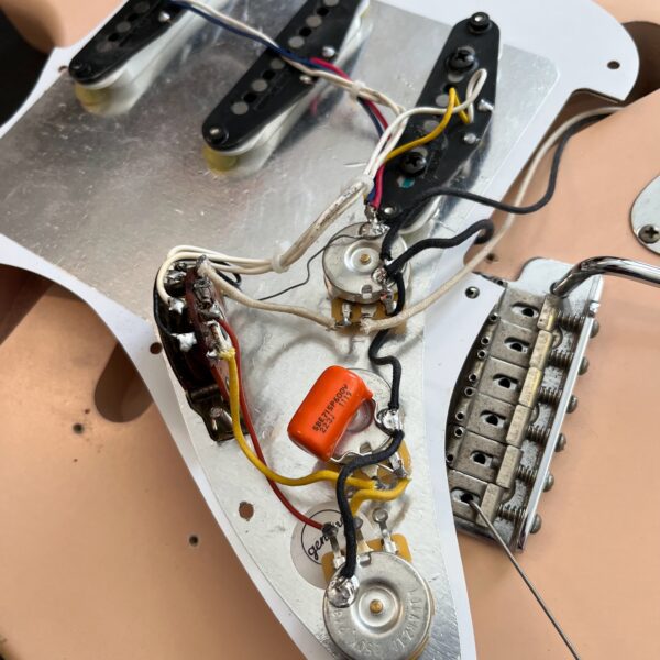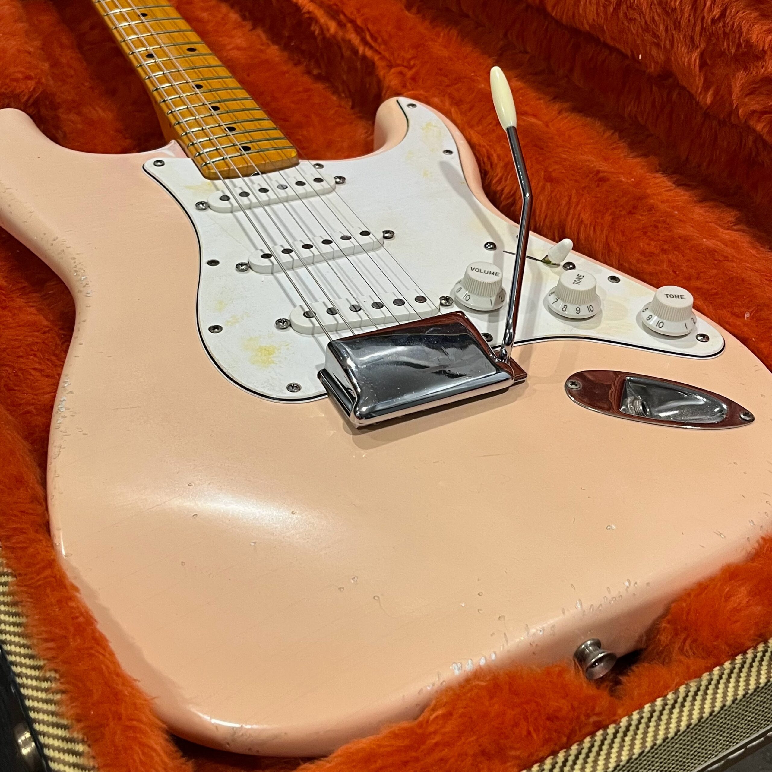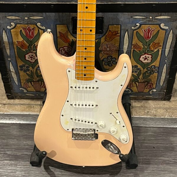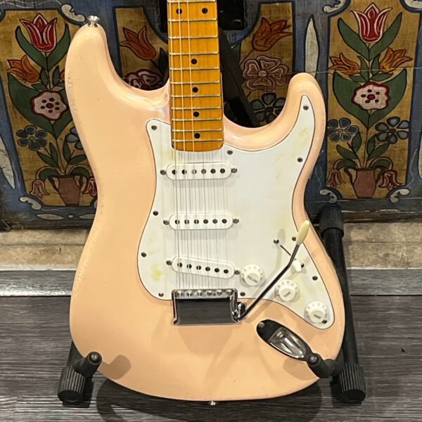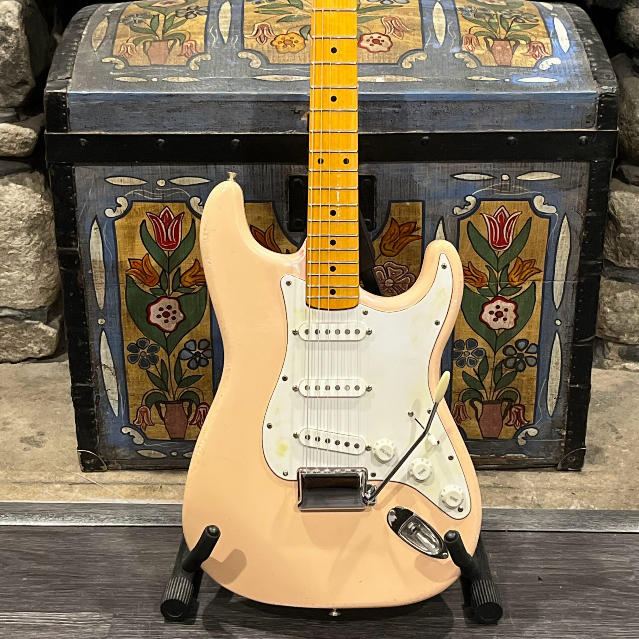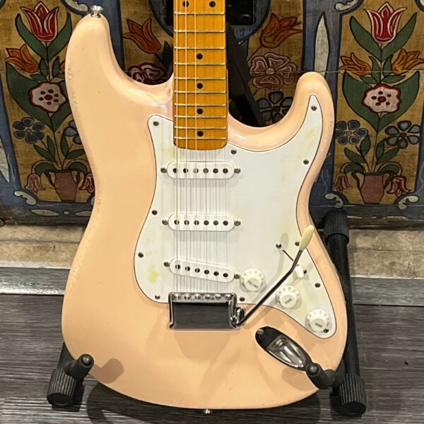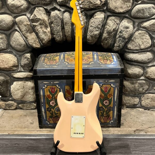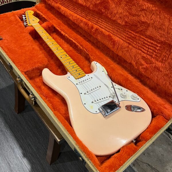 The star of this show is the lacquer nitro maple neck from a 2024 Fender USA 1954 Anniversary Stratocaster with a 7.25″ radius, a C shape profile, and 21 frets, with a maple fretboard and all vintage appointments including Telecaster style string-tree added to a relic MJT Stratocaster faded Coral Pink body with an aged Fender 11-hole 3-ply W/B/W pickguard and a set of vintage 1984 Fender Japan single coil pickups in a SSS configuration with all wiring upgraded to vintage cloth type with Orange Drop capacitor and a 5-way switch. All the hardware is now vintage from the donor ST-57 made in Fujijen. Comes in an older early 1990s AVRI style case, looking good in there, with a vintage style bridge cover, tremolo arm and keys setup on 10s. Weighs 7lbs and 10oz.