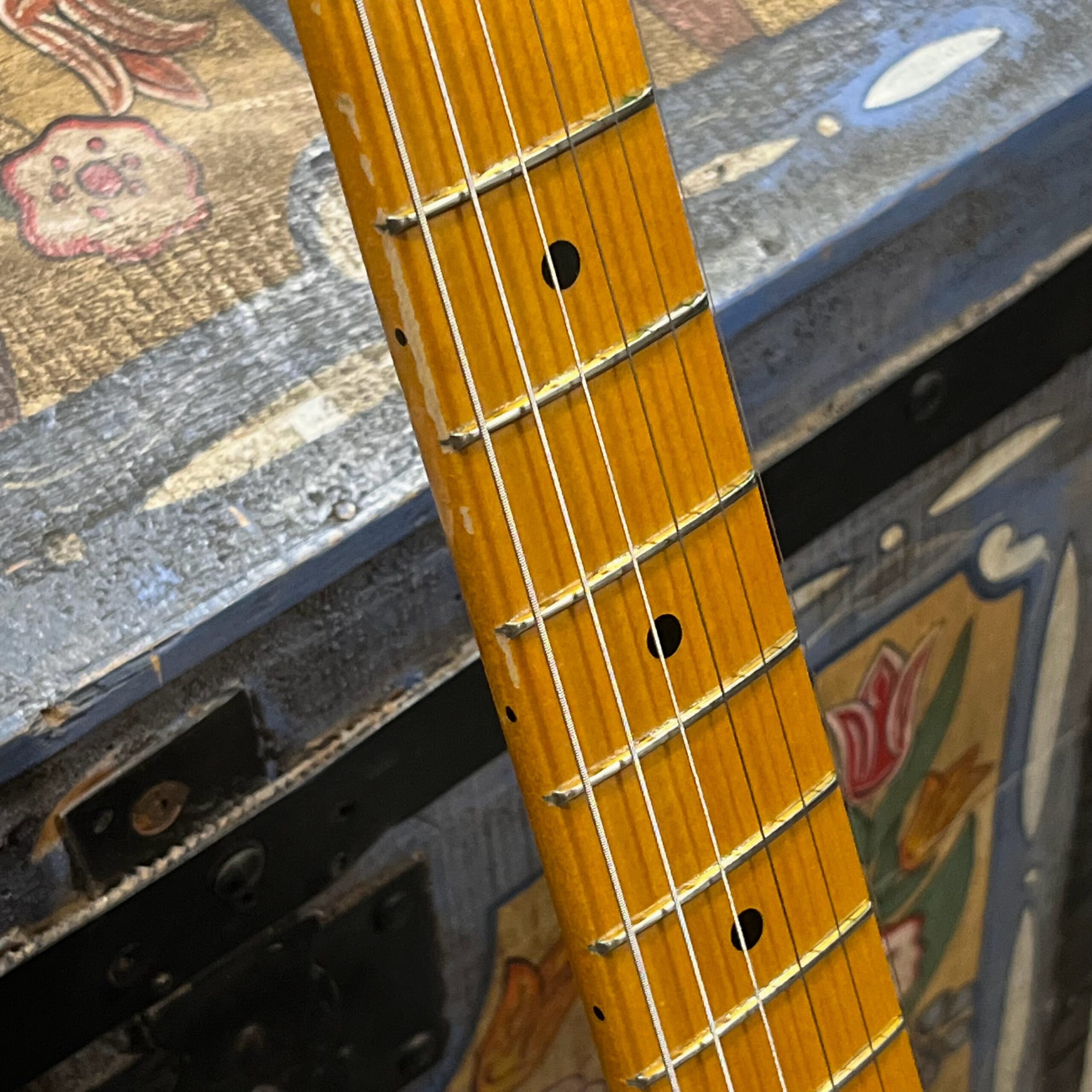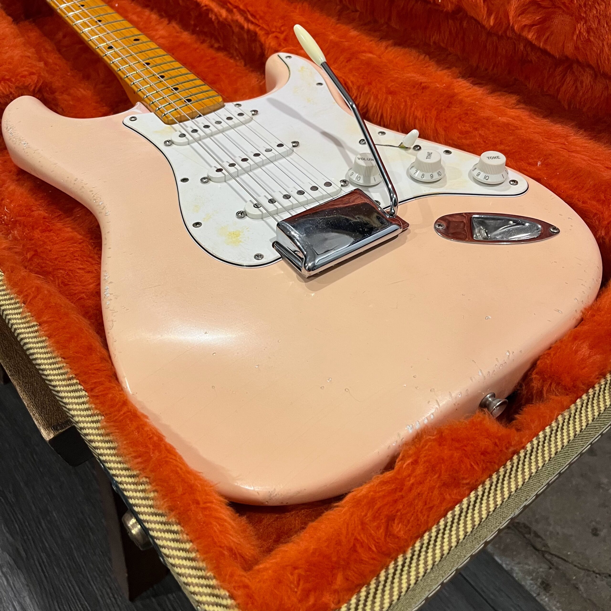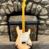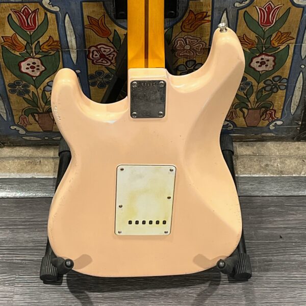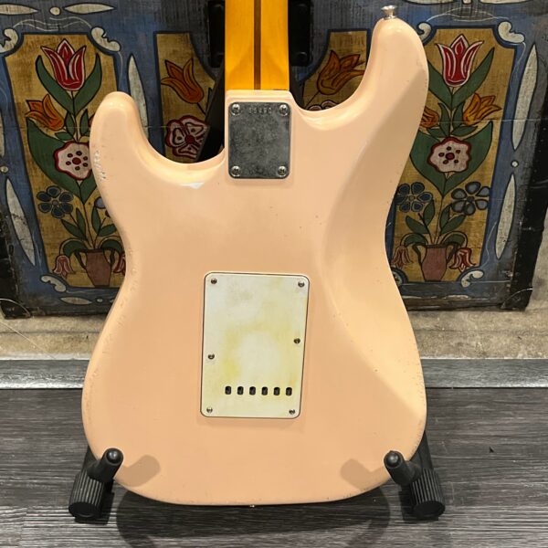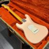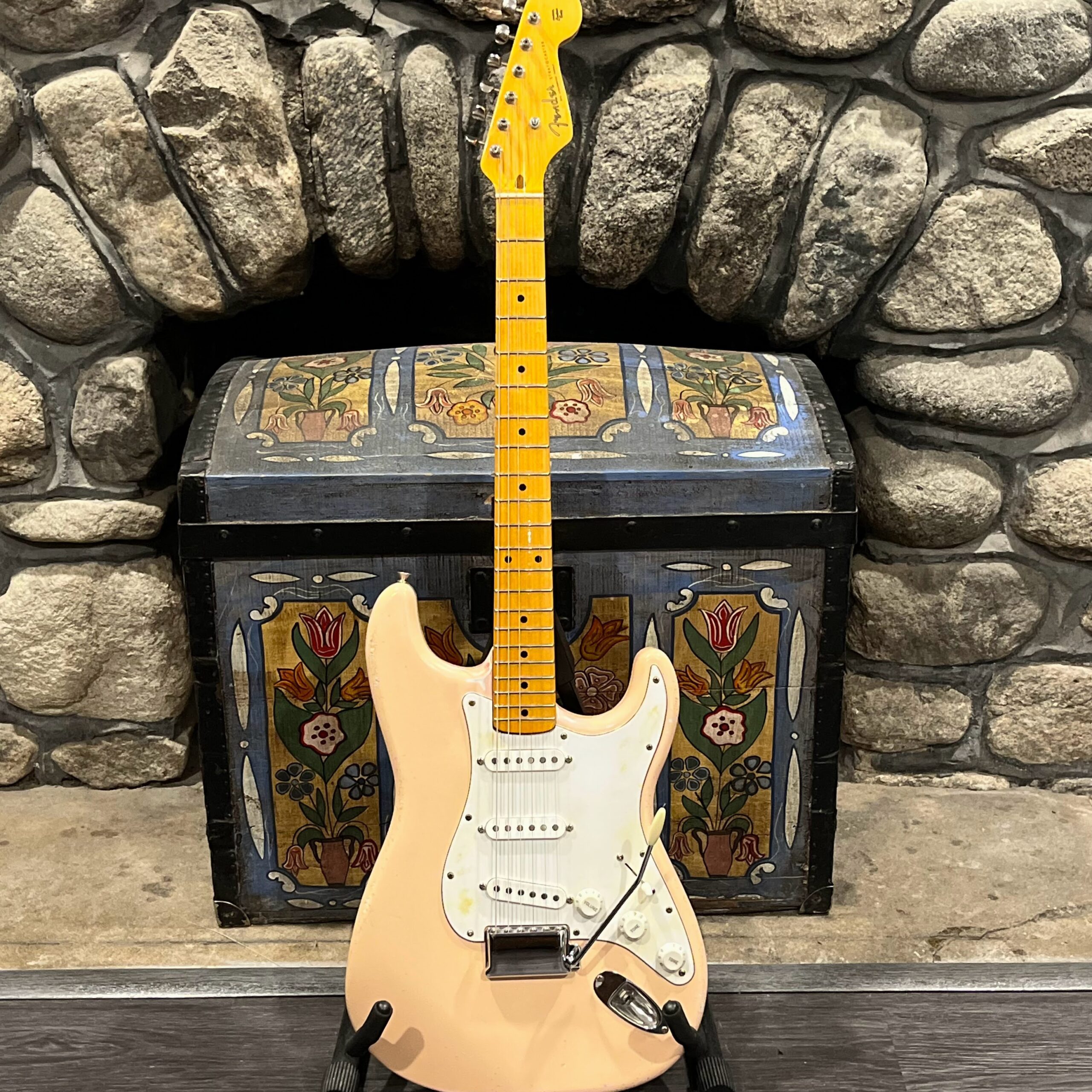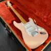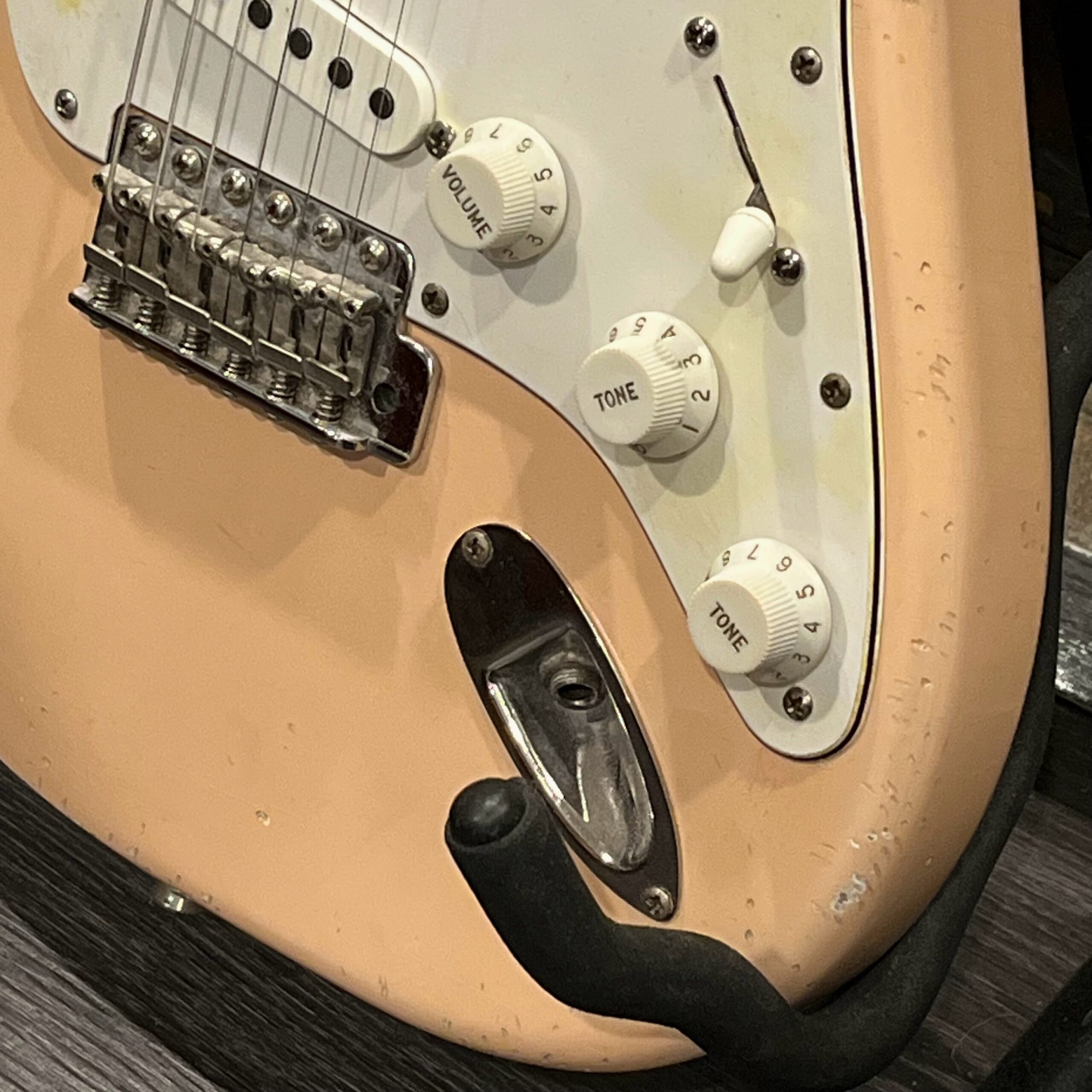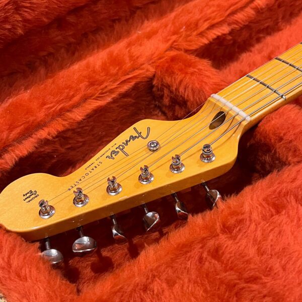 The star of this show is the lacquer nitro maple neck from a 2024 Fender USA 1954 Anniversary Stratocaster with a 7.25″ radius, a C shape profile, and 21 frets, with a maple fretboard and all vintage appointments including Telecaster style string-tree added to a relic MJT Stratocaster faded Coral Pink body with an aged Fender 11-hole 3-ply W/B/W pickguard and a set of vintage 1984 Fender Japan single coil pickups in a SSS configuration with all wiring upgraded to vintage cloth type with Orange Drop capacitor and a 5-way switch. All the hardware is now vintage from the donor ST-57 made in Fujijen. Comes in an older early 1990s AVRI style case, looking good in there, with a vintage style bridge cover, tremolo arm and keys setup on 10s. Weighs 7lbs and 10oz.
