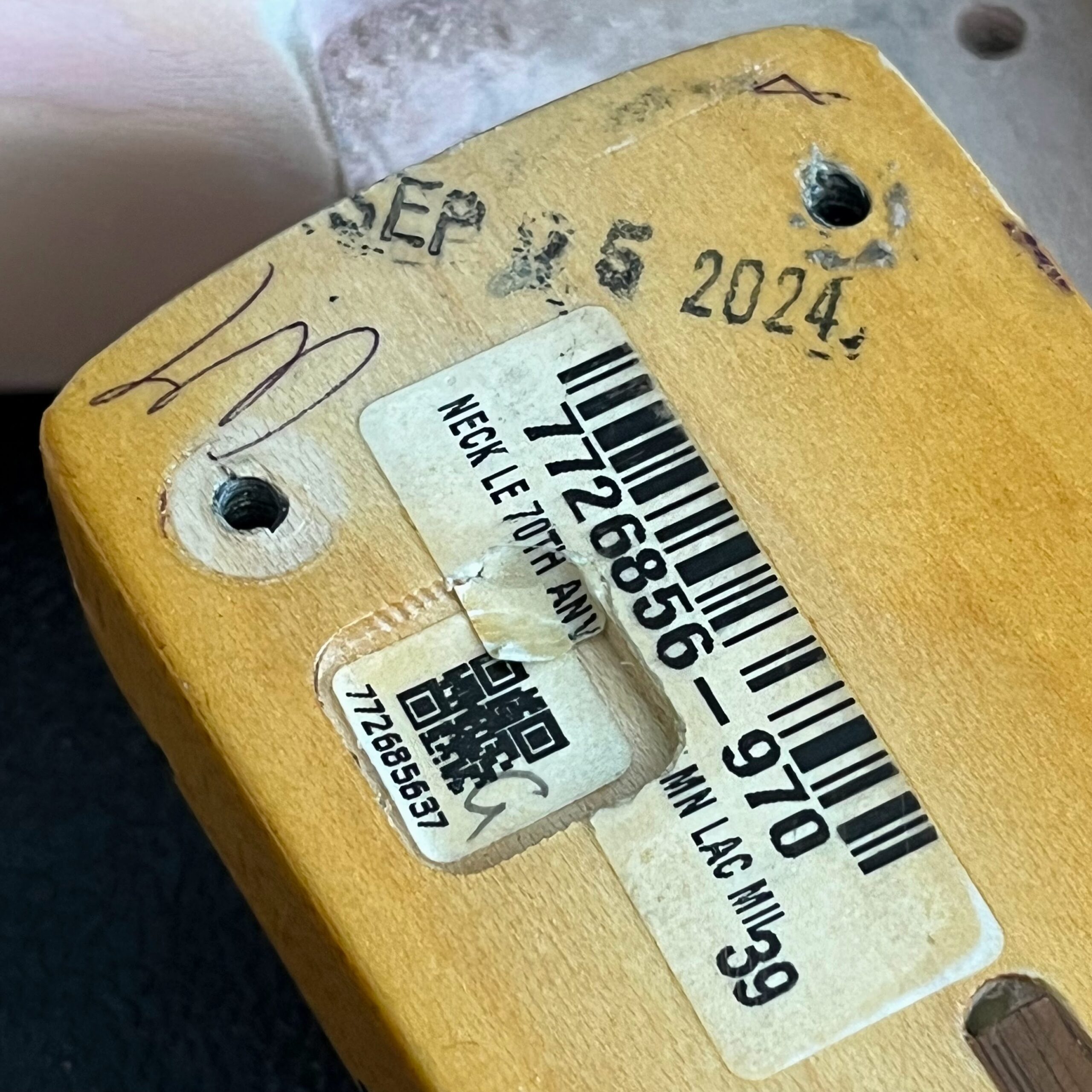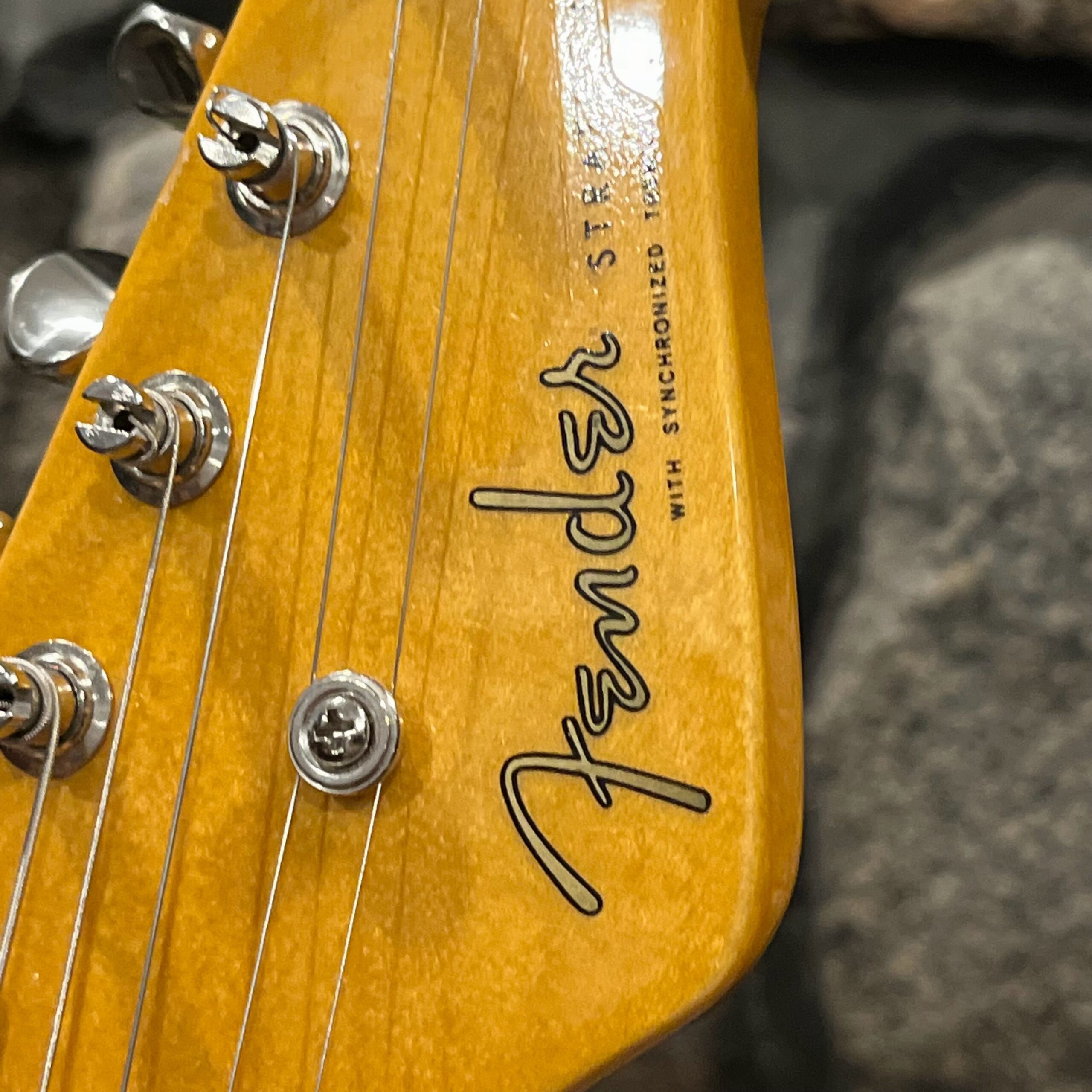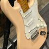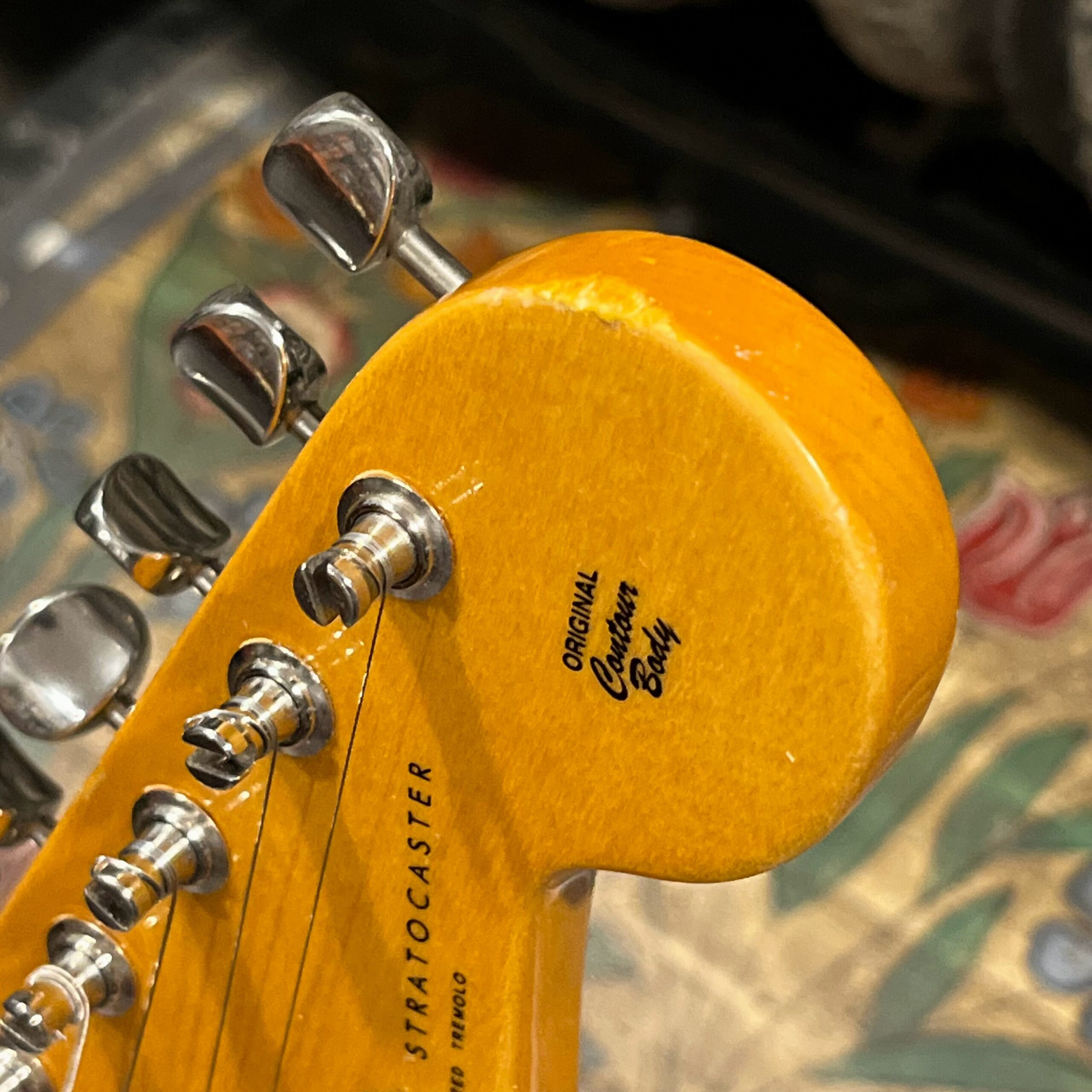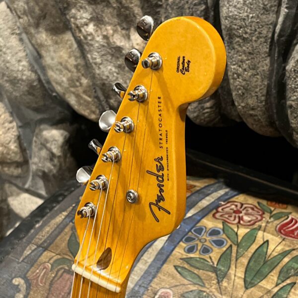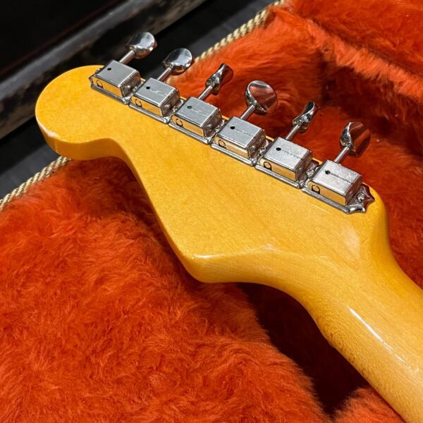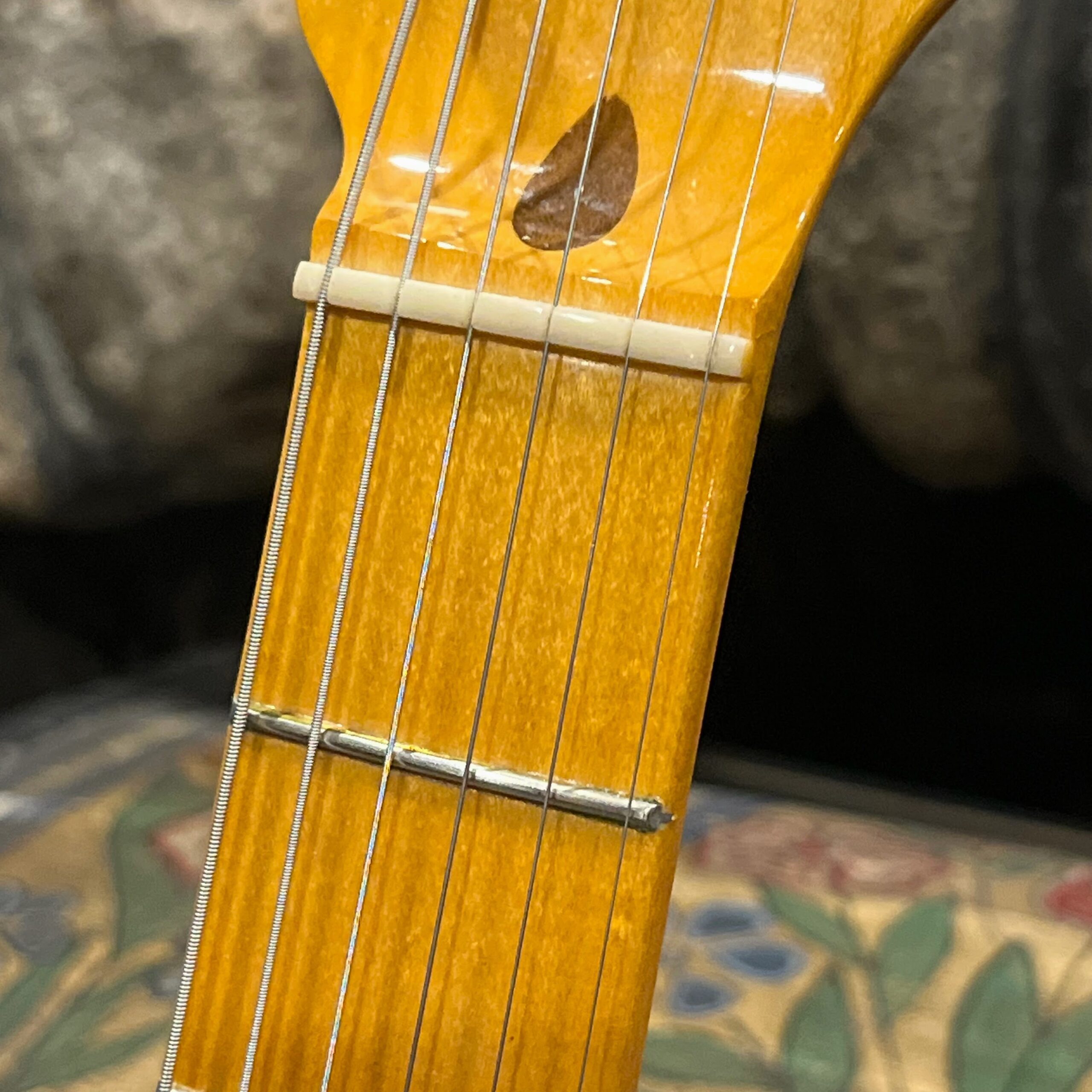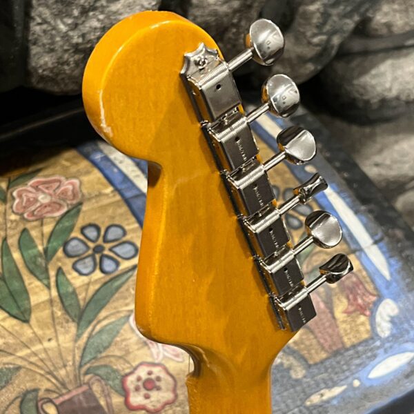 The star of this show is the lacquer nitro maple neck from a 2024 Fender USA 1954 Anniversary Stratocaster with a 7.25″ radius, a C shape profile, and 21 frets, with a maple fretboard and all vintage appointments including Telecaster style string-tree added to a relic MJT Stratocaster faded Coral Pink body with an aged Fender 11-hole 3-ply W/B/W pickguard and a set of vintage 1984 Fender Japan single coil pickups in a SSS configuration with all wiring upgraded to vintage cloth type with Orange Drop capacitor and a 5-way switch. All the hardware is now vintage from the donor ST-57 made in Fujijen. Comes in an older early 1990s AVRI style case, looking good in there, with a vintage style bridge cover, tremolo arm and keys setup on 10s. Weighs 7lbs and 10oz.