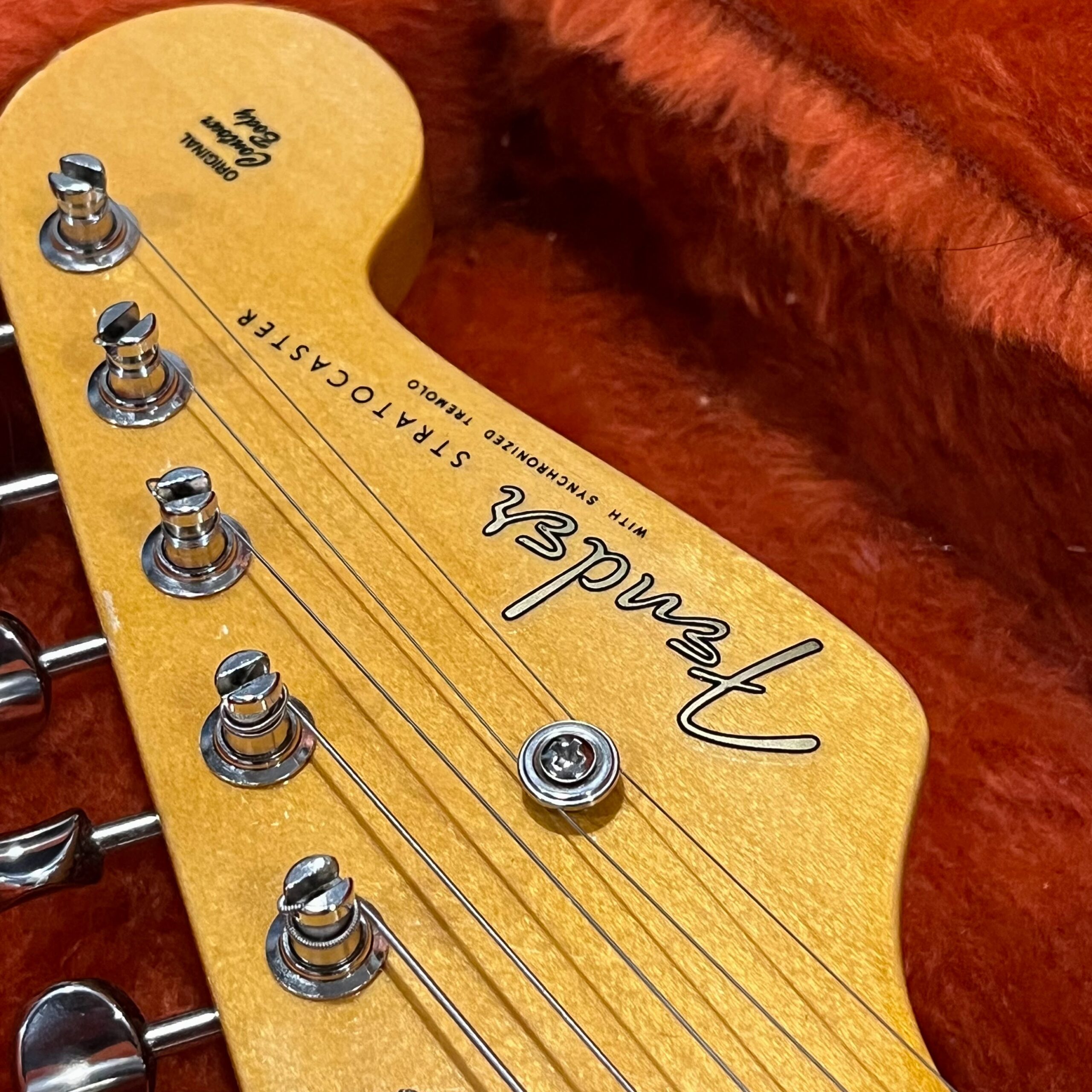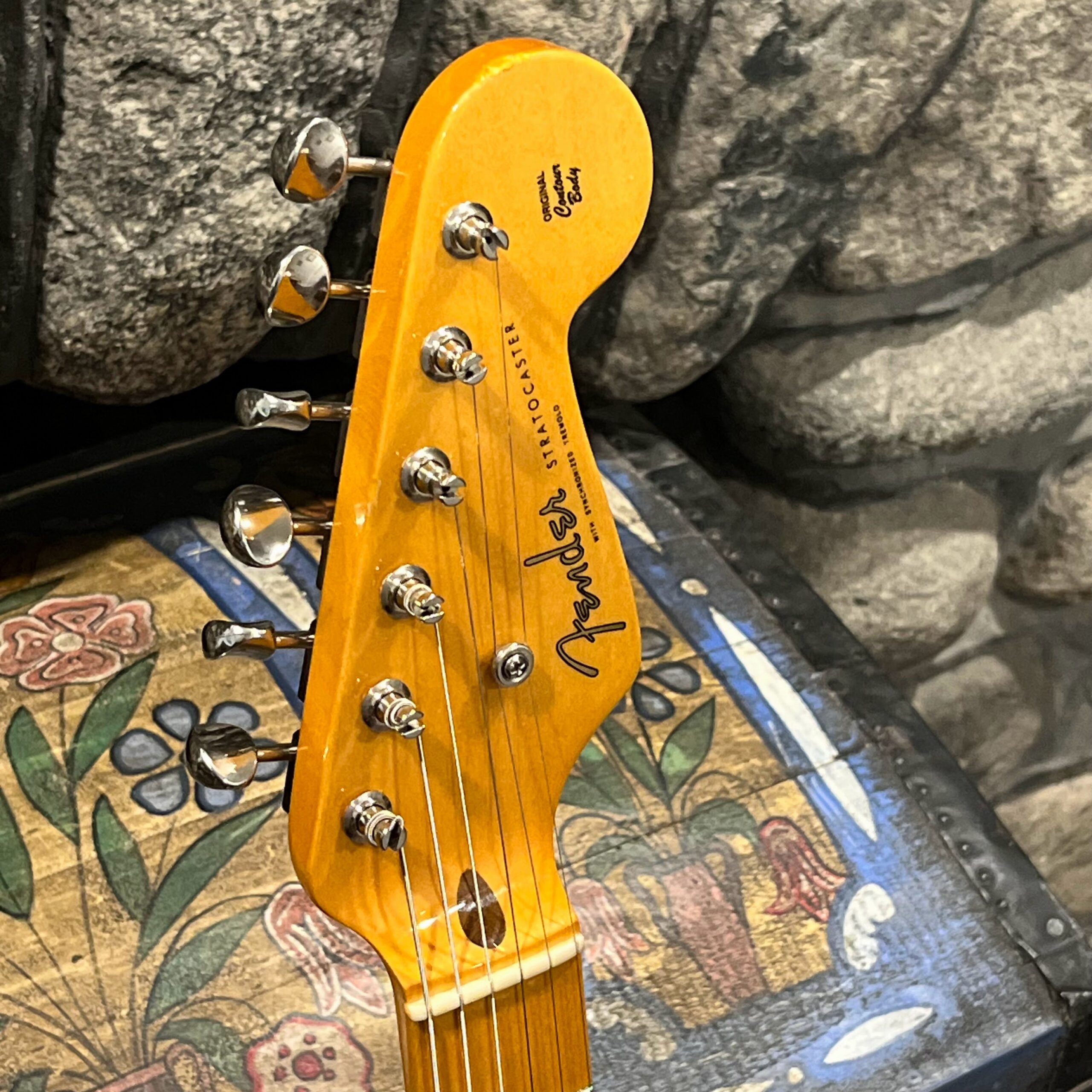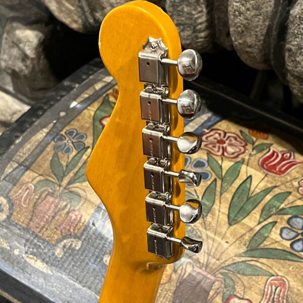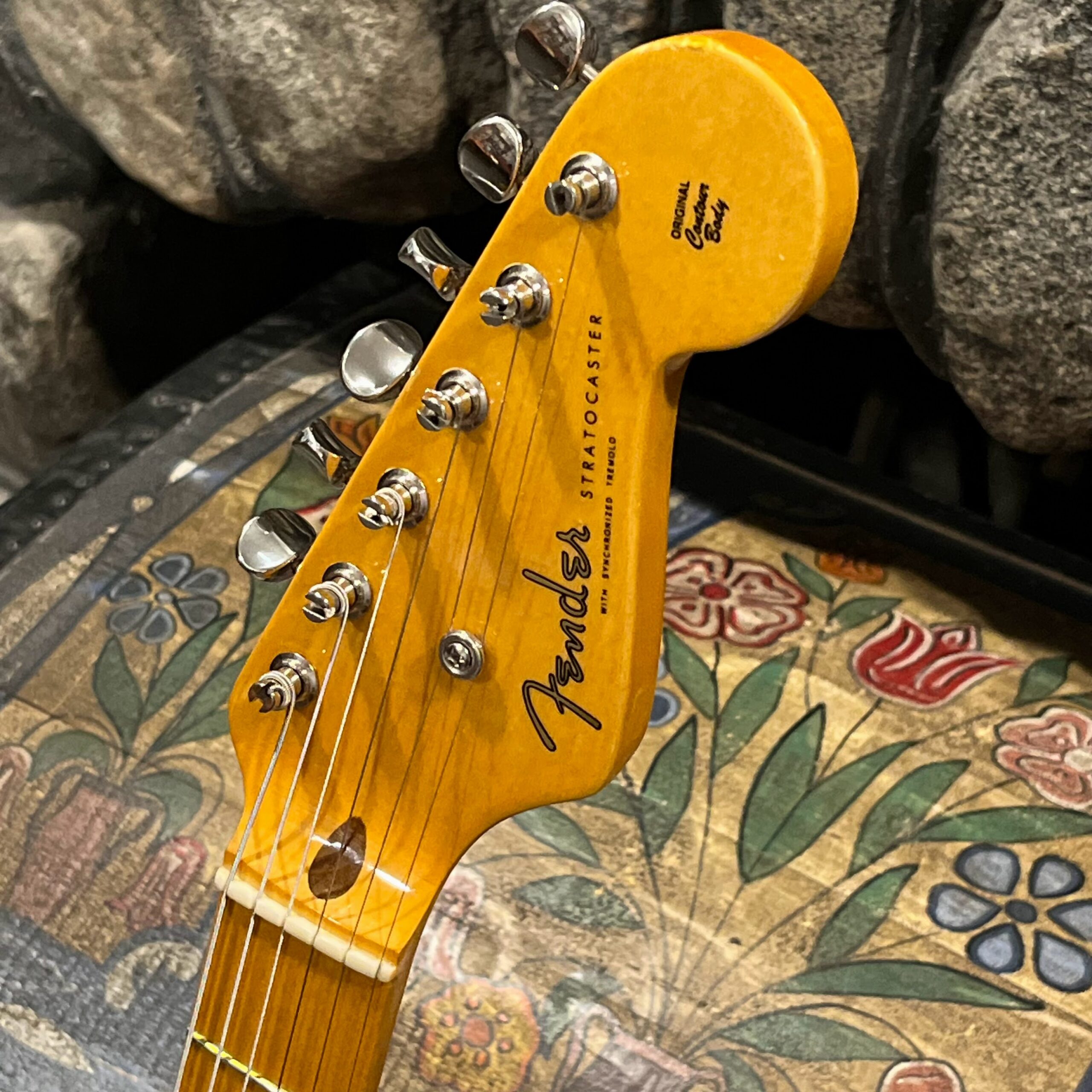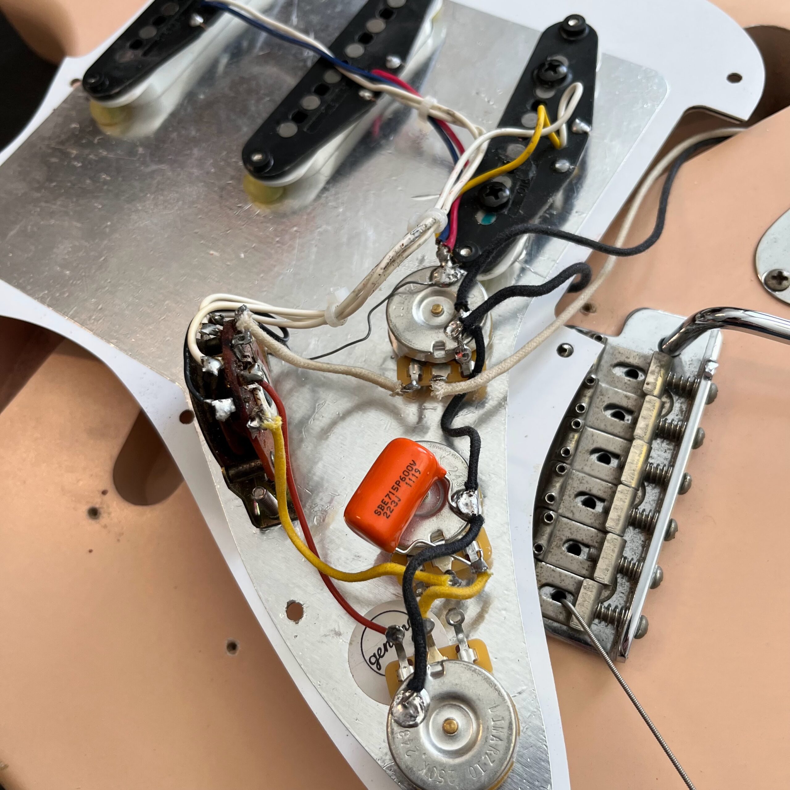The star of this show is the lacquer nitro maple neck from a 2024 Fender USA 1954 Anniversary Stratocaster with a 7.25″ radius, a C shape profile, and 21 frets, with a maple fretboard and all vintage appointments including Telecaster style string-tree added to a relic MJT Stratocaster faded Coral Pink body with an aged Fender 11-hole 3-ply W/B/W pickguard and a set of vintage 1984 Fender Japan single coil pickups in a SSS configuration with all wiring upgraded to vintage cloth type with Orange Drop capacitor and a 5-way switch. All the hardware is now vintage from the donor ST-57 made in Fujijen. Comes in an older early 1990s AVRI style case, looking good in there, with a vintage style bridge cover, tremolo arm and keys setup on 10s. Weighs 7lbs and 10oz.