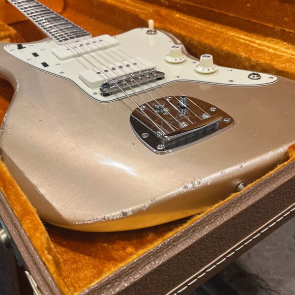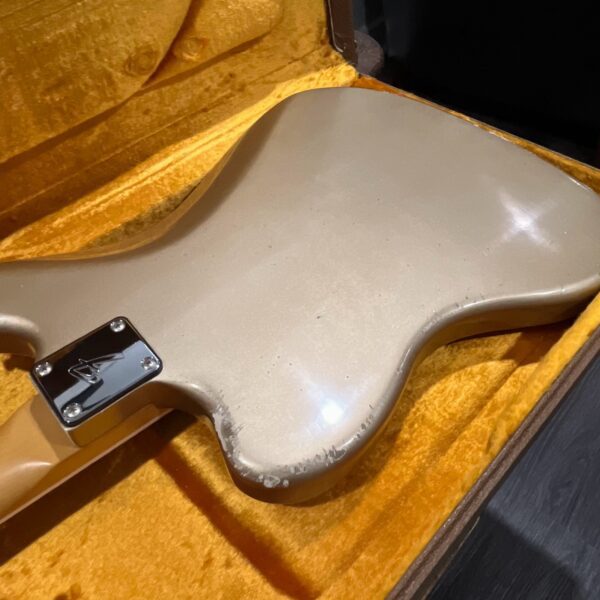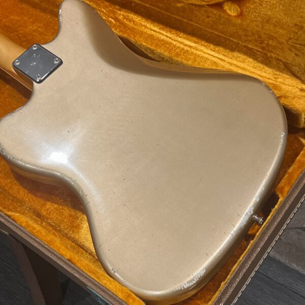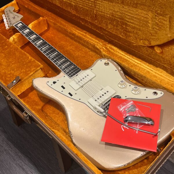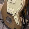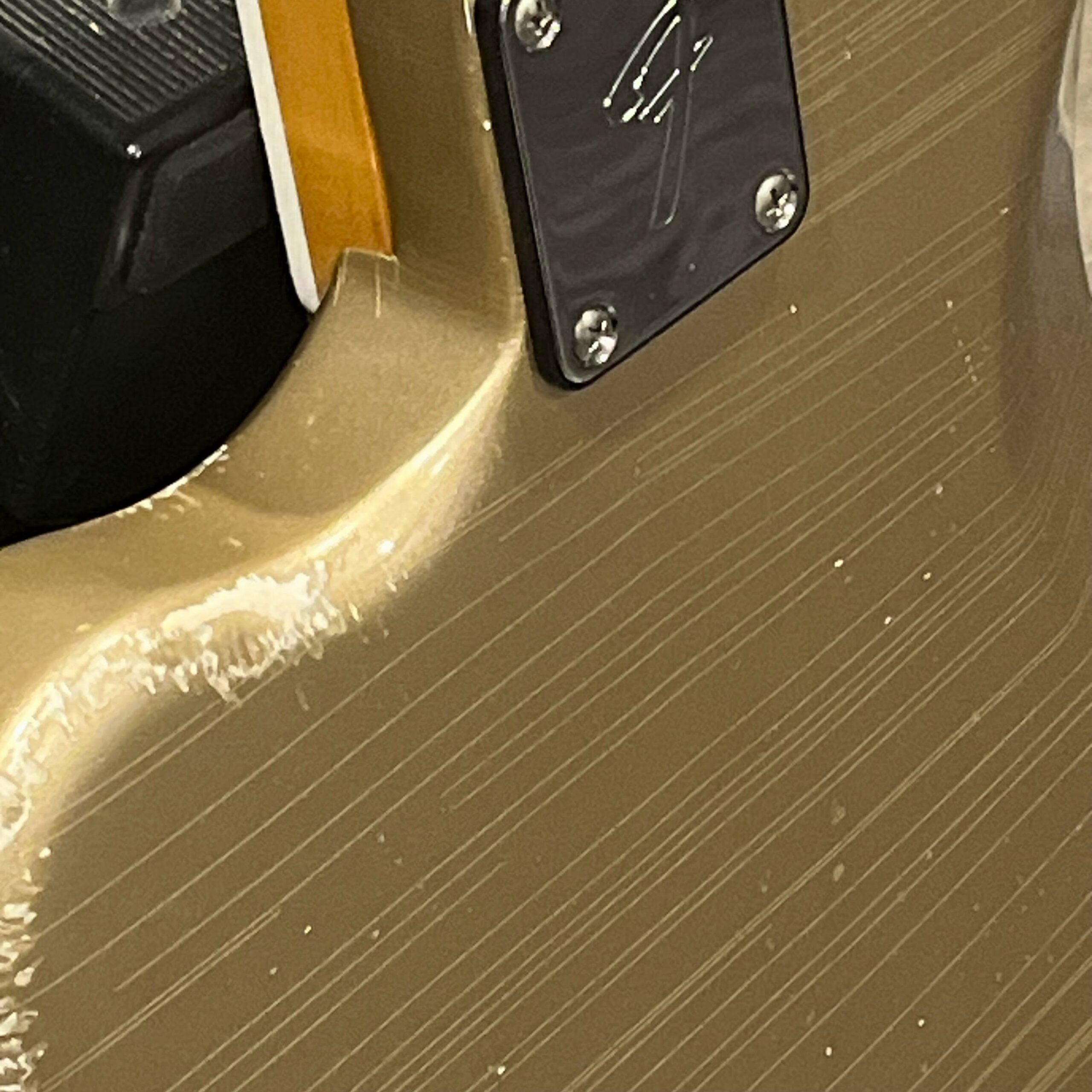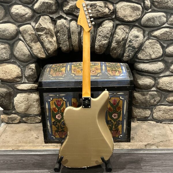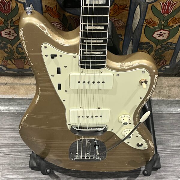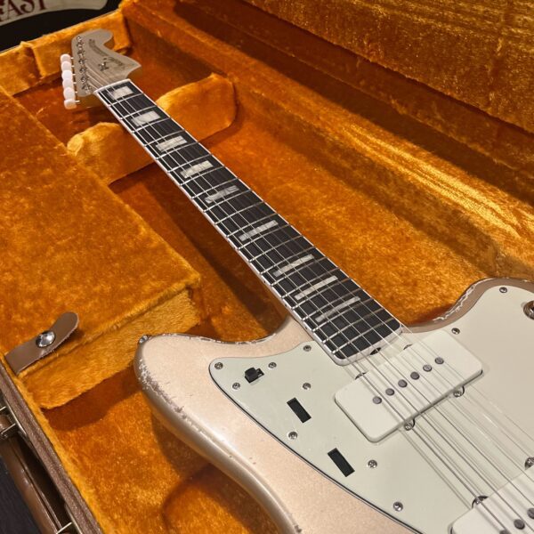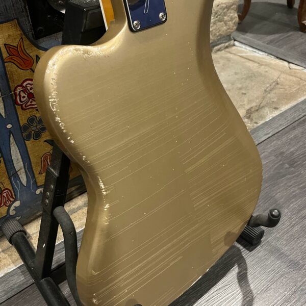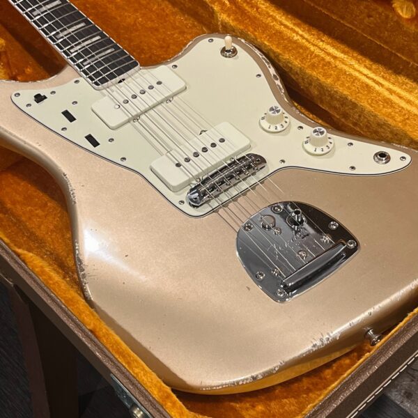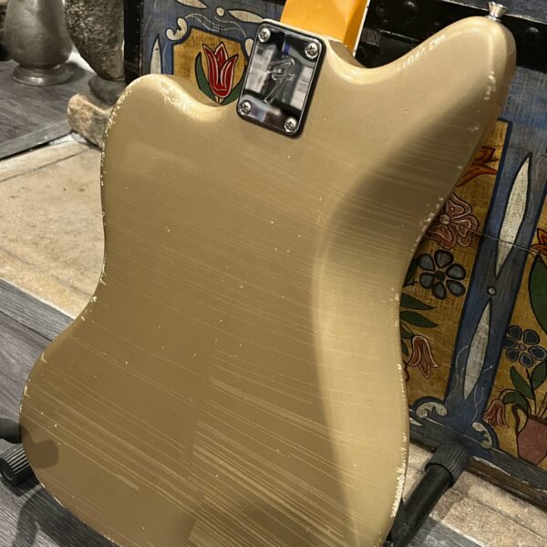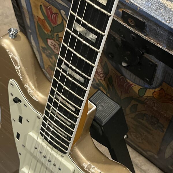 This started as a MIM Goldfoil Jazzmaster from 2023 that came in Shoreline Gold finish with a matched headstock and ebony bound 9.5″ radius 21-fret with block inlays neck, vintage button tuners. Add that to an MJT relic traditional body. vintage cloth wiring sitting behind a parchment 3-ply pickguard and hot overwound Lollar soapbar pickups read 10k in the neck and 10.2k in the bridge position. F style neckplate, parchment tremolo tip, pickup covers and switch tip, traditional lead and rhythm circuits, screaming instrument that goes for the whole ‘alien weapon’ look that defines offsets and Jazzmaster particularly. American Pro II offset bridge with vintage style cover included. Weighs 8lb and 5oz, setup on 10s, comes with tools for bridge, tremolo arm and keys in a Fender G&G Reissue style case. Late 60s traditional Jazzmaster with some pretty rare specs including the block inlays, binding, ebony fretboard. The matched headstock is FTW, a personal favorite, something Fender doesn’t do enough of. Looks great on this beautiful Shoreline Gold creation.
