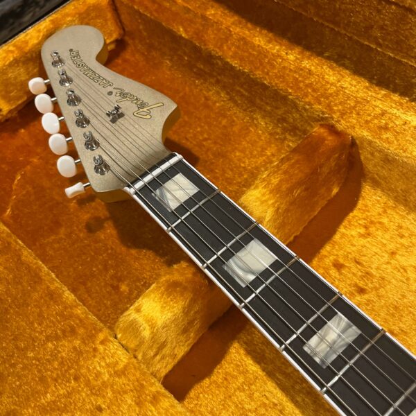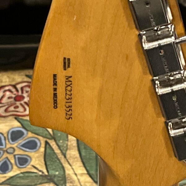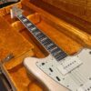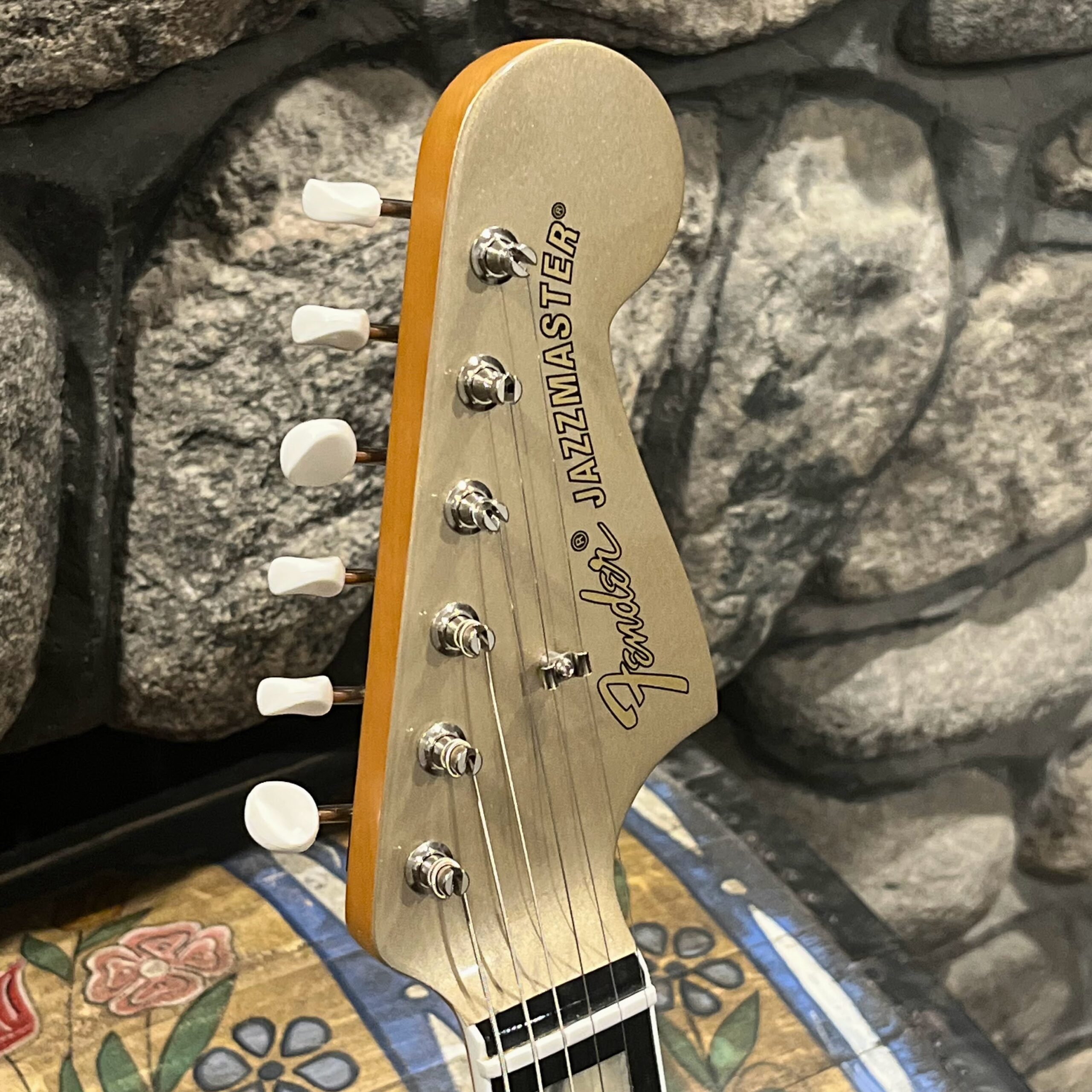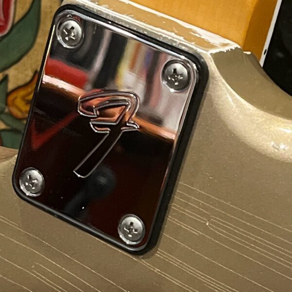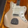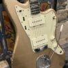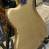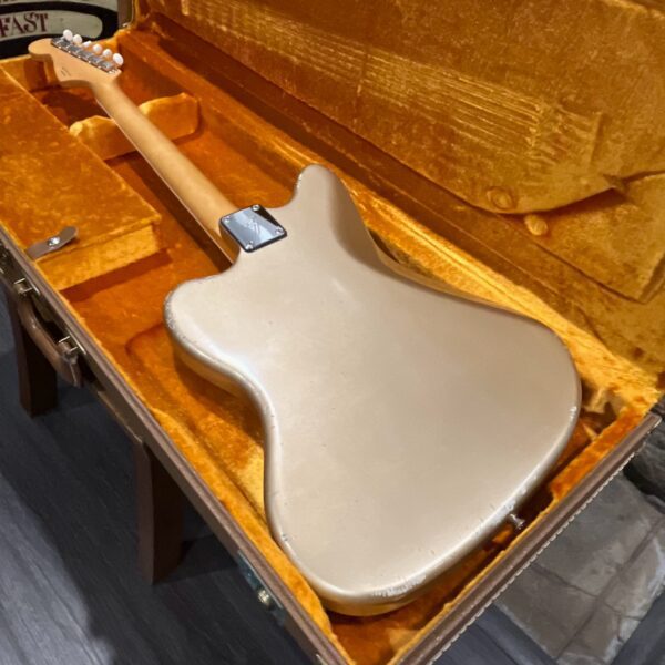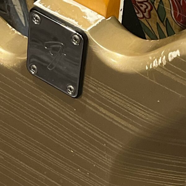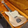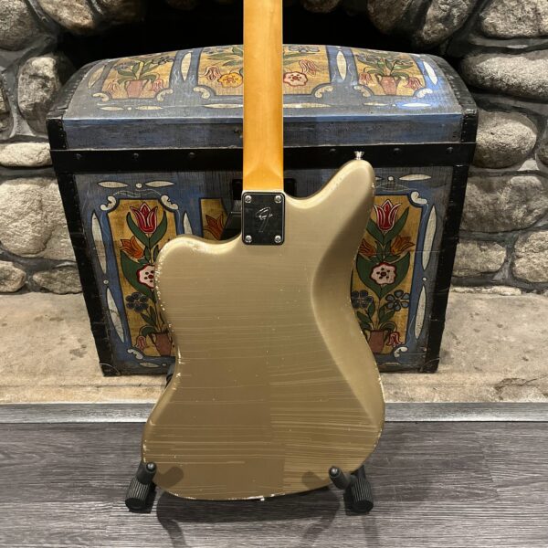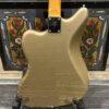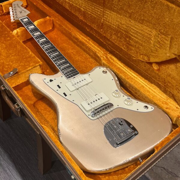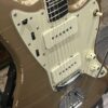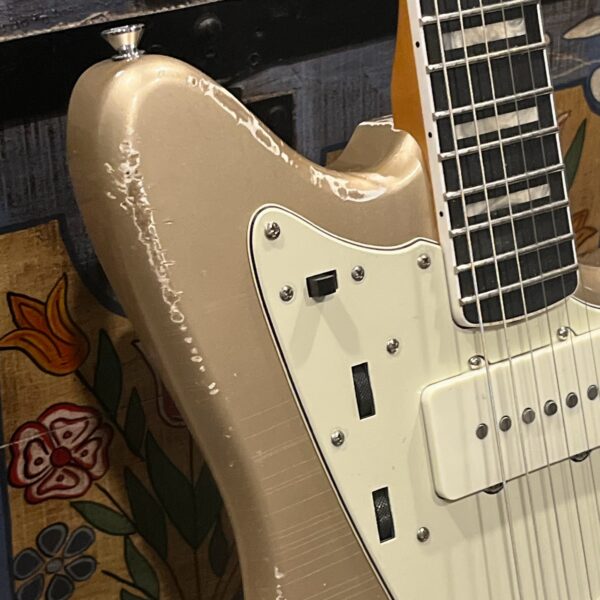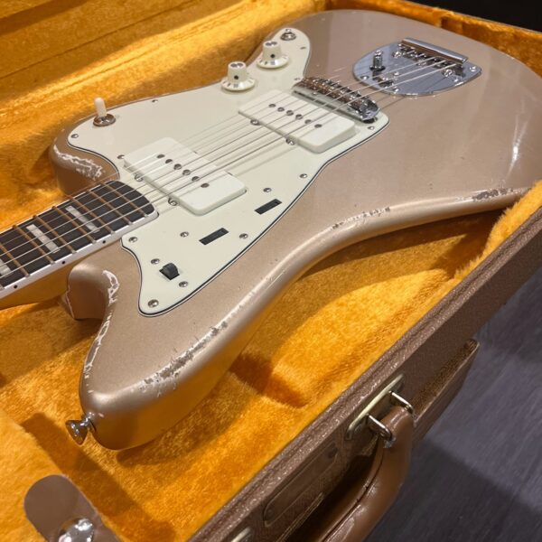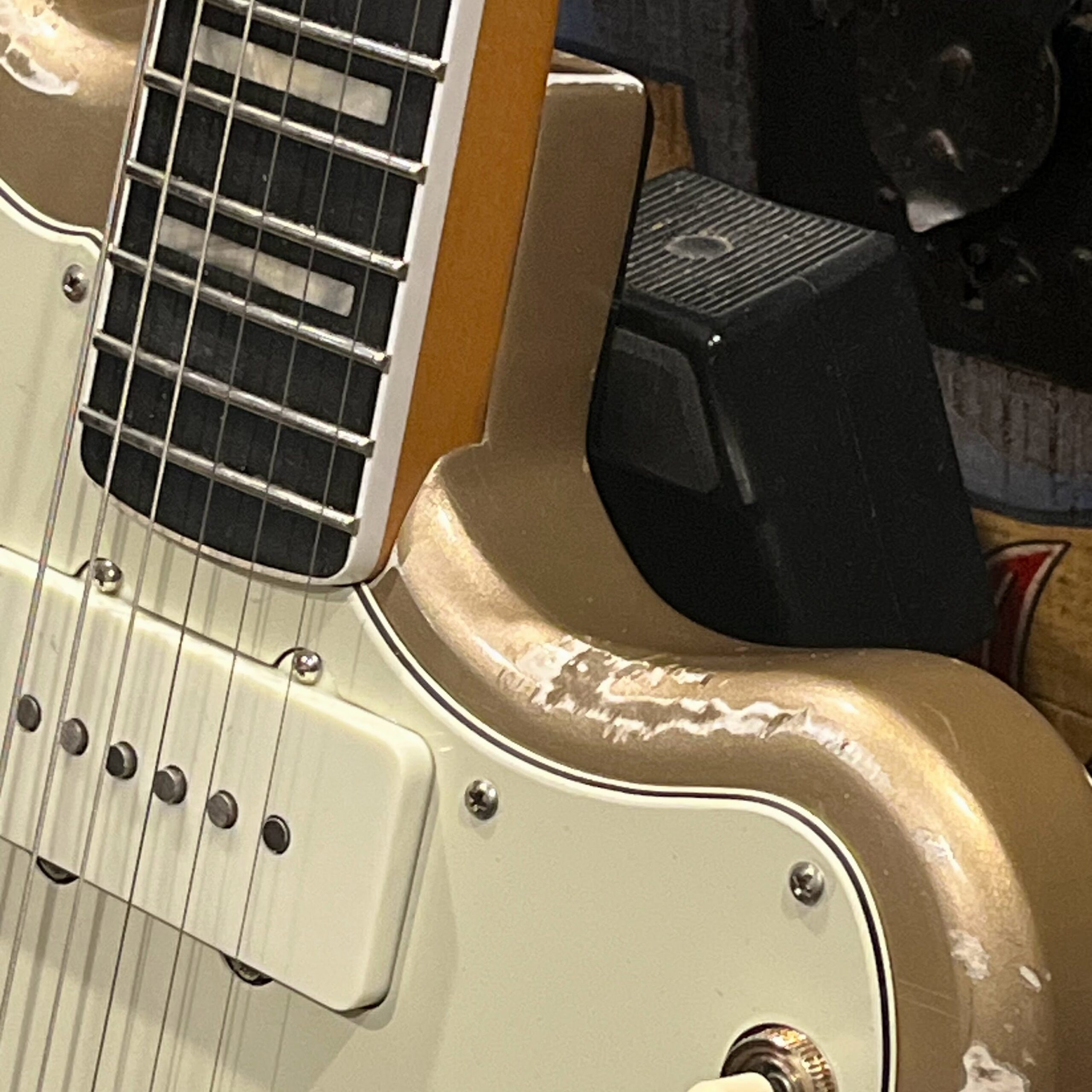 This started as a MIM Goldfoil Jazzmaster from 2023 that came in Shoreline Gold finish with a matched headstock and ebony bound 9.5″ radius 21-fret with block inlays neck, vintage button tuners. Add that to an MJT relic traditional body. vintage cloth wiring sitting behind a parchment 3-ply pickguard and hot overwound Lollar soapbar pickups read 10k in the neck and 10.2k in the bridge position. F style neckplate, parchment tremolo tip, pickup covers and switch tip, traditional lead and rhythm circuits, screaming instrument that goes for the whole ‘alien weapon’ look that defines offsets and Jazzmaster particularly. American Pro II offset bridge with vintage style cover included. Weighs 8lb and 5oz, setup on 10s, comes with tools for bridge, tremolo arm and keys in a Fender G&G Reissue style case. Late 60s traditional Jazzmaster with some pretty rare specs including the block inlays, binding, ebony fretboard. The matched headstock is FTW, a personal favorite, something Fender doesn’t do enough of. Looks great on this beautiful Shoreline Gold creation.