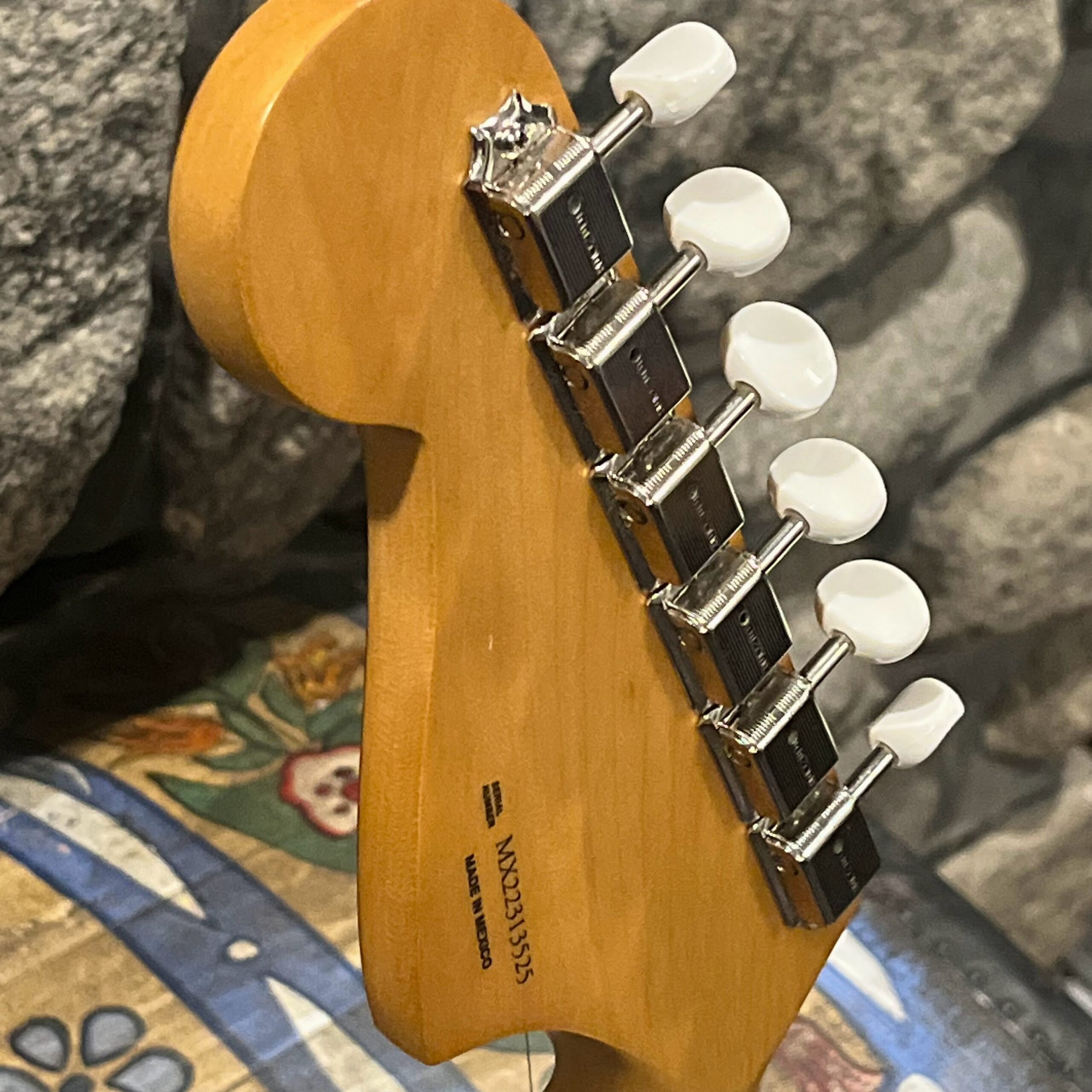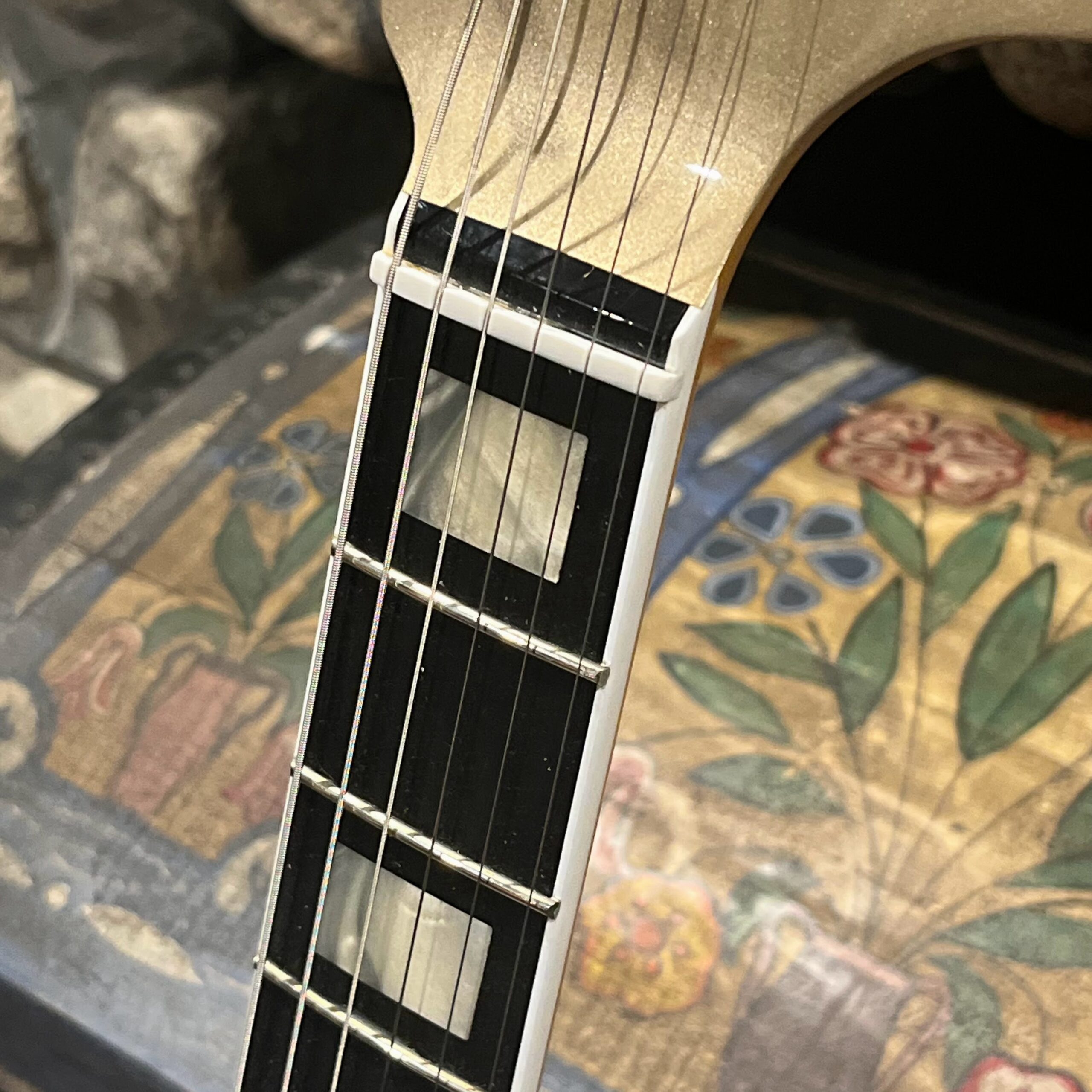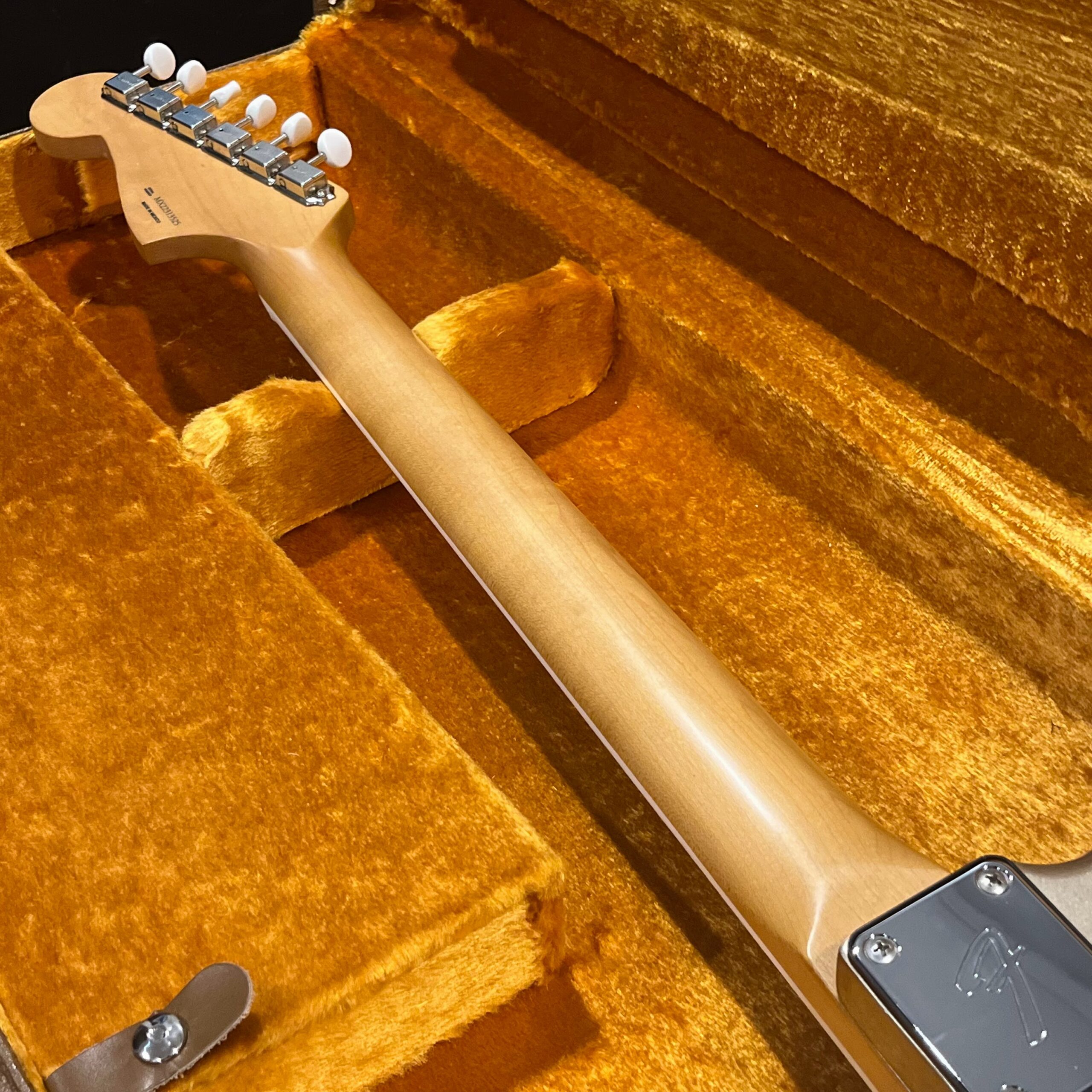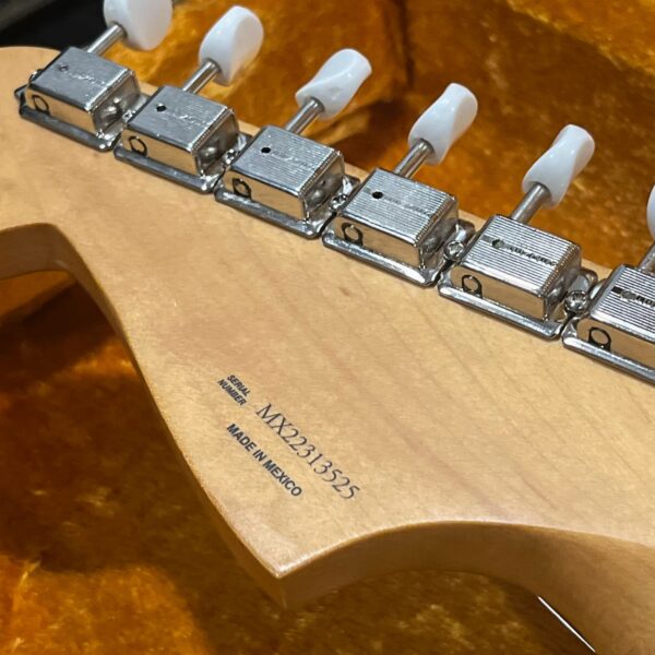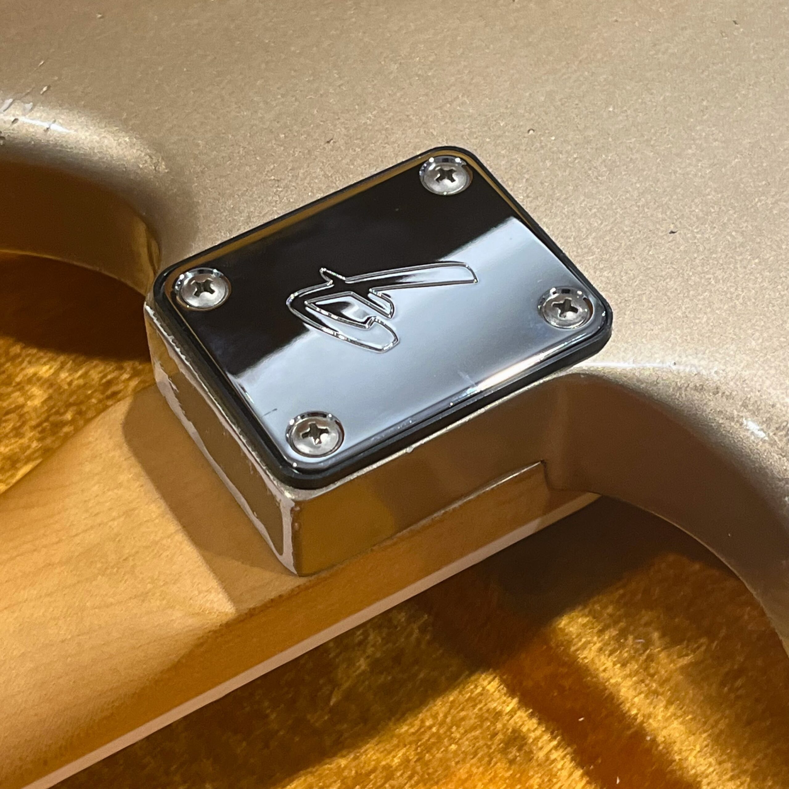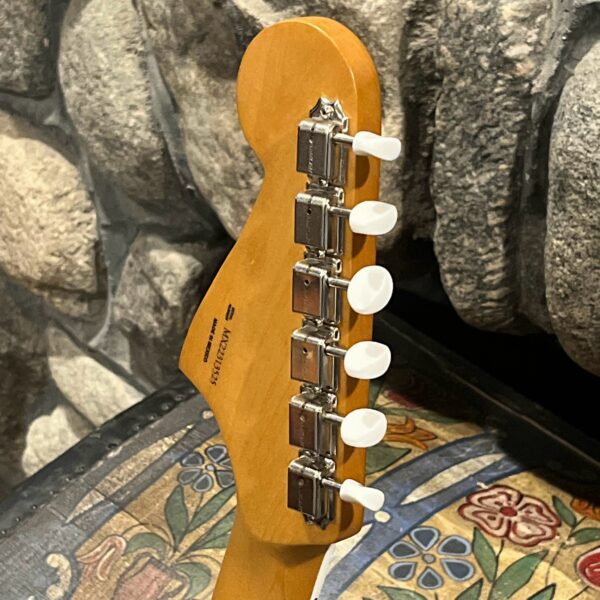 This started as a MIM Goldfoil Jazzmaster from 2023 that came in Shoreline Gold finish with a matched headstock and ebony bound 9.5″ radius 21-fret with block inlays neck, vintage button tuners. Add that to an MJT relic traditional body. vintage cloth wiring sitting behind a parchment 3-ply pickguard and hot overwound Lollar soapbar pickups read 10k in the neck and 10.2k in the bridge position. F style neckplate, parchment tremolo tip, pickup covers and switch tip, traditional lead and rhythm circuits, screaming instrument that goes for the whole ‘alien weapon’ look that defines offsets and Jazzmaster particularly. American Pro II offset bridge with vintage style cover included. Weighs 8lb and 5oz, setup on 10s, comes with tools for bridge, tremolo arm and keys in a Fender G&G Reissue style case. Late 60s traditional Jazzmaster with some pretty rare specs including the block inlays, binding, ebony fretboard. The matched headstock is FTW, a personal favorite, something Fender doesn’t do enough of. Looks great on this beautiful Shoreline Gold creation.