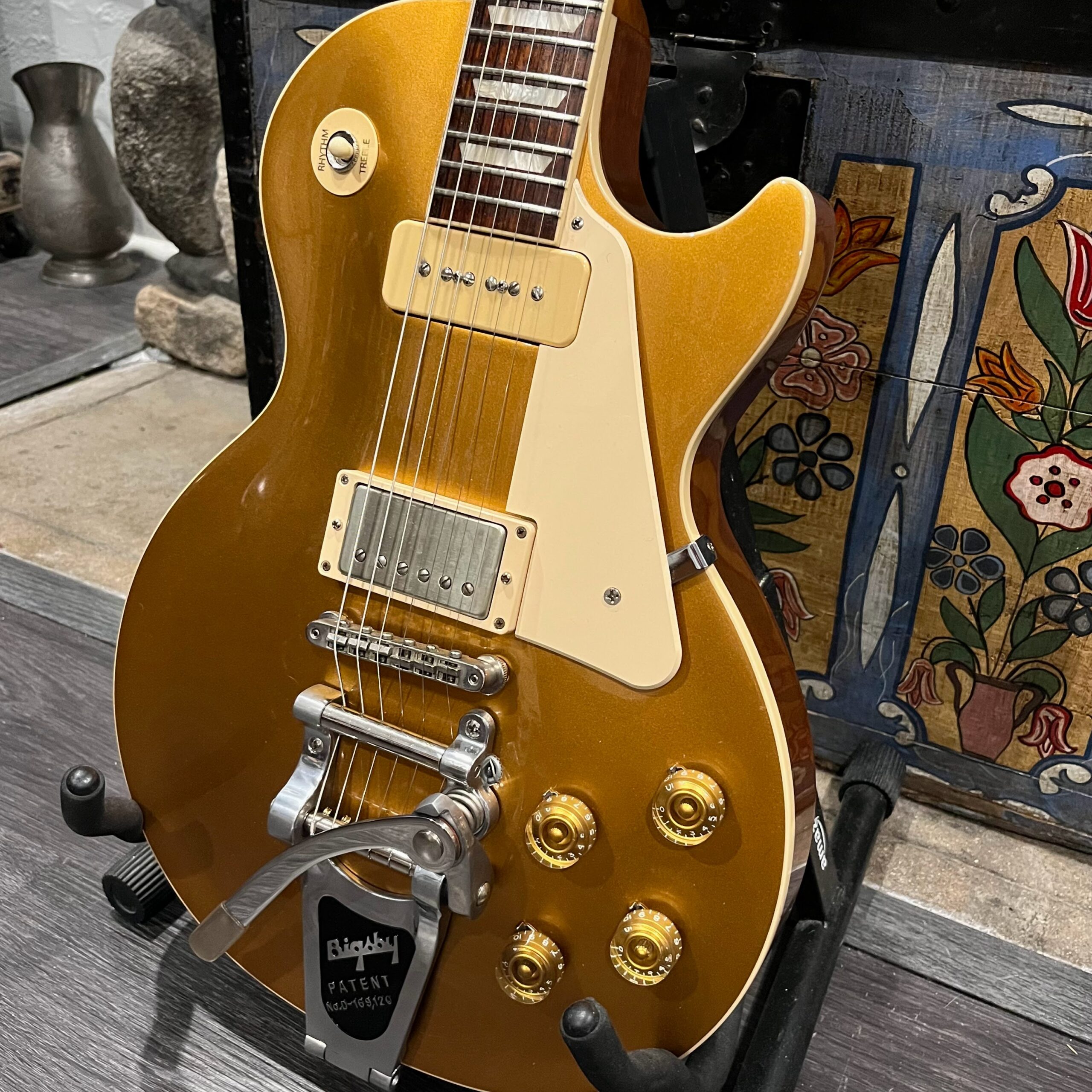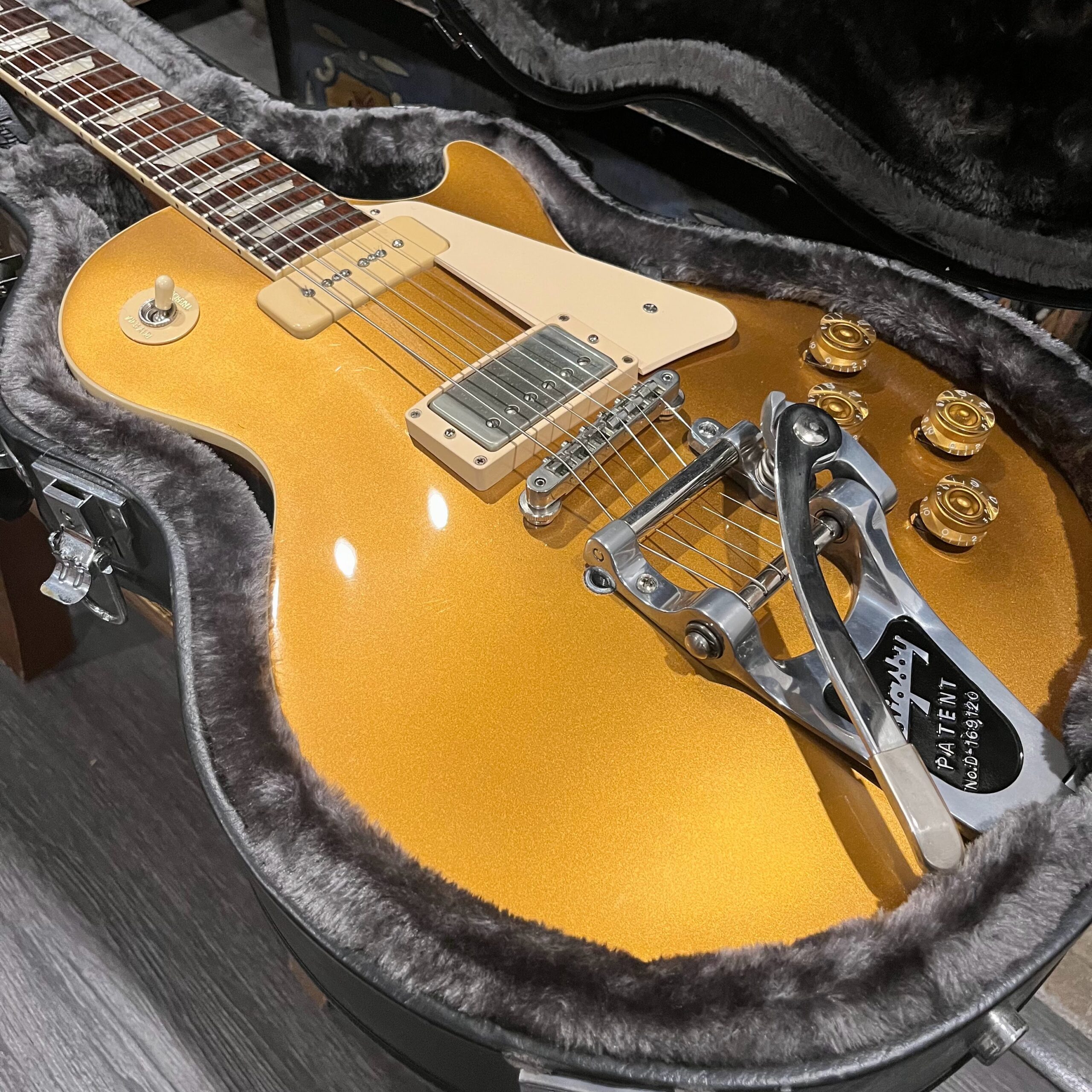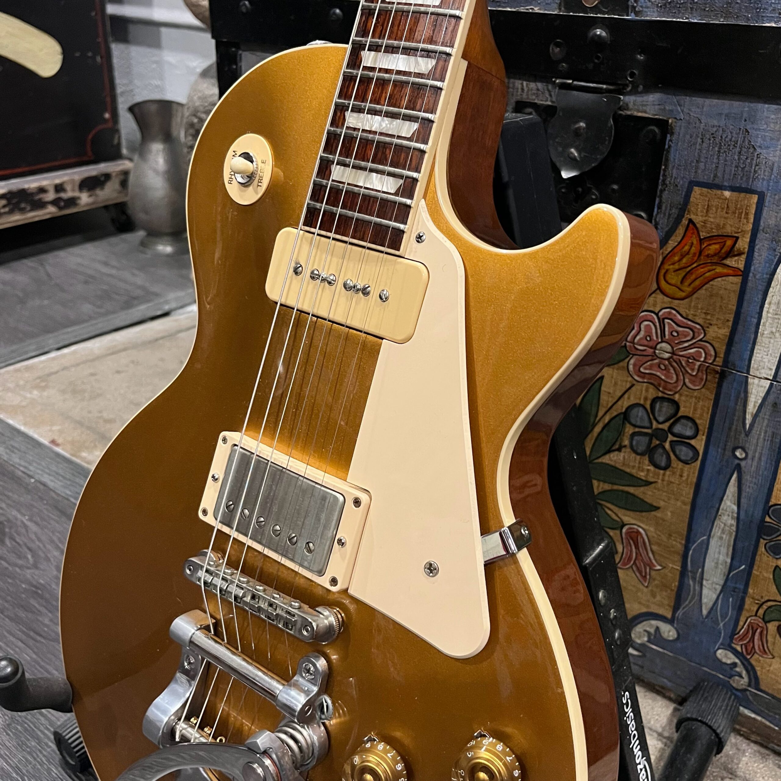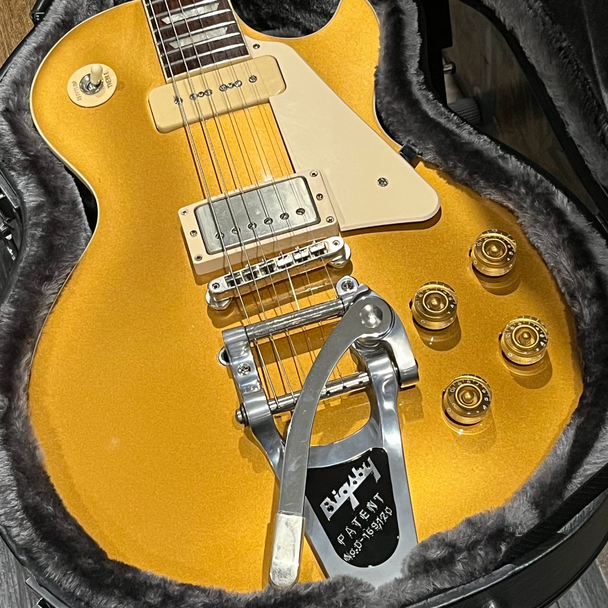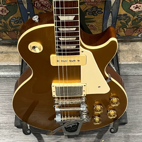 2022 Gibson 50s Les Paul Goldtop dressed with a Bigsby B7 and Suhr Thornbucker in the bridge position to resemble a certain signature model Les Paul with the initials SV. Stock Gibson p90 pickup in the bridge position, gold Speedknobs, thumbleeders, vinyl nut, 50s style ABR bridge, bound rosewood 22 fret neck with a 50s profile. Setup on 10s, weight 10lb and 3oz – old school on the scales, not a lightweight by any means. Comes in an aftermarket hardcase with some factory papers and truss rod tool, original Deluxe truss rod cover. Original wiring, Orange Drop Capacitors. Definitely not a Sergio Vallins signature instrument.