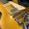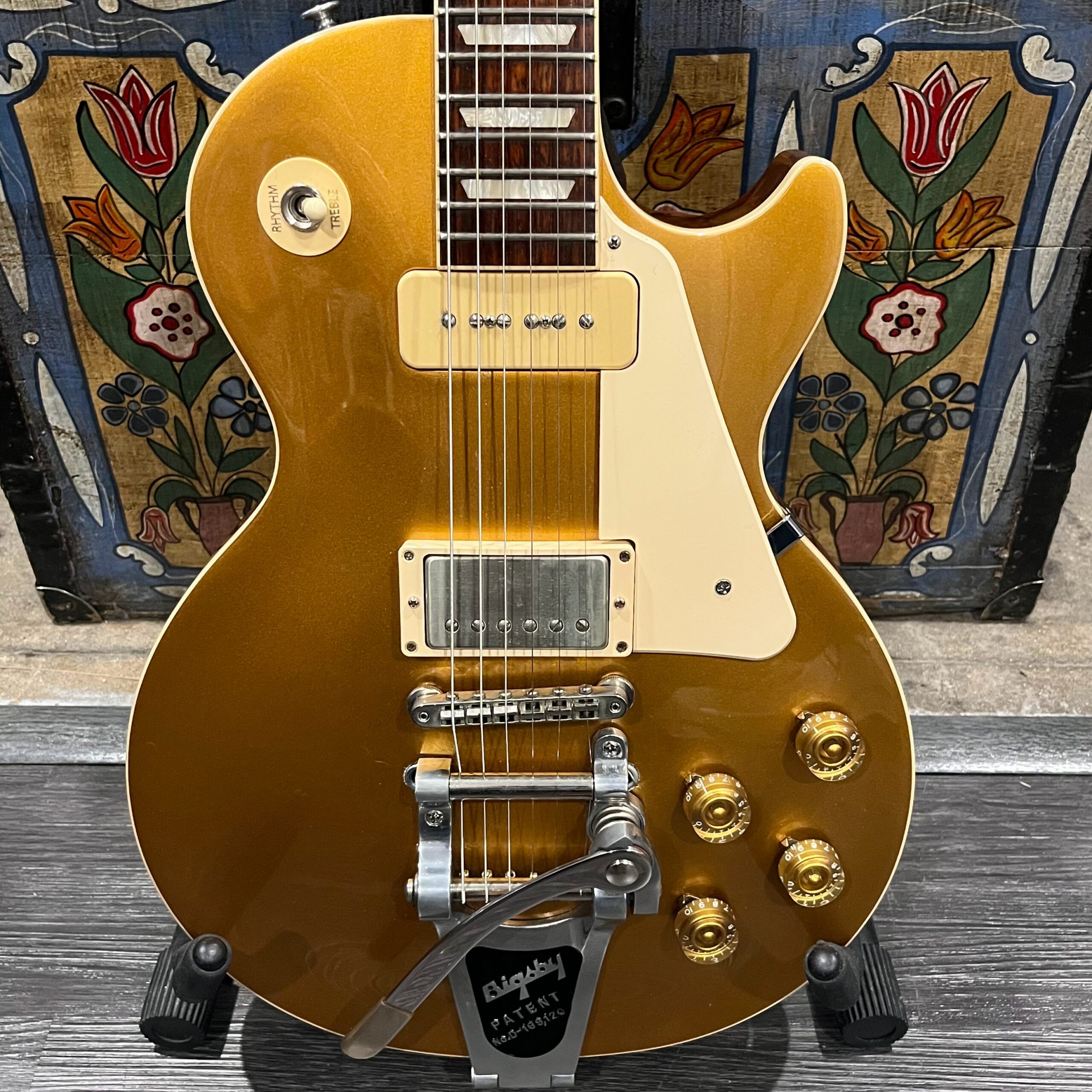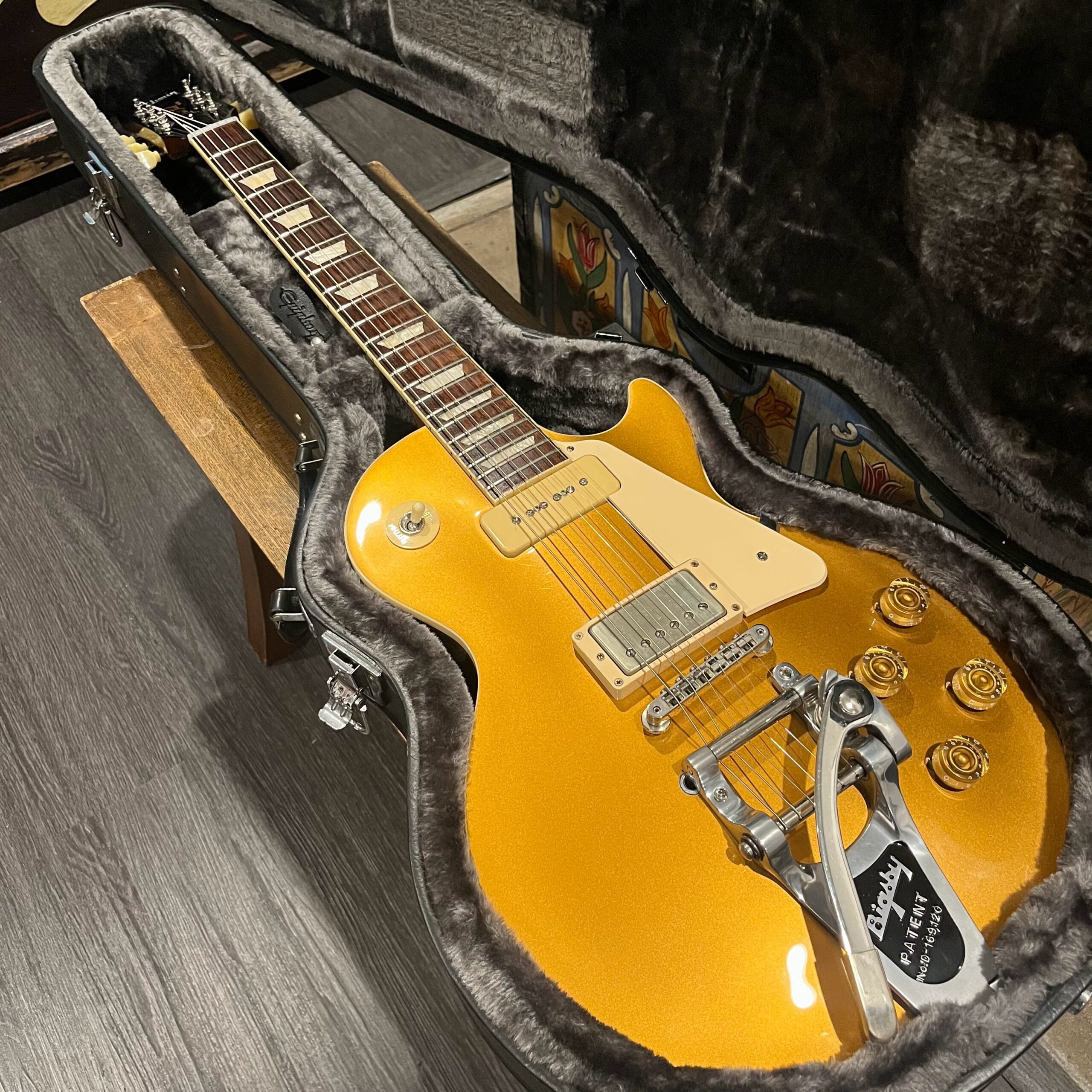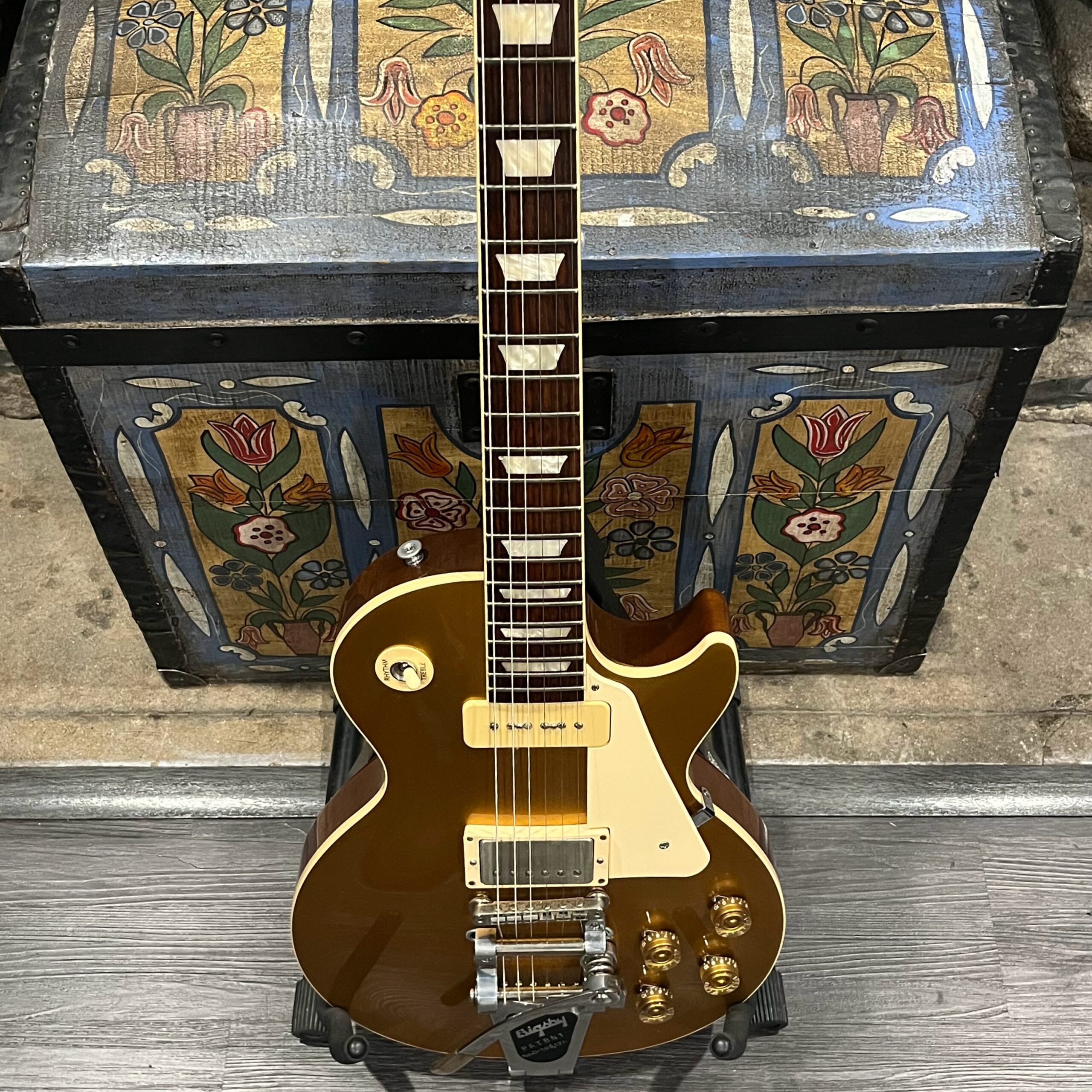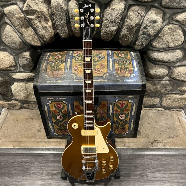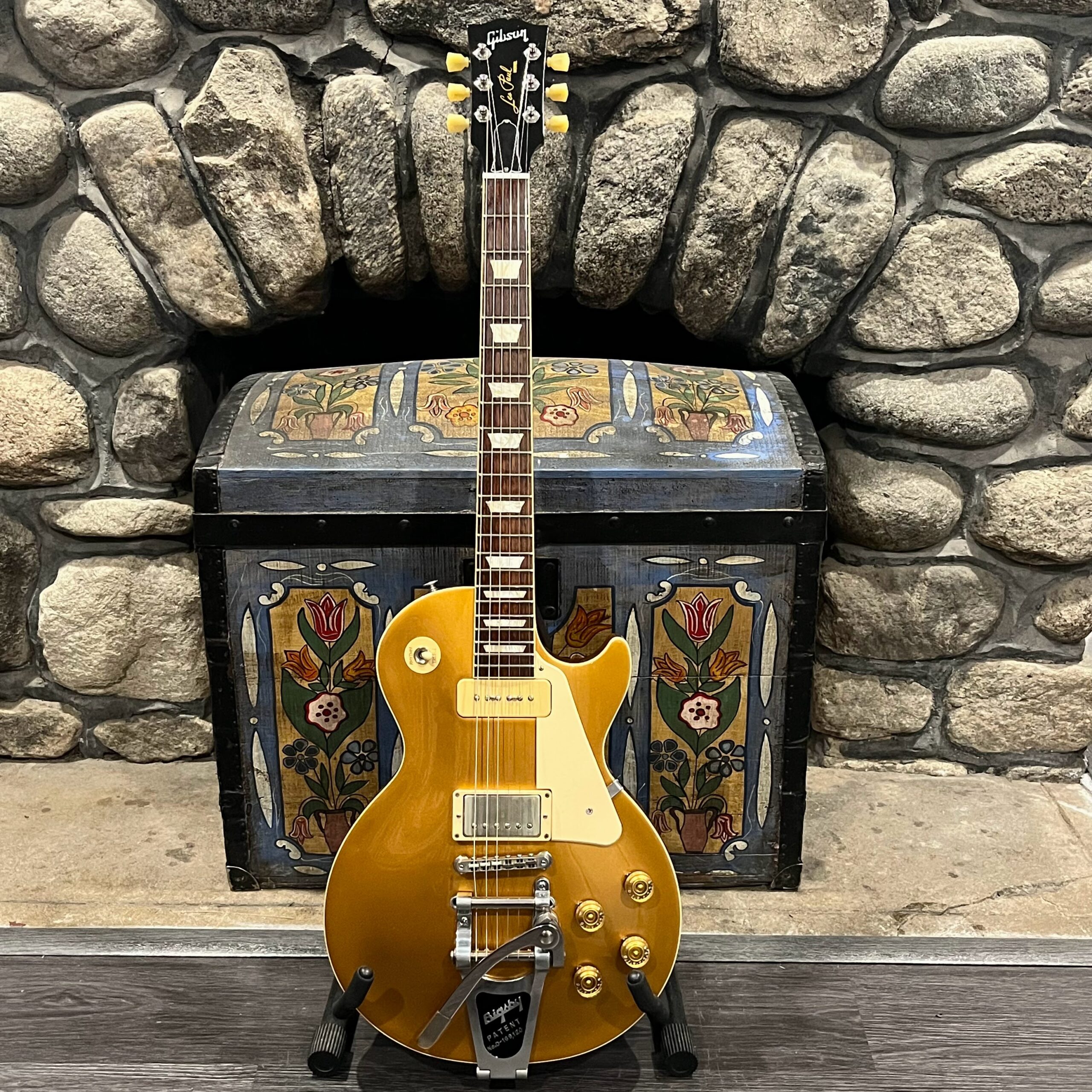 2022 Gibson 50s Les Paul Goldtop dressed with a Bigsby B7 and Suhr Thornbucker in the bridge position to resemble a certain signature model Les Paul with the initials SV. Stock Gibson p90 pickup in the bridge position, gold Speedknobs, thumbleeders, vinyl nut, 50s style ABR bridge, bound rosewood 22 fret neck with a 50s profile. Setup on 10s, weight 10lb and 3oz – old school on the scales, not a lightweight by any means. Comes in an aftermarket hardcase with some factory papers and truss rod tool, original Deluxe truss rod cover. Original wiring, Orange Drop Capacitors. Definitely not a Sergio Vallins signature instrument.