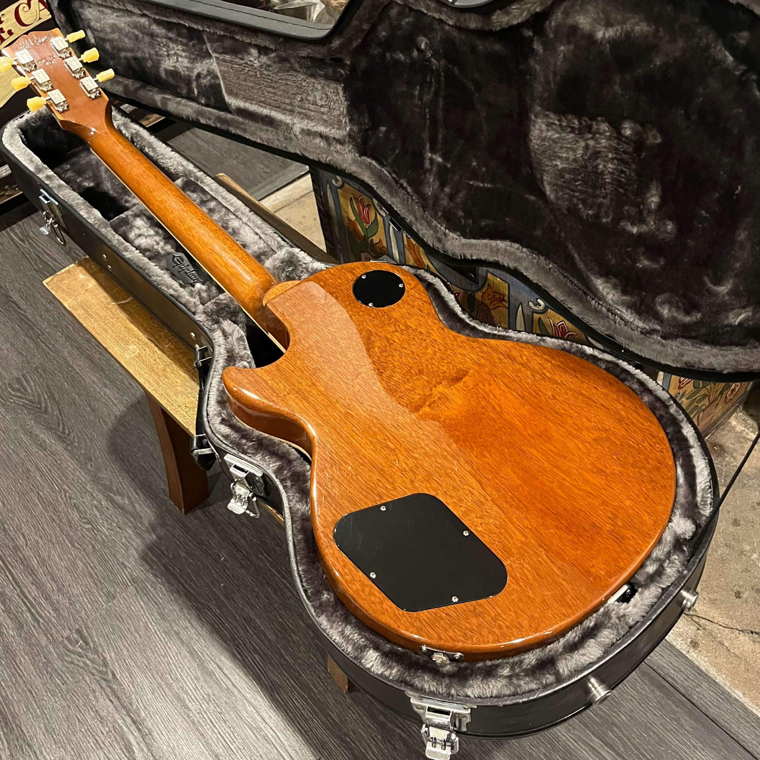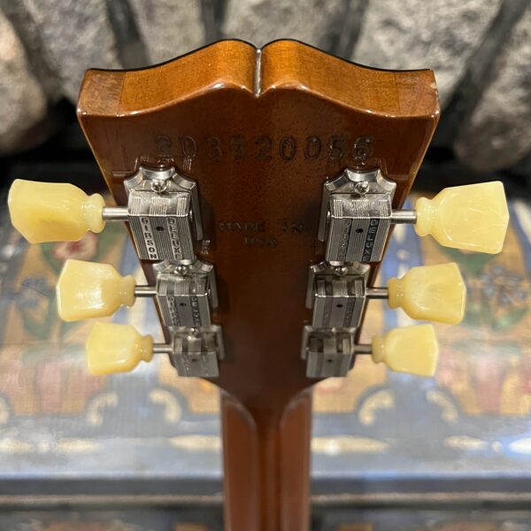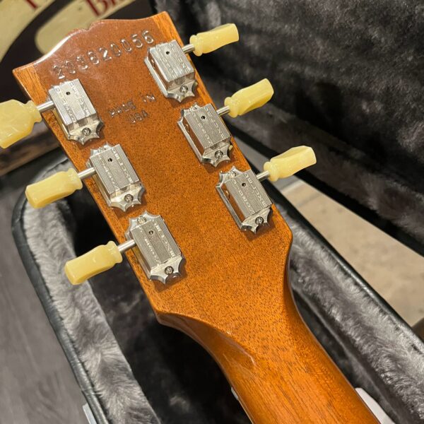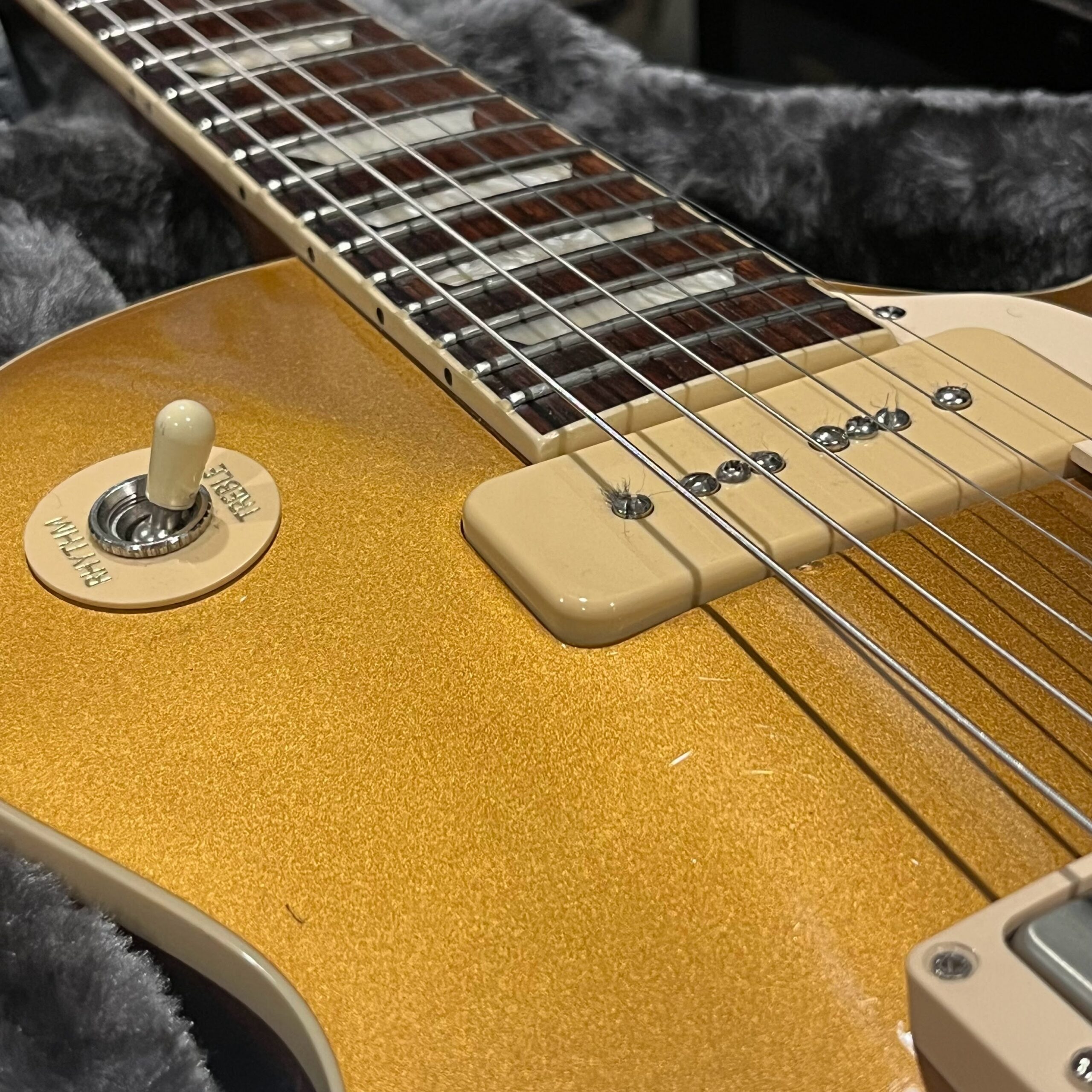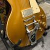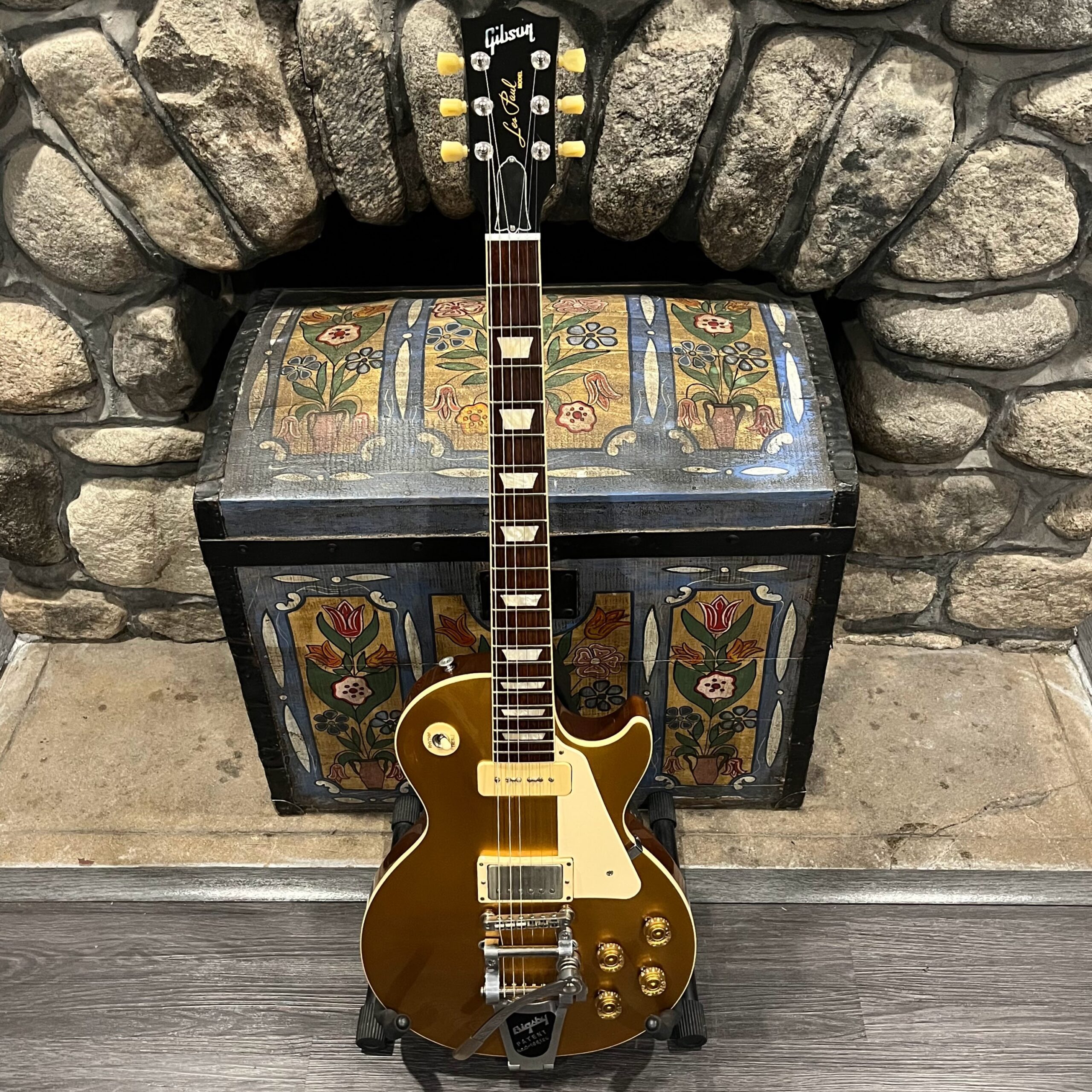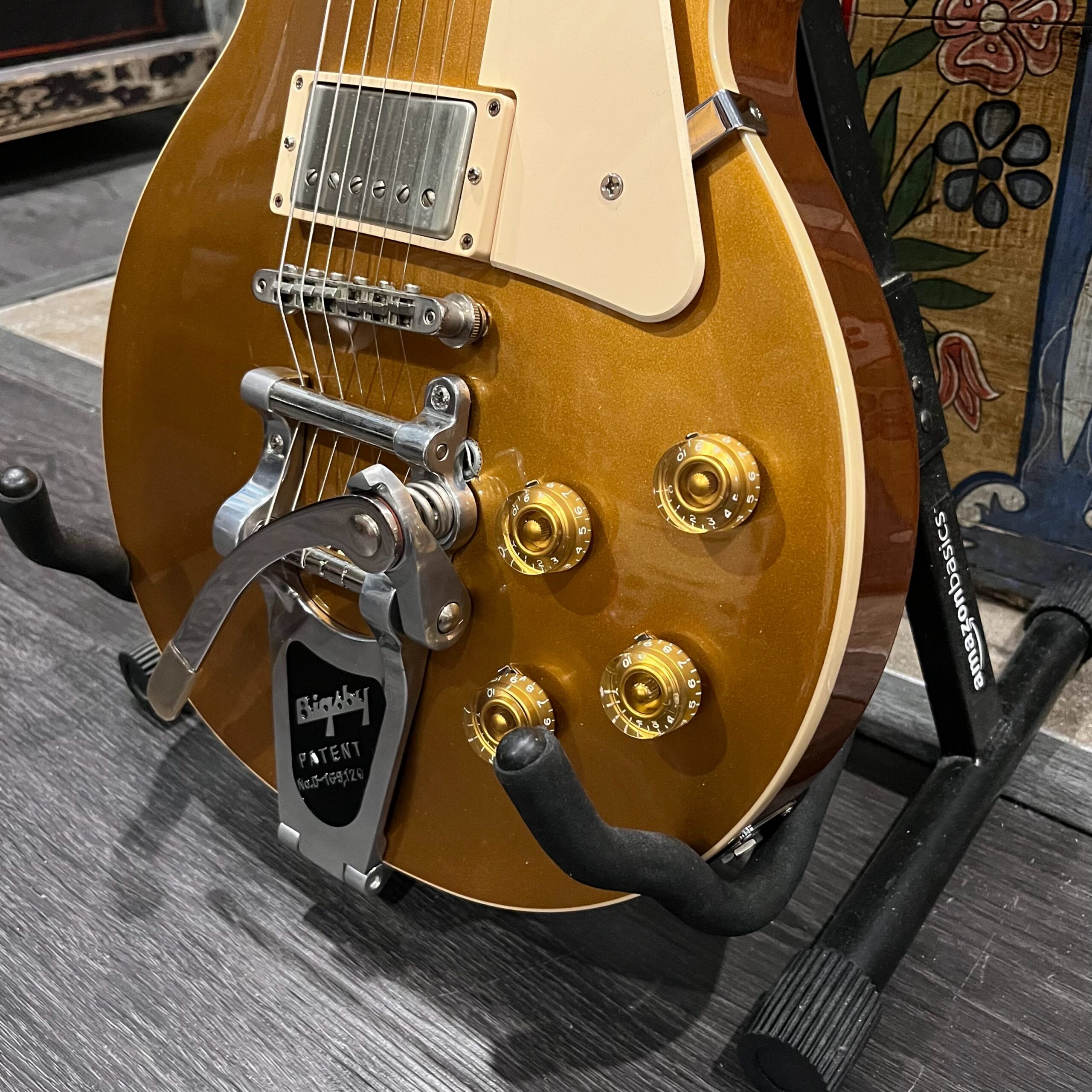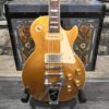 2022 Gibson 50s Les Paul Goldtop dressed with a Bigsby B7 and Suhr Thornbucker in the bridge position to resemble a certain signature model Les Paul with the initials SV. Stock Gibson p90 pickup in the bridge position, gold Speedknobs, thumbleeders, vinyl nut, 50s style ABR bridge, bound rosewood 22 fret neck with a 50s profile. Setup on 10s, weight 10lb and 3oz – old school on the scales, not a lightweight by any means. Comes in an aftermarket hardcase with some factory papers and truss rod tool, original Deluxe truss rod cover. Original wiring, Orange Drop Capacitors. Definitely not a Sergio Vallins signature instrument.