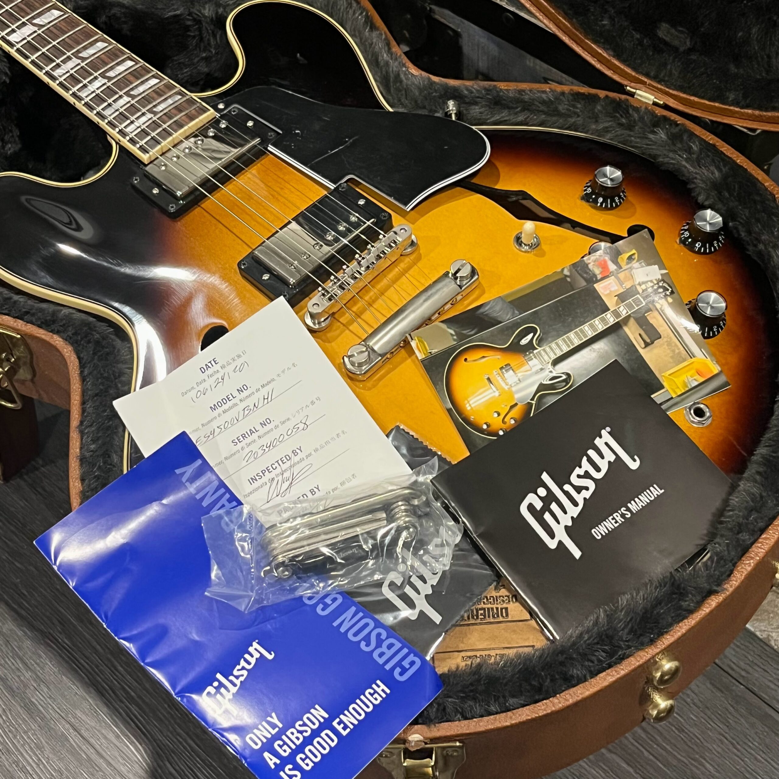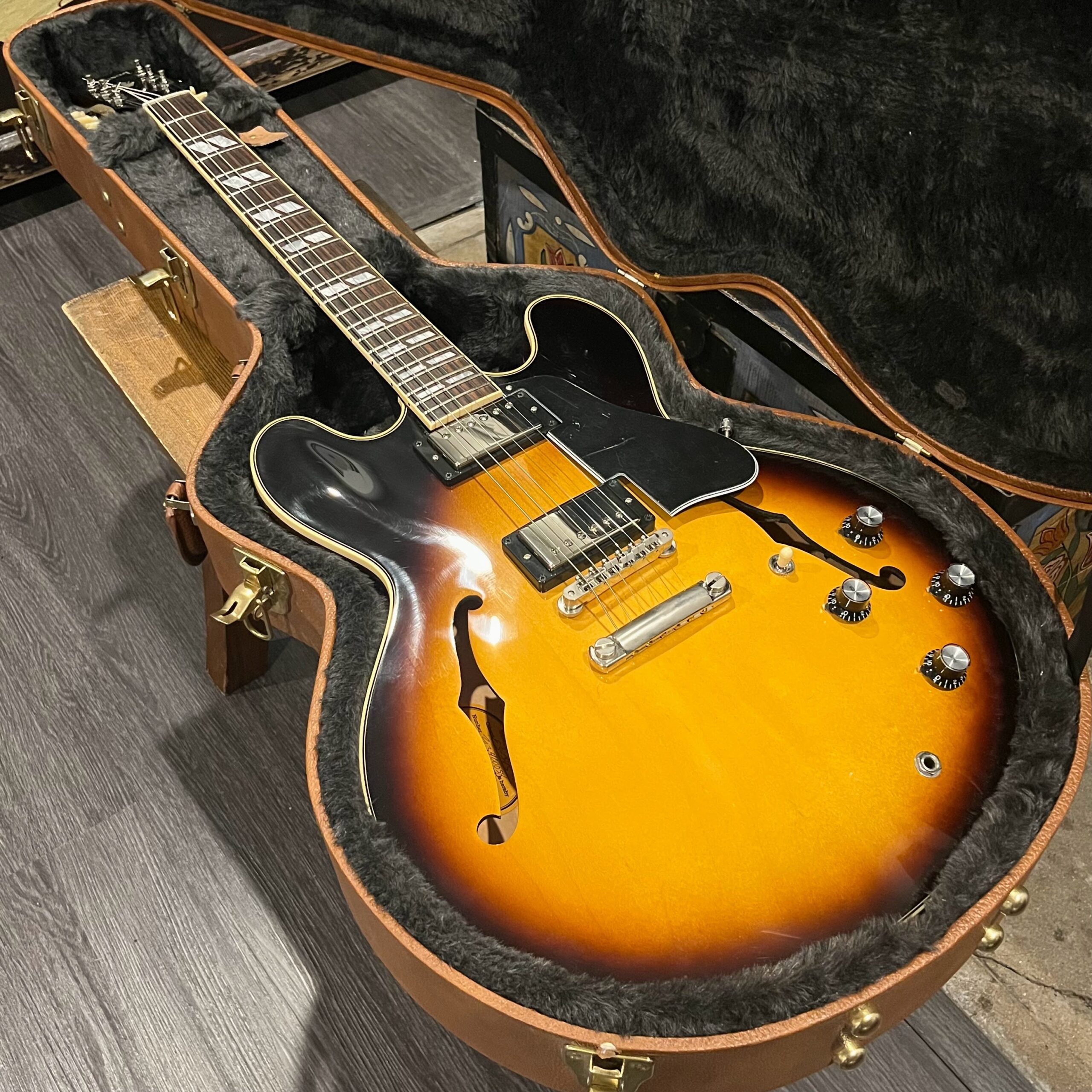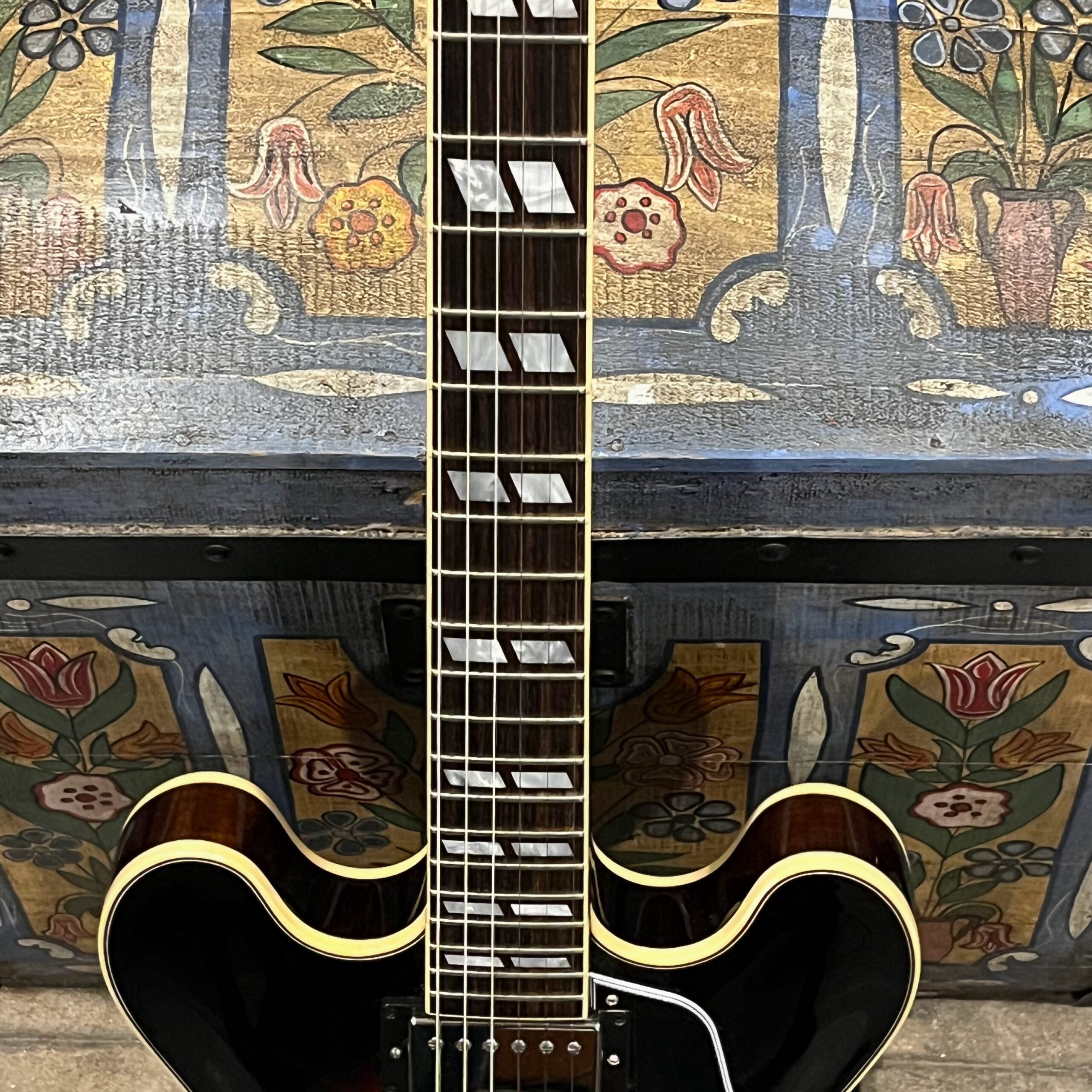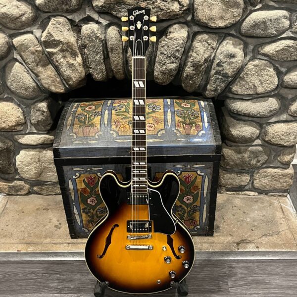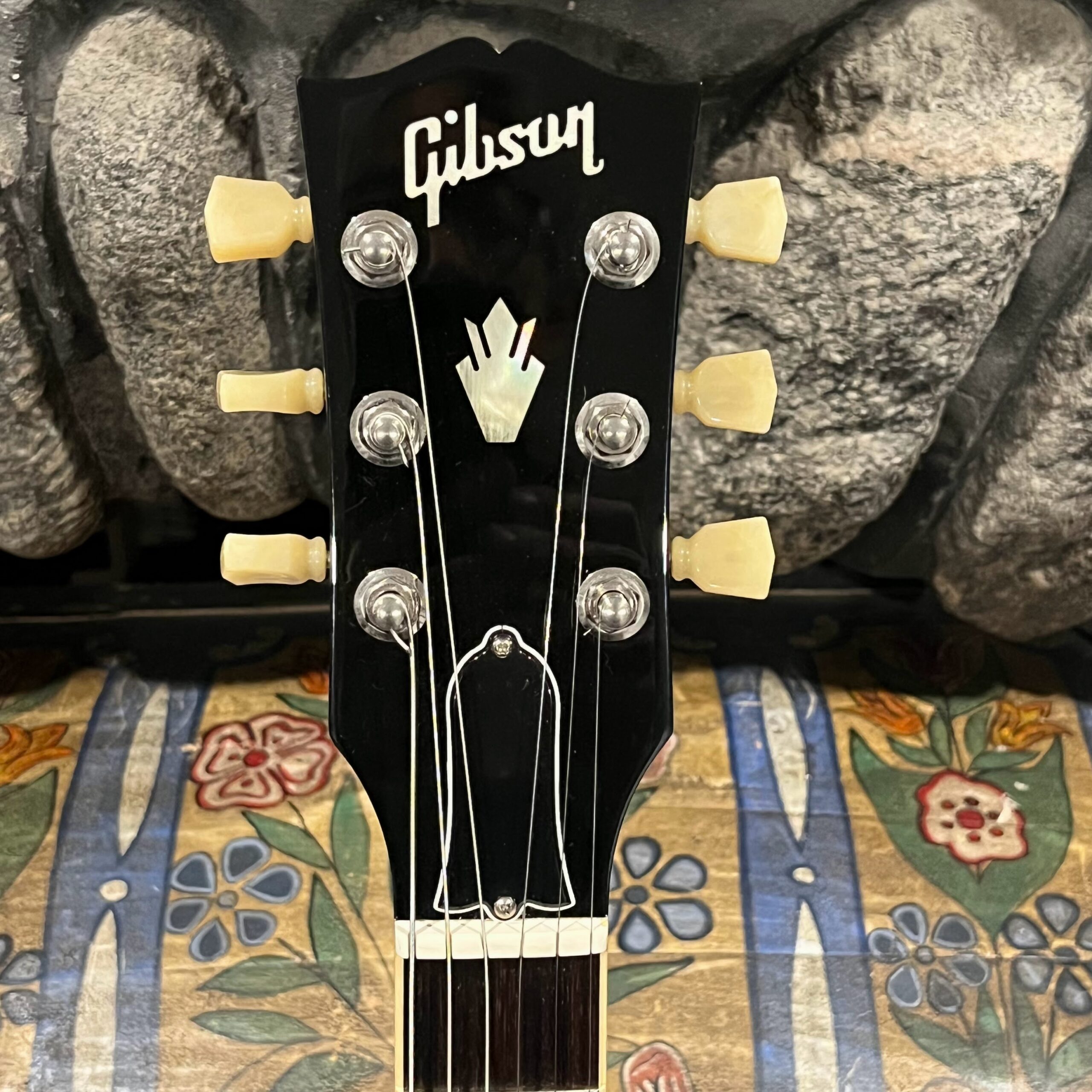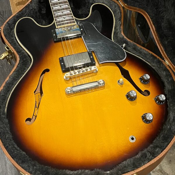 The Gibson ES-345 boasts a number of aesthetic enhancements over the flagship ES-335. Crafted with a maple centerblock and quarter-sawn Adirondack spruce bracing, players will be impressed by the lightweight feel and expanded range of tonal capabilities. The body is wrapped in multi-ply binding, and the bound fingerboard has Split Parallelogram inlays that are exclusive to this model in the ES™ series. The ES-345 is equipped with a variety of high-end appointments like our hand-wired control assembly with Orange Drop® capacitors, Gibson’s new Calibrated T-Type humbucking pickups, Vintage Deluxe style tuners, and a lightweight aluminum ABR-1 bridge and Stop Bar tailpiece anchored with steel thumb wheels and studs. Fresh setup on 10s, weighs 8lb 8oz. Tuning stability is obviously excellent, pickups sound amazing, handwired with bumblebee capacitors. Comes in a stock Gibson case with everything from the factory.
