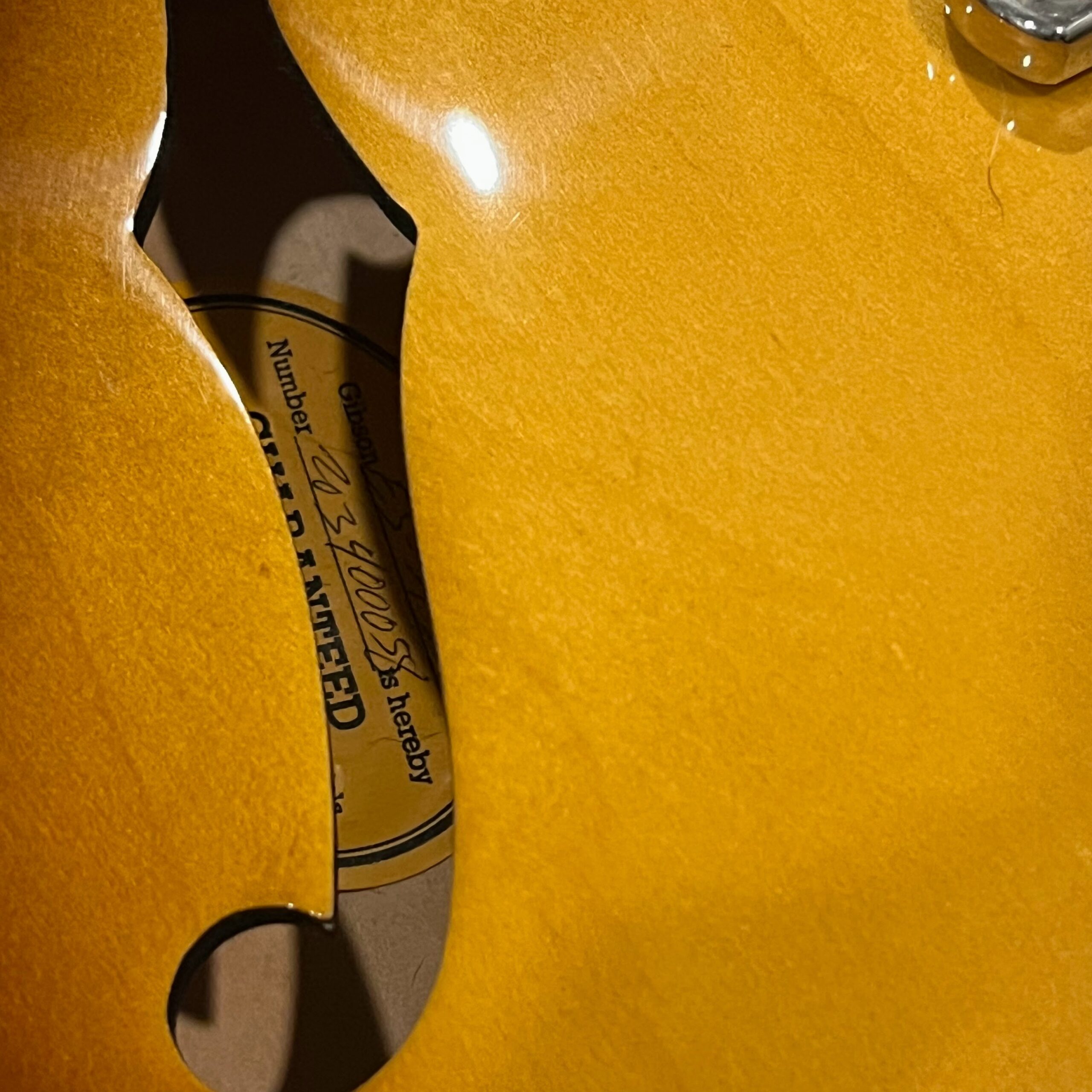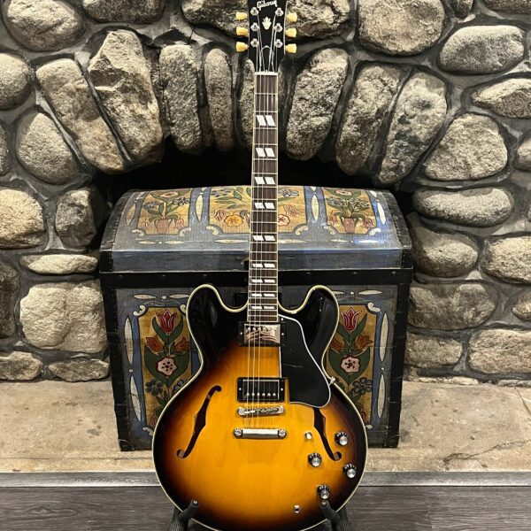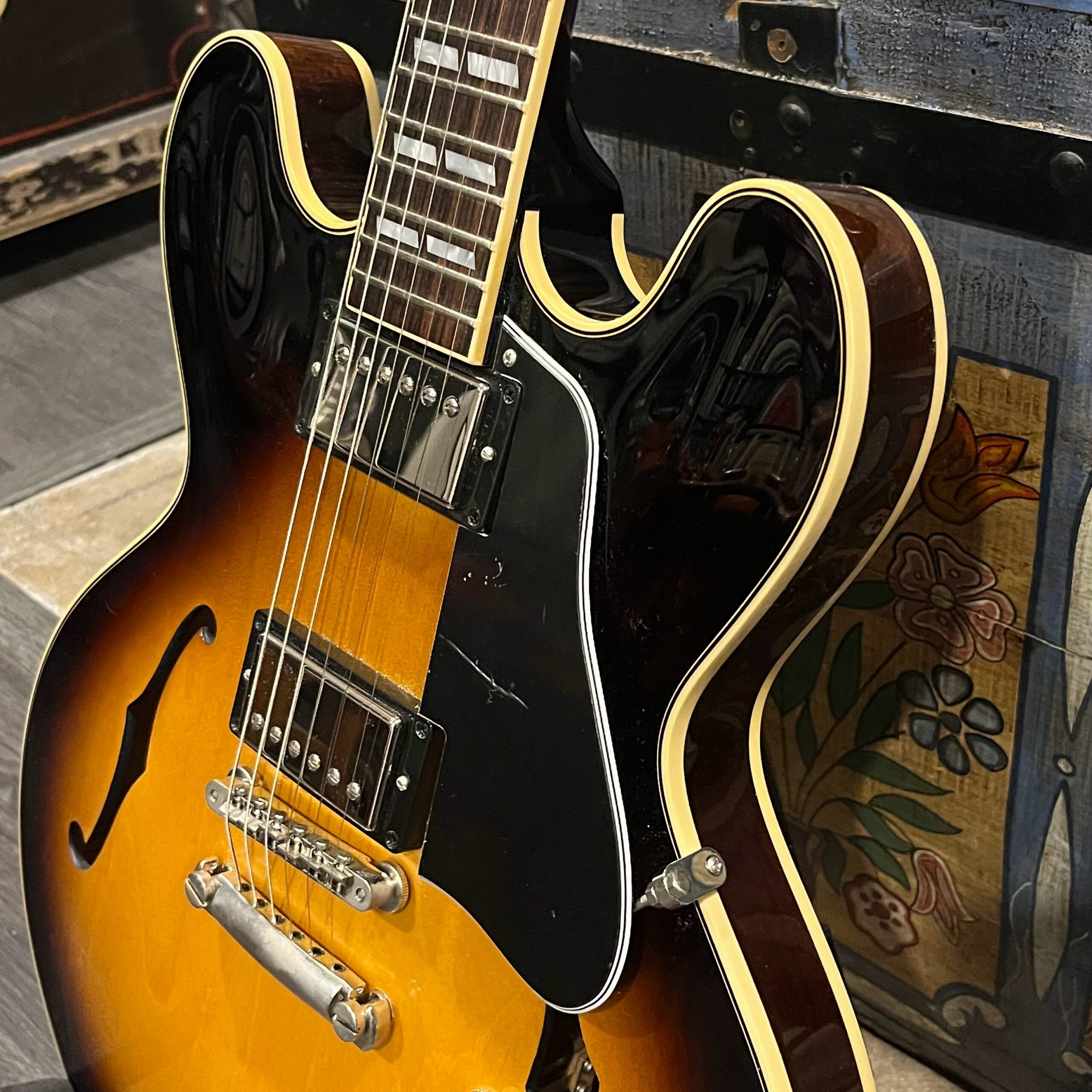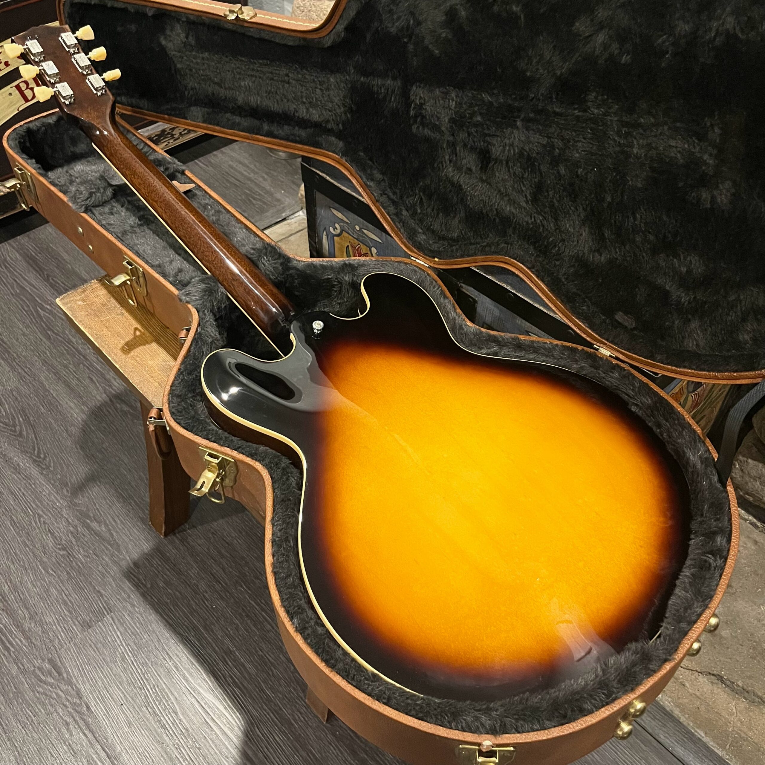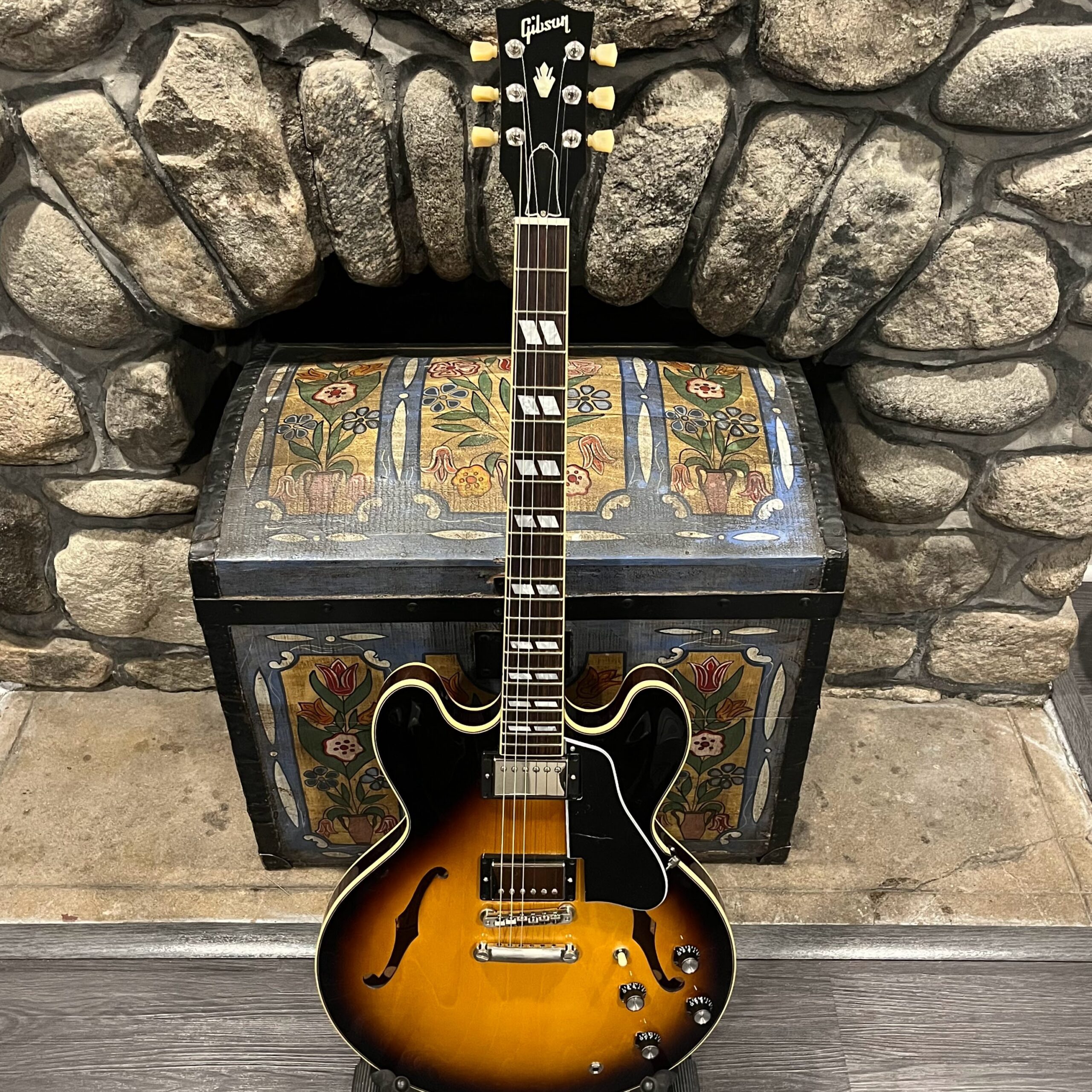 The Gibson ES-345 boasts a number of aesthetic enhancements over the flagship ES-335. Crafted with a maple centerblock and quarter-sawn Adirondack spruce bracing, players will be impressed by the lightweight feel and expanded range of tonal capabilities. The body is wrapped in multi-ply binding, and the bound fingerboard has Split Parallelogram inlays that are exclusive to this model in the ES™ series. The ES-345 is equipped with a variety of high-end appointments like our hand-wired control assembly with Orange Drop® capacitors, Gibson’s new Calibrated T-Type humbucking pickups, Vintage Deluxe style tuners, and a lightweight aluminum ABR-1 bridge and Stop Bar tailpiece anchored with steel thumb wheels and studs. Fresh setup on 10s, weighs 8lb 8oz. Tuning stability is obviously excellent, pickups sound amazing, handwired with bumblebee capacitors. Comes in a stock Gibson case with everything from the factory.