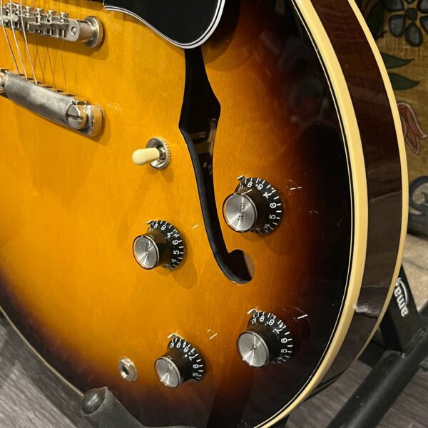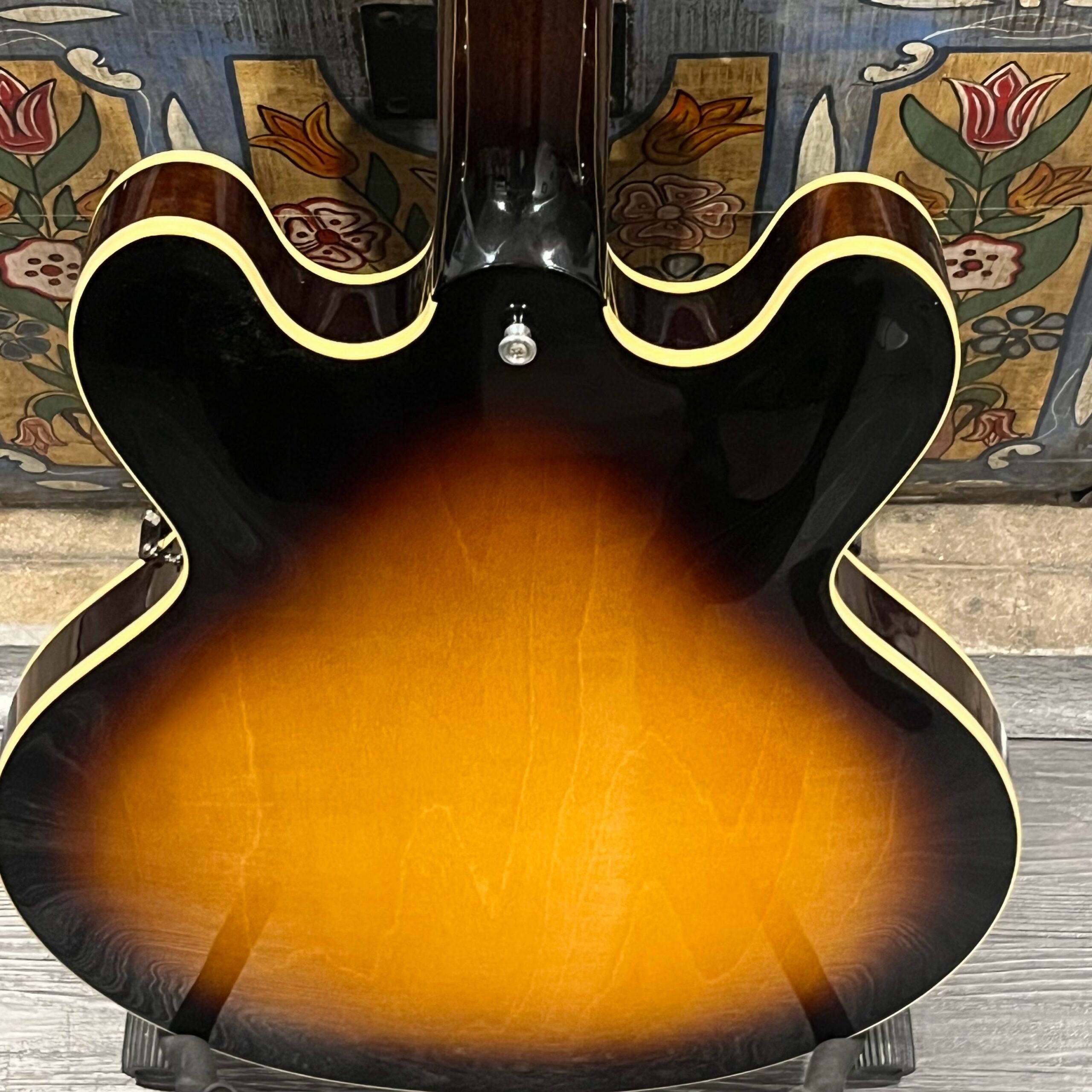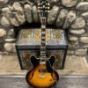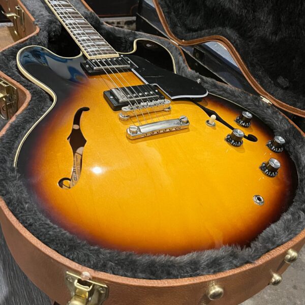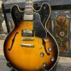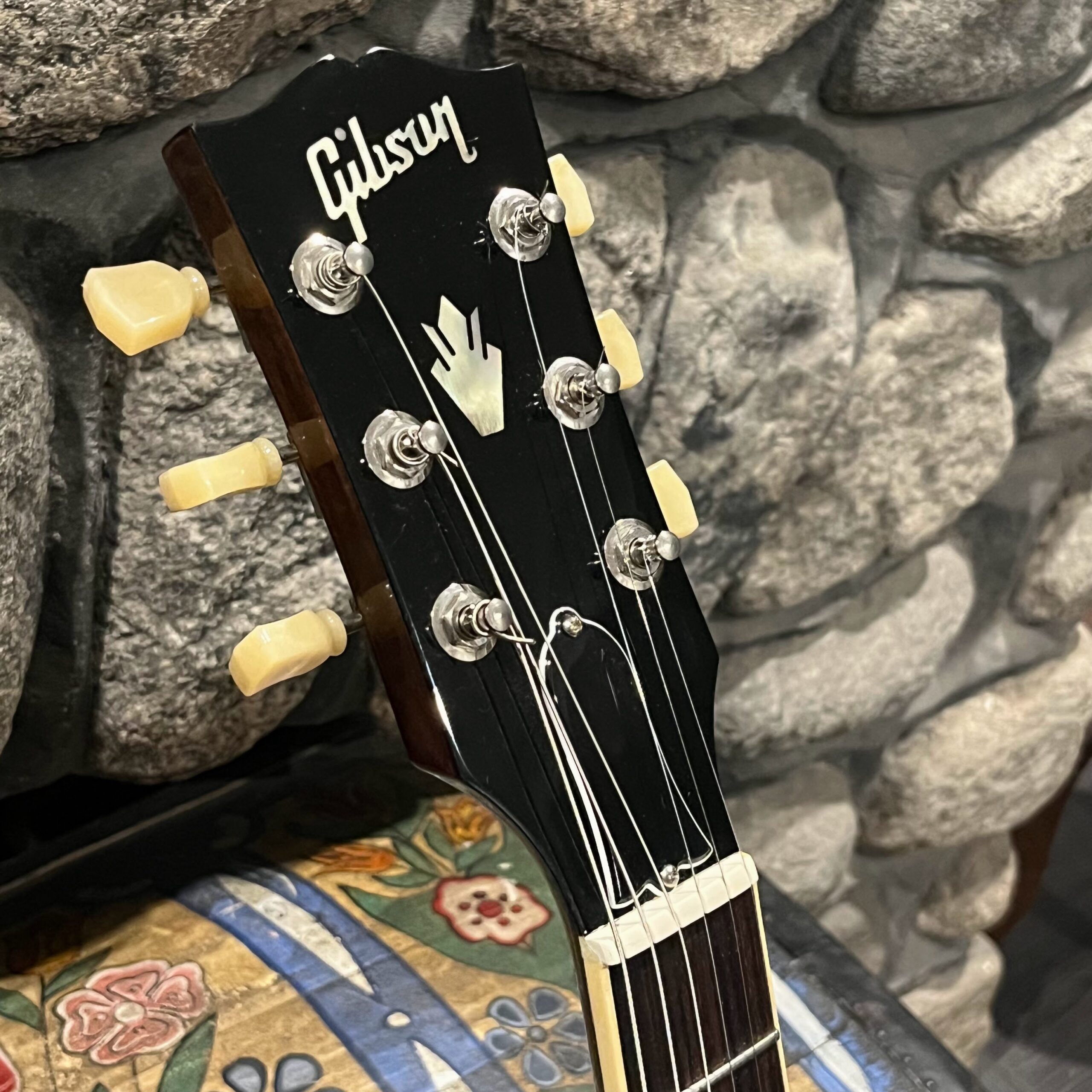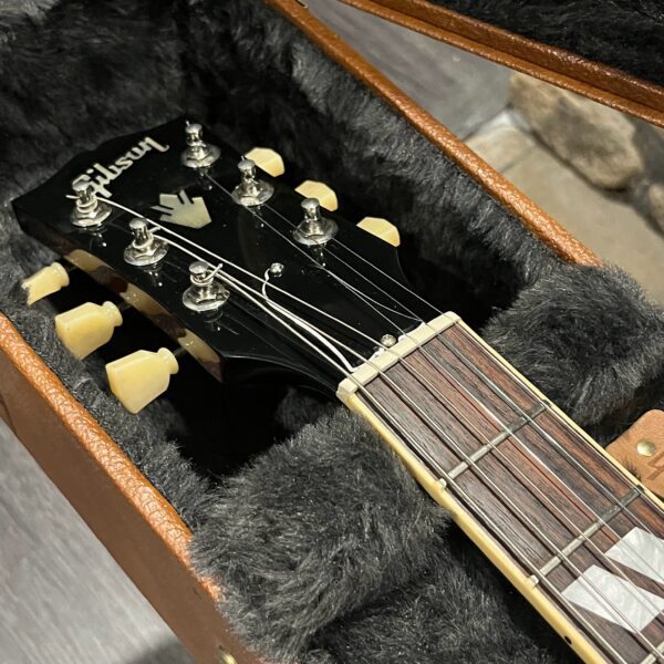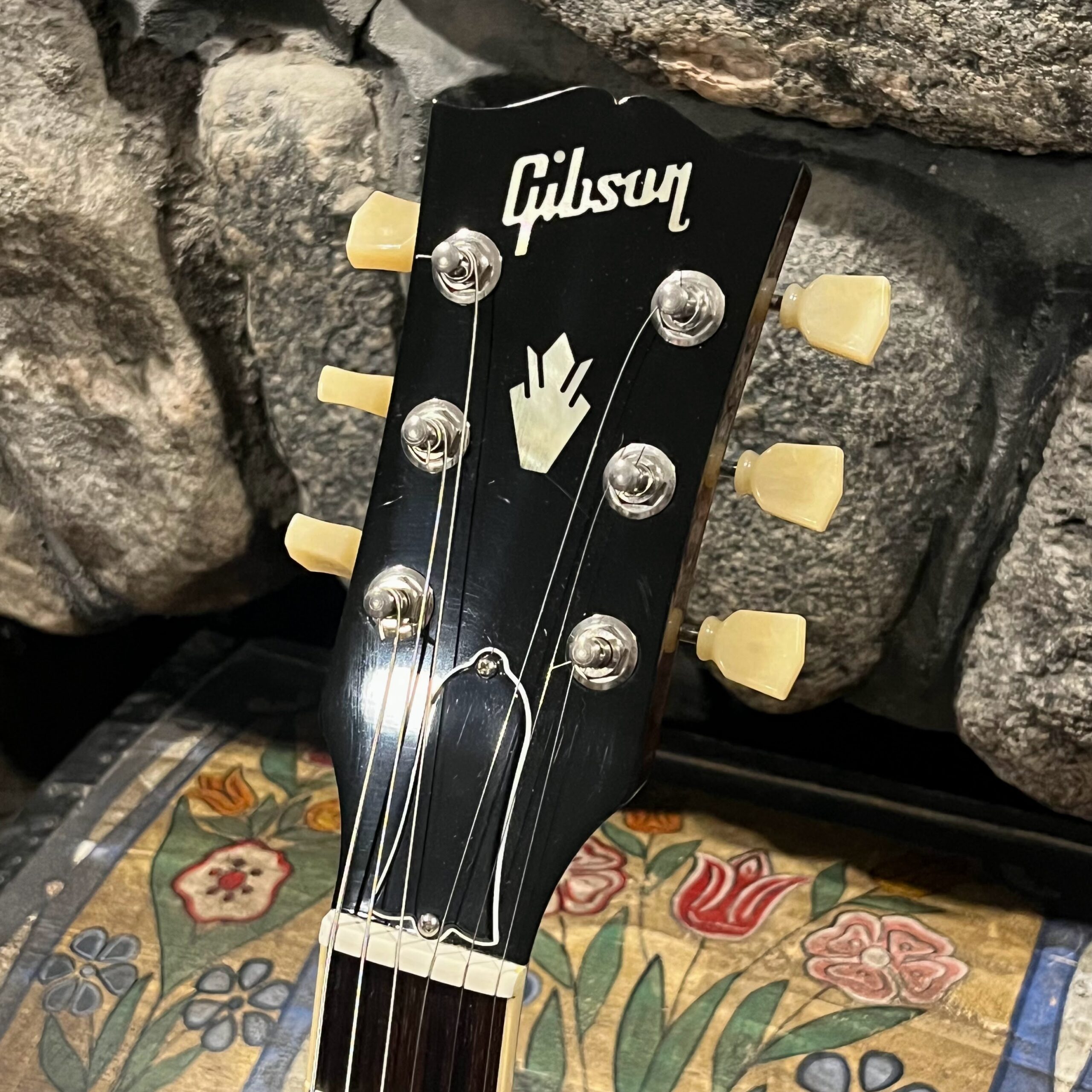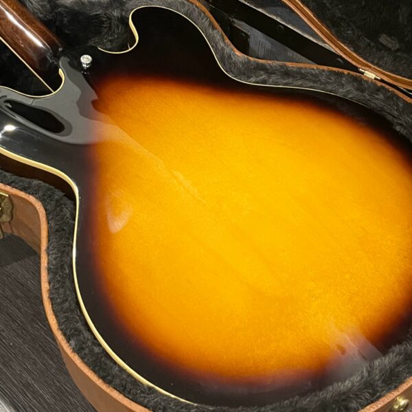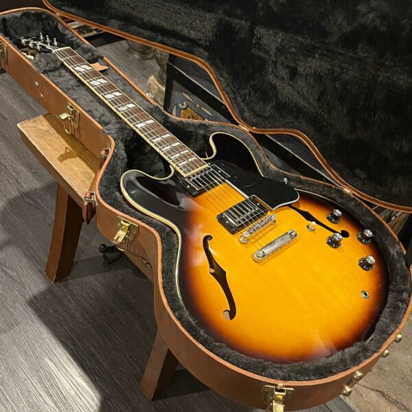 The Gibson ES-345 boasts a number of aesthetic enhancements over the flagship ES-335. Crafted with a maple centerblock and quarter-sawn Adirondack spruce bracing, players will be impressed by the lightweight feel and expanded range of tonal capabilities. The body is wrapped in multi-ply binding, and the bound fingerboard has Split Parallelogram inlays that are exclusive to this model in the ES™ series. The ES-345 is equipped with a variety of high-end appointments like our hand-wired control assembly with Orange Drop® capacitors, Gibson’s new Calibrated T-Type humbucking pickups, Vintage Deluxe style tuners, and a lightweight aluminum ABR-1 bridge and Stop Bar tailpiece anchored with steel thumb wheels and studs. Fresh setup on 10s, weighs 8lb 8oz. Tuning stability is obviously excellent, pickups sound amazing, handwired with bumblebee capacitors. Comes in a stock Gibson case with everything from the factory.