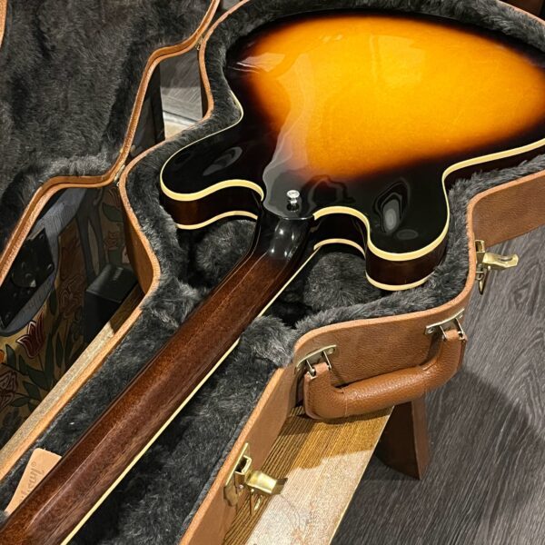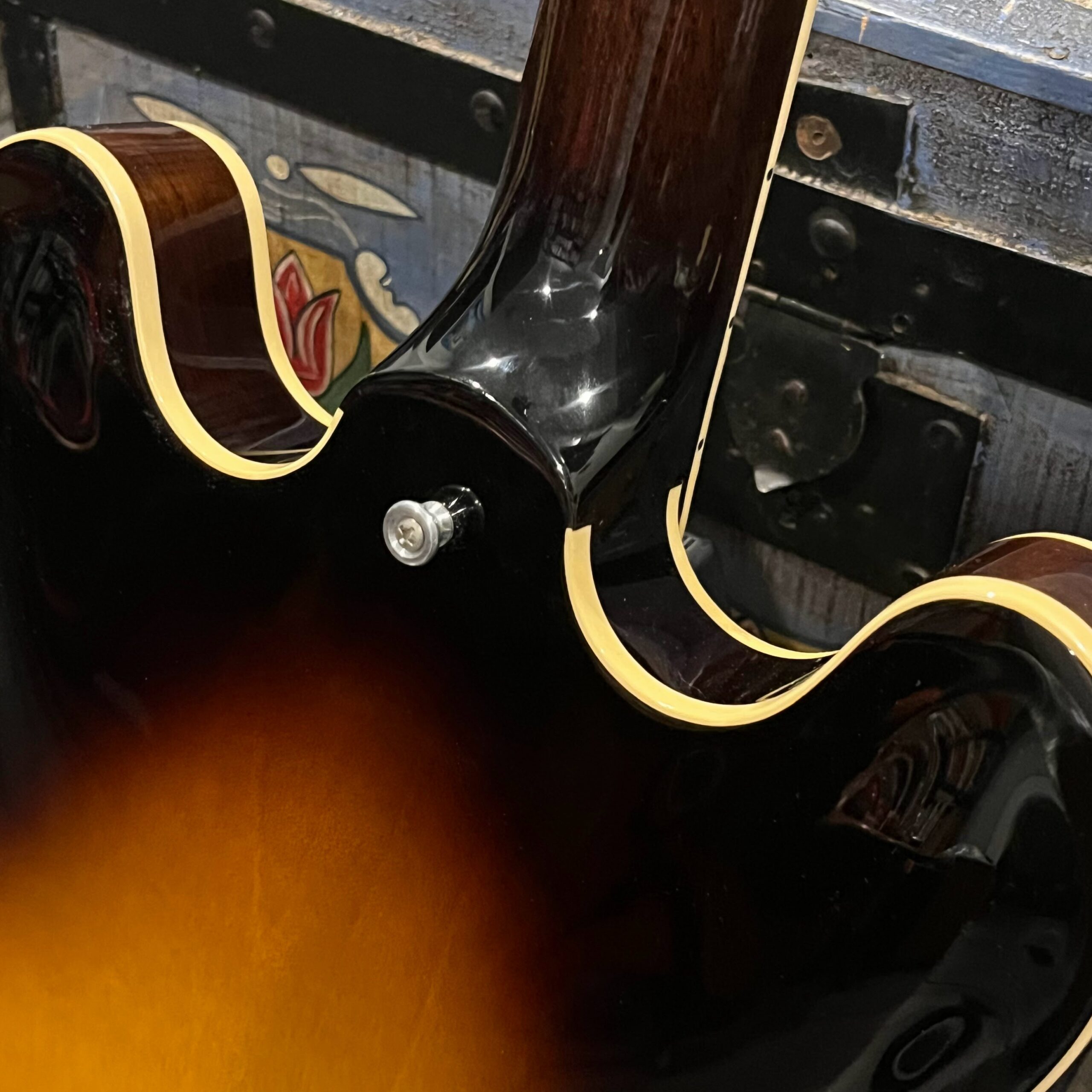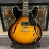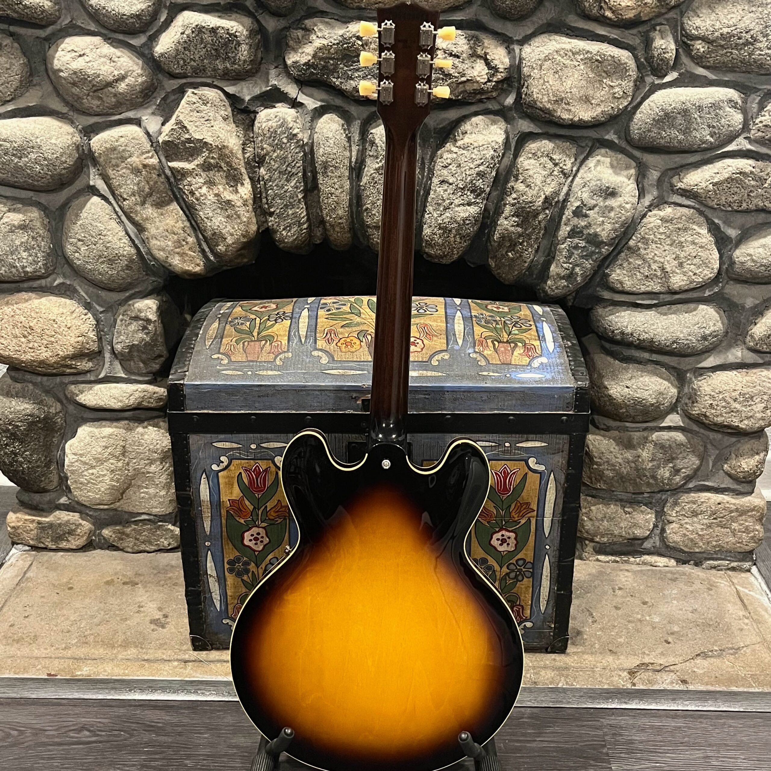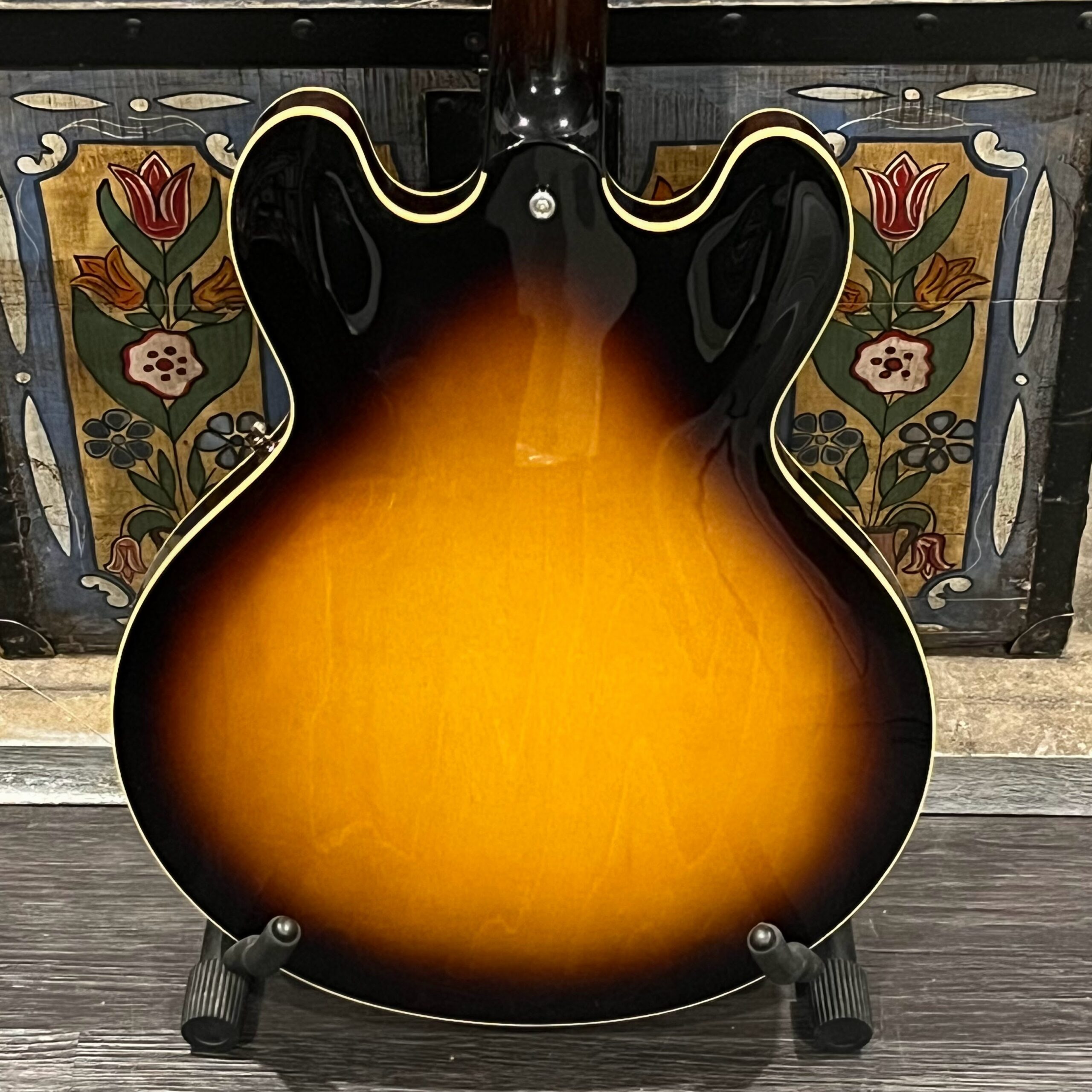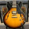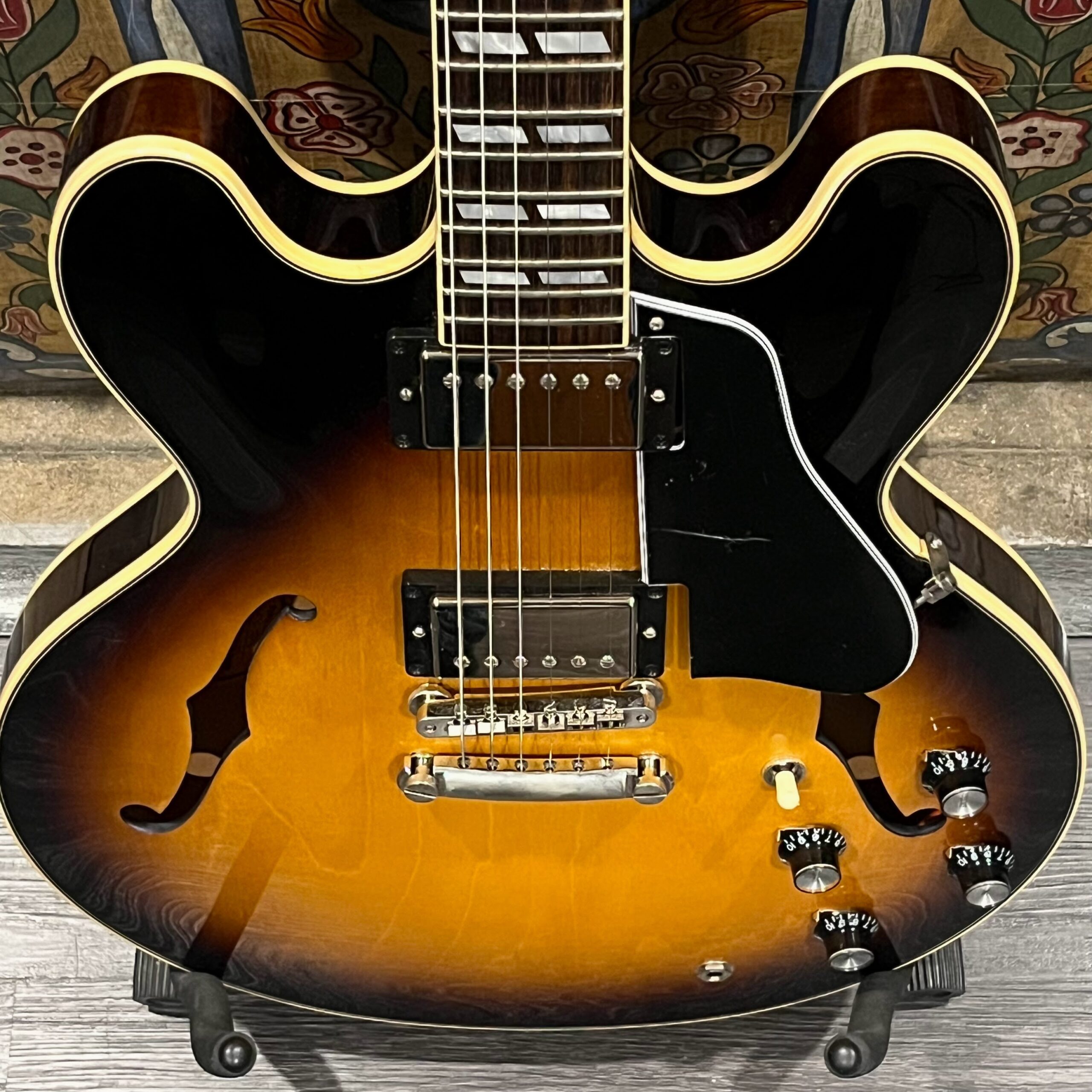 The Gibson ES-345 boasts a number of aesthetic enhancements over the flagship ES-335. Crafted with a maple centerblock and quarter-sawn Adirondack spruce bracing, players will be impressed by the lightweight feel and expanded range of tonal capabilities. The body is wrapped in multi-ply binding, and the bound fingerboard has Split Parallelogram inlays that are exclusive to this model in the ES™ series. The ES-345 is equipped with a variety of high-end appointments like our hand-wired control assembly with Orange Drop® capacitors, Gibson’s new Calibrated T-Type humbucking pickups, Vintage Deluxe style tuners, and a lightweight aluminum ABR-1 bridge and Stop Bar tailpiece anchored with steel thumb wheels and studs. Fresh setup on 10s, weighs 8lb 8oz. Tuning stability is obviously excellent, pickups sound amazing, handwired with bumblebee capacitors. Comes in a stock Gibson case with everything from the factory.