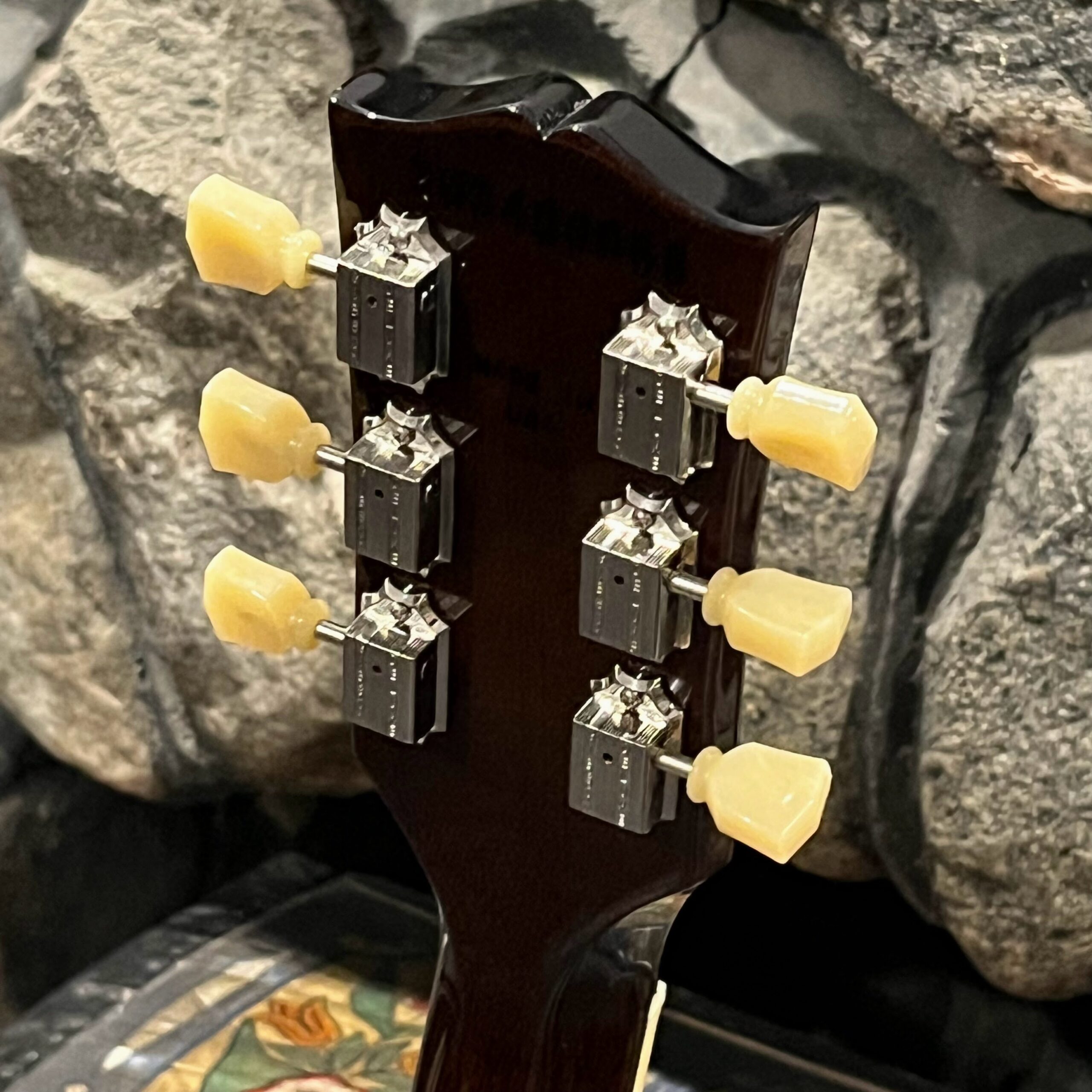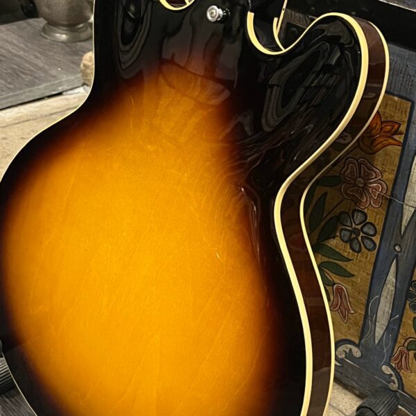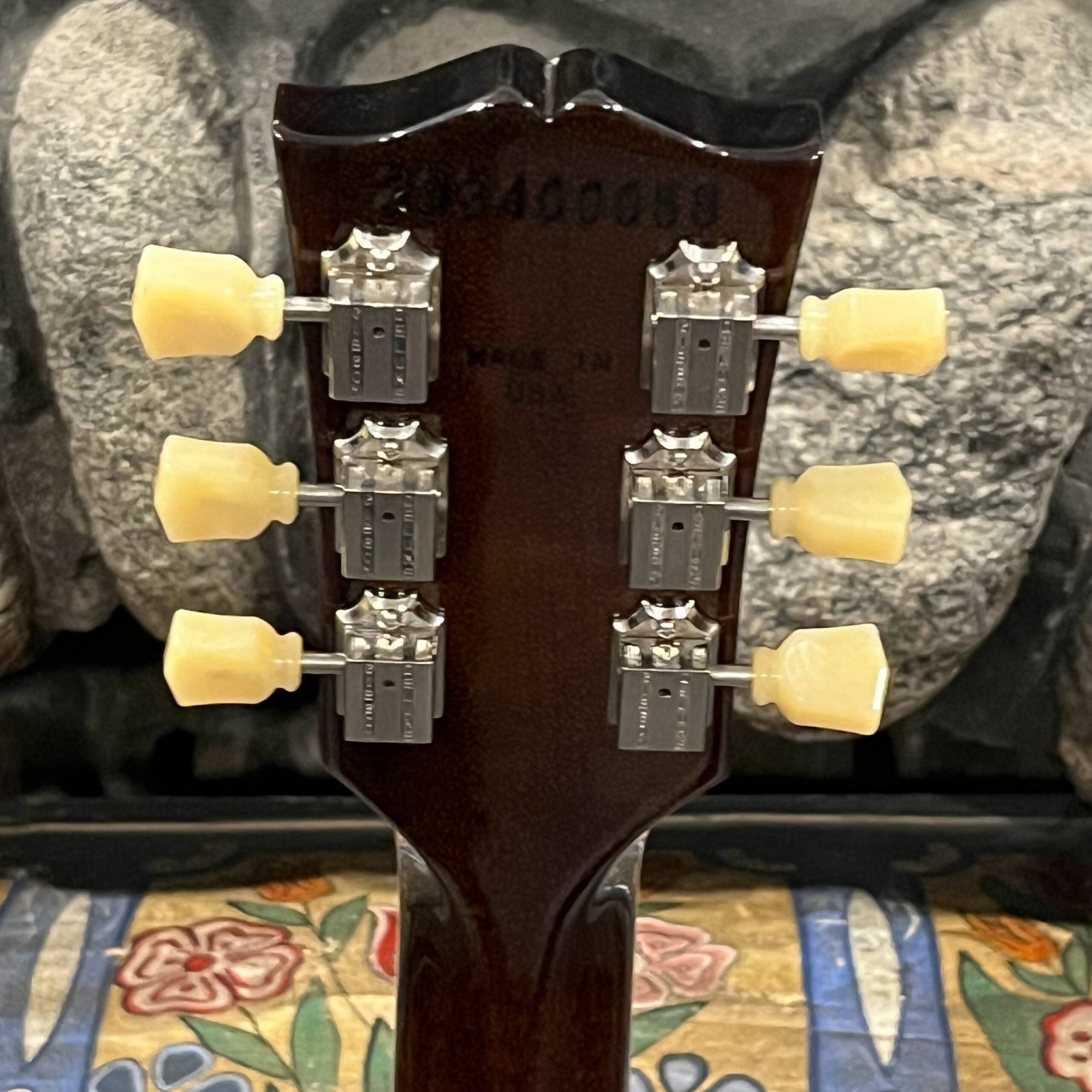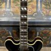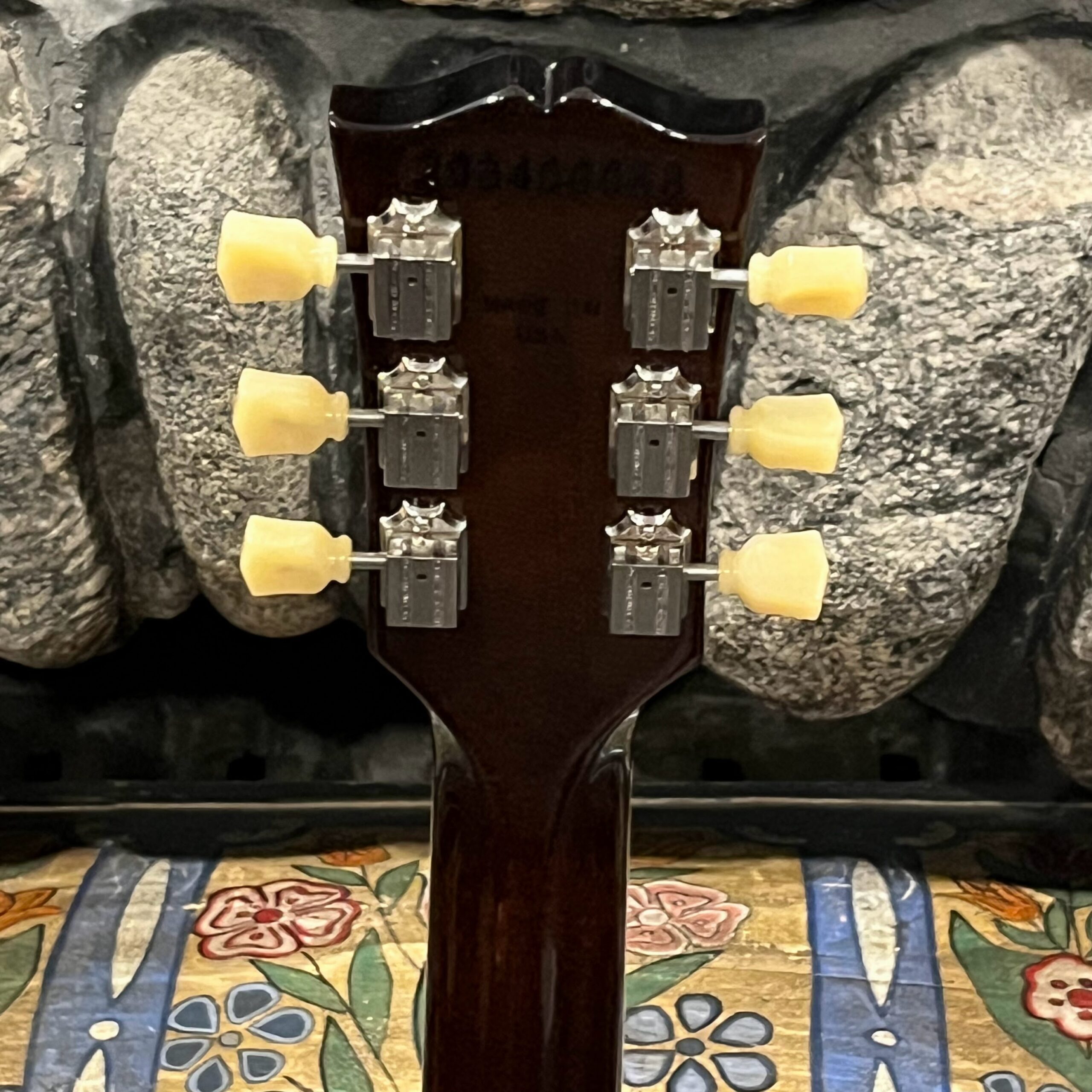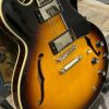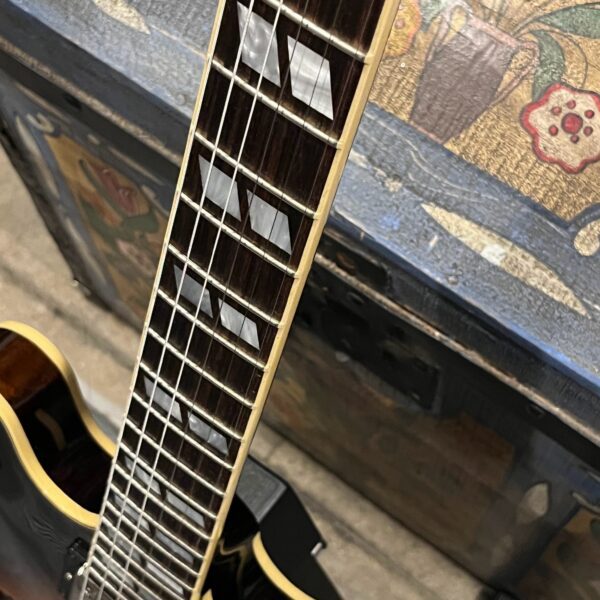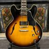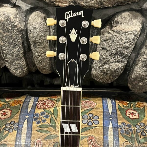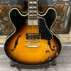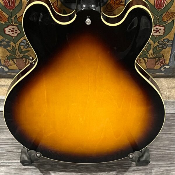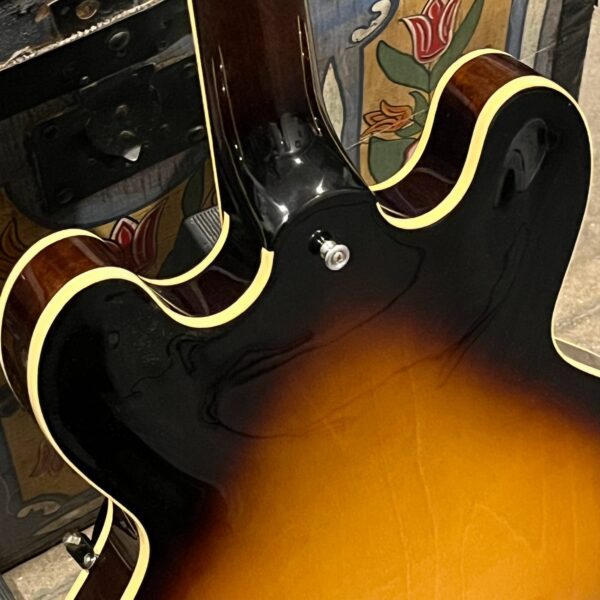 The Gibson ES-345 boasts a number of aesthetic enhancements over the flagship ES-335. Crafted with a maple centerblock and quarter-sawn Adirondack spruce bracing, players will be impressed by the lightweight feel and expanded range of tonal capabilities. The body is wrapped in multi-ply binding, and the bound fingerboard has Split Parallelogram inlays that are exclusive to this model in the ES™ series. The ES-345 is equipped with a variety of high-end appointments like our hand-wired control assembly with Orange Drop® capacitors, Gibson’s new Calibrated T-Type humbucking pickups, Vintage Deluxe style tuners, and a lightweight aluminum ABR-1 bridge and Stop Bar tailpiece anchored with steel thumb wheels and studs. Fresh setup on 10s, weighs 8lb 8oz. Tuning stability is obviously excellent, pickups sound amazing, handwired with bumblebee capacitors. Comes in a stock Gibson case with everything from the factory.