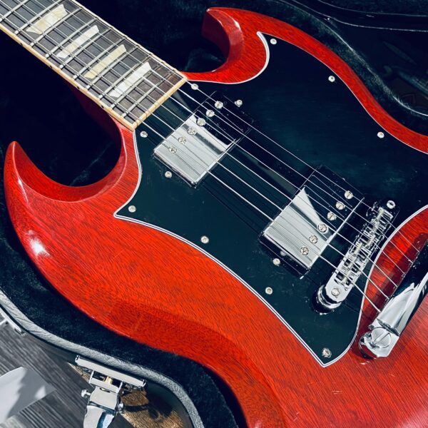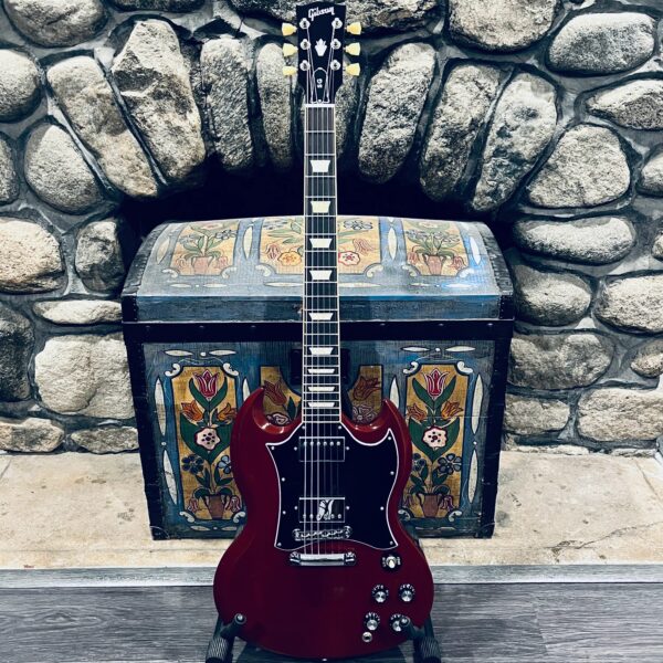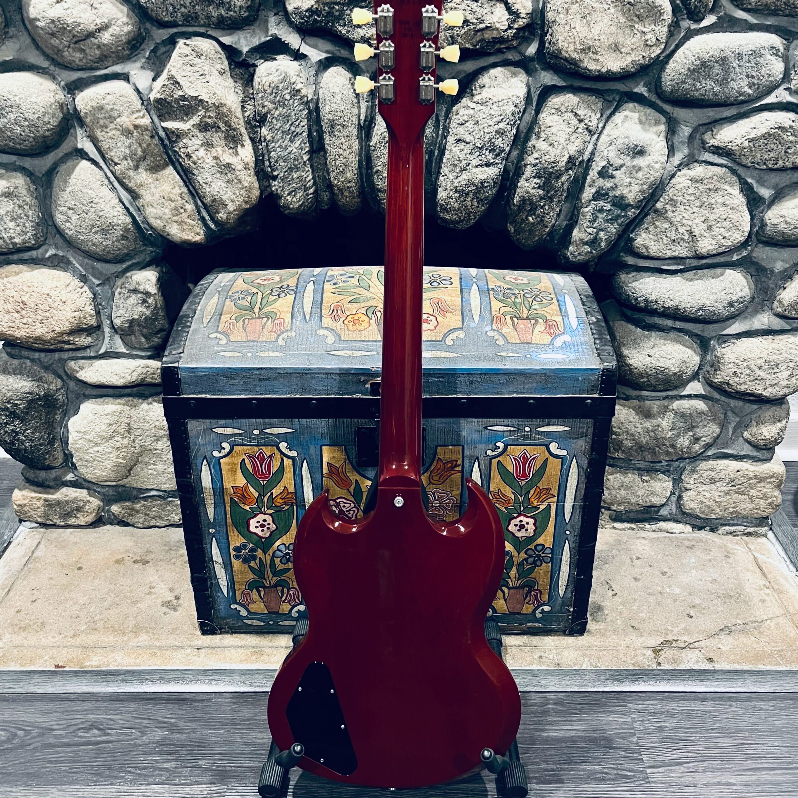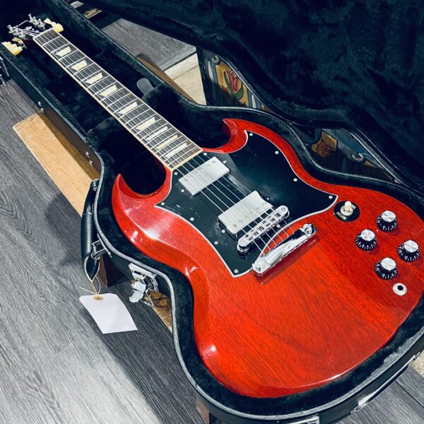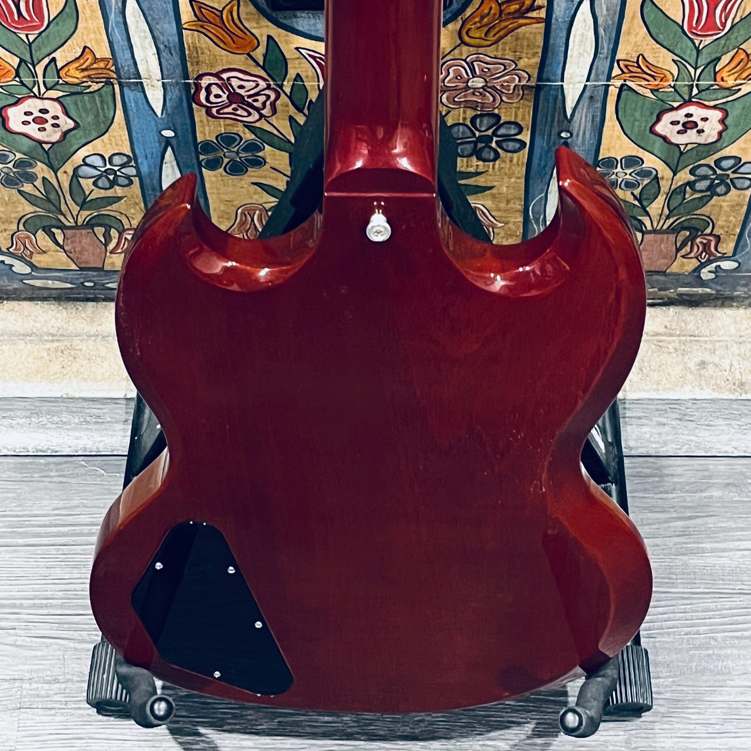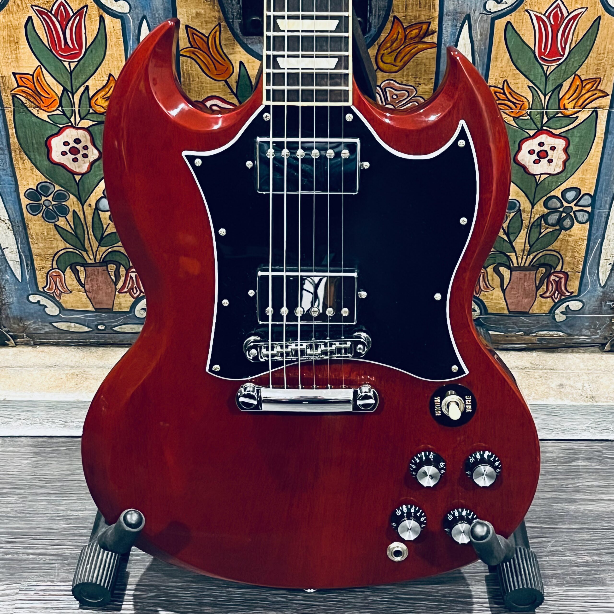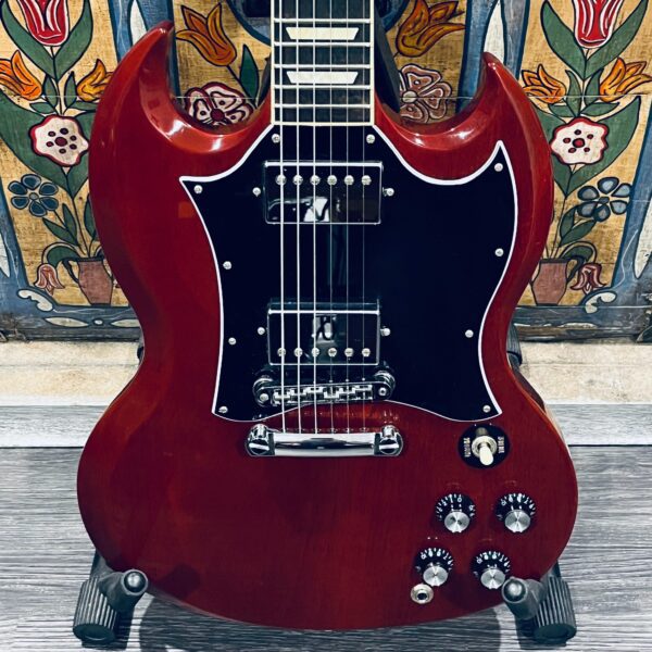 The Gibson SG Standard rocks the classic looks and features associated with the late-60s-style SG™ models so many players love. A solid mahogany body provides the backbone for singing sustain, while a rounded profile mahogany neck and bound rosewood fingerboard deliver a comfortable playing experience across all 22 frets. A long tenon 19th fret neck joint enhances resonance, making it ideal for everything from vintage blues to modern high-gain solos. In the electronics department, the 490R (neck) and 490T (bridge) Alnico 2 humbuckers™ produce a versatile range of tones. Their clear, balanced output can easily cover a wide range of genres—softening nicely for warm clean passages and roaring to life when pushing an amp into overdrive. Dedicated volume and tone controls, along with a 3-way toggle switch, offer quick access to any sound you need. Visually, a black 5-ply full-face pickguard sets this SG Standard apart from other models, and chrome-finished hardware adds a timeless touch. Grover® Rotomatics® tuners keep tuning precise, while the aluminum Tune-O-Matic™ bridge and Stop Bar tailpiece ensure reliable intonation. Rounded out by black Top Hat knobs with silver reflectors, this SG Standard captures the look and spirit of Gibson’s classic late-60s design. Beautiful deep Heritage Cherry nitro finish looks excellent, comes with original plastics, cream switch tip, beautiful almost ebony dark rosewood fretboard, 22 clean frets. Weighs an amazing 6lb and 8oz and is set up on 10s. Comes in a clean aftermarket hardshell case.