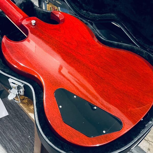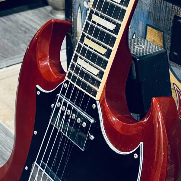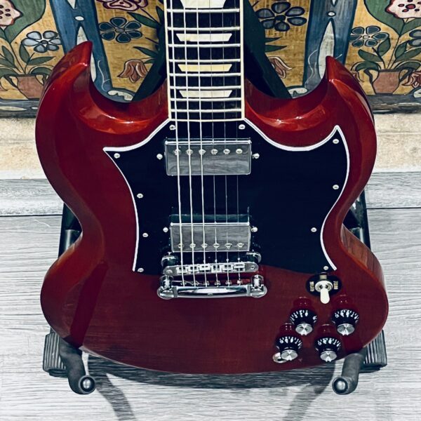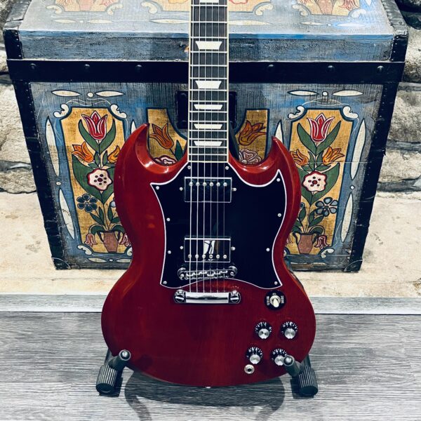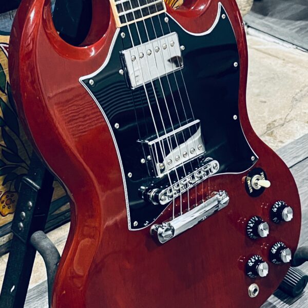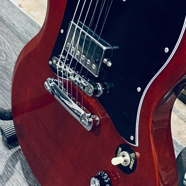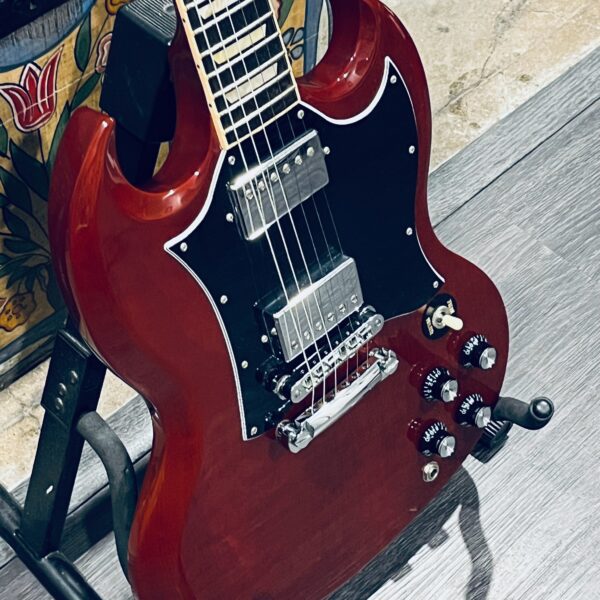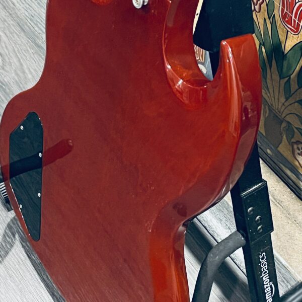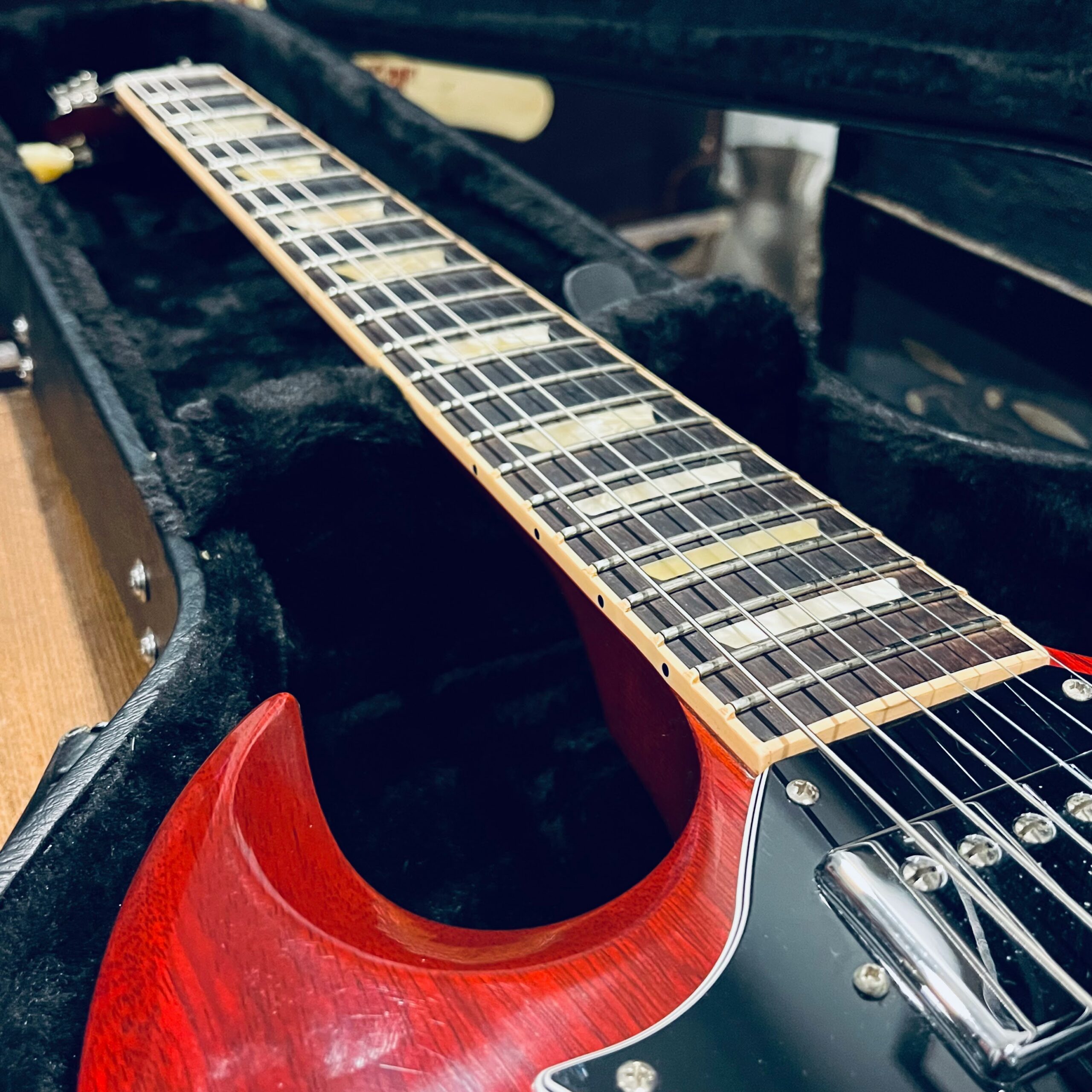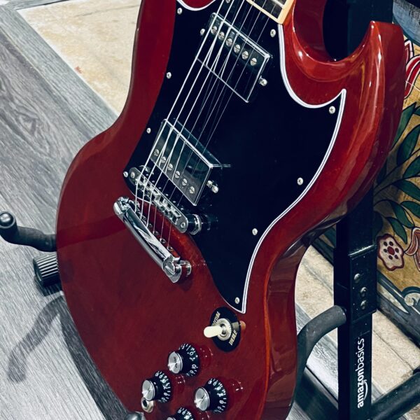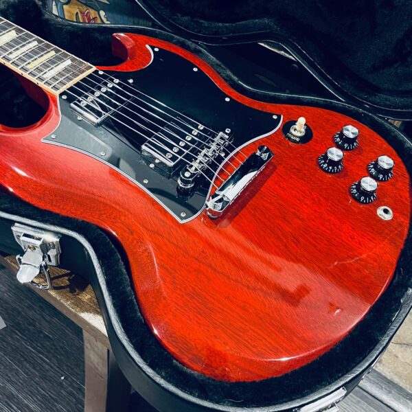 The Gibson SG Standard rocks the classic looks and features associated with the late-60s-style SG™ models so many players love. A solid mahogany body provides the backbone for singing sustain, while a rounded profile mahogany neck and bound rosewood fingerboard deliver a comfortable playing experience across all 22 frets. A long tenon 19th fret neck joint enhances resonance, making it ideal for everything from vintage blues to modern high-gain solos. In the electronics department, the 490R (neck) and 490T (bridge) Alnico 2 humbuckers™ produce a versatile range of tones. Their clear, balanced output can easily cover a wide range of genres—softening nicely for warm clean passages and roaring to life when pushing an amp into overdrive. Dedicated volume and tone controls, along with a 3-way toggle switch, offer quick access to any sound you need. Visually, a black 5-ply full-face pickguard sets this SG Standard apart from other models, and chrome-finished hardware adds a timeless touch. Grover® Rotomatics® tuners keep tuning precise, while the aluminum Tune-O-Matic™ bridge and Stop Bar tailpiece ensure reliable intonation. Rounded out by black Top Hat knobs with silver reflectors, this SG Standard captures the look and spirit of Gibson’s classic late-60s design. Beautiful deep Heritage Cherry nitro finish looks excellent, comes with original plastics, cream switch tip, beautiful almost ebony dark rosewood fretboard, 22 clean frets. Weighs an amazing 6lb and 8oz and is set up on 10s. Comes in a clean aftermarket hardshell case.