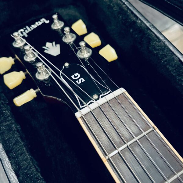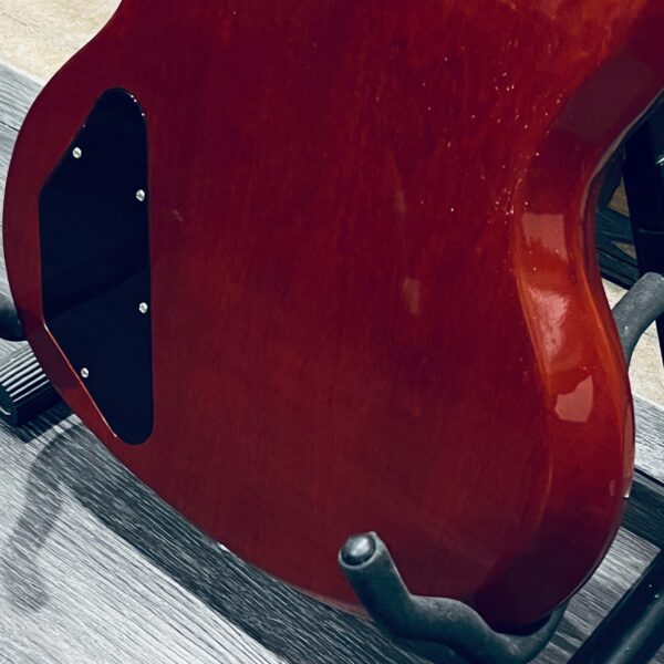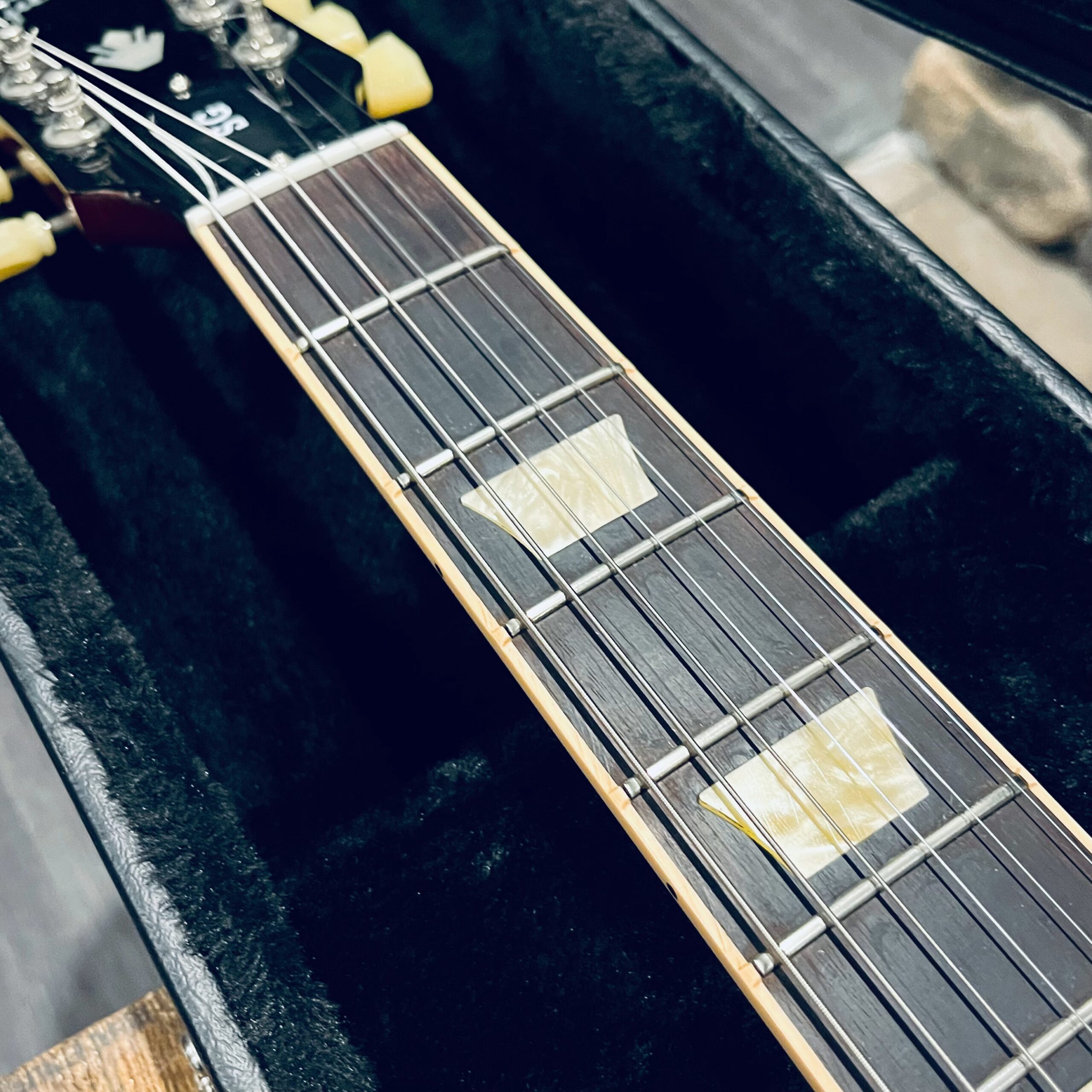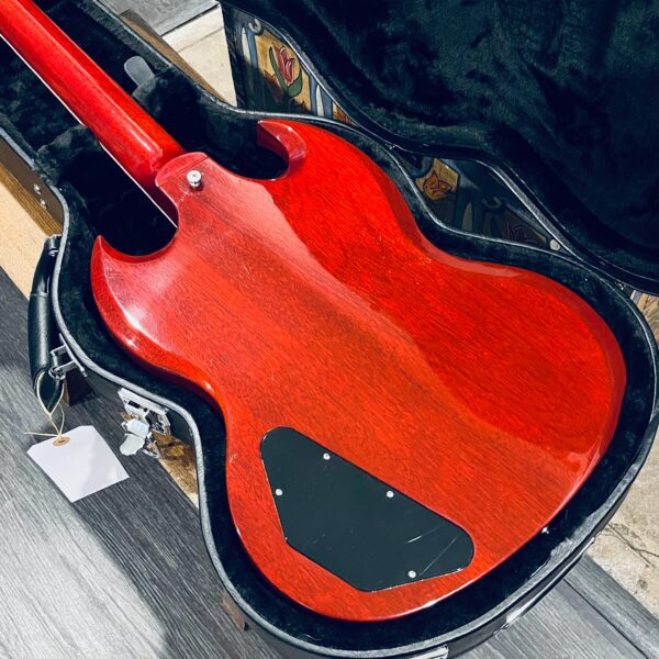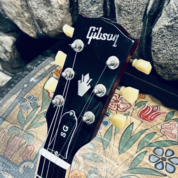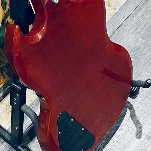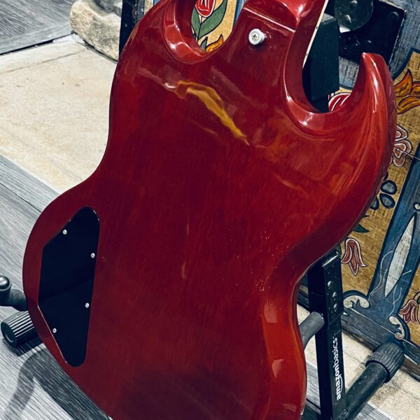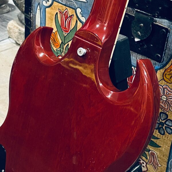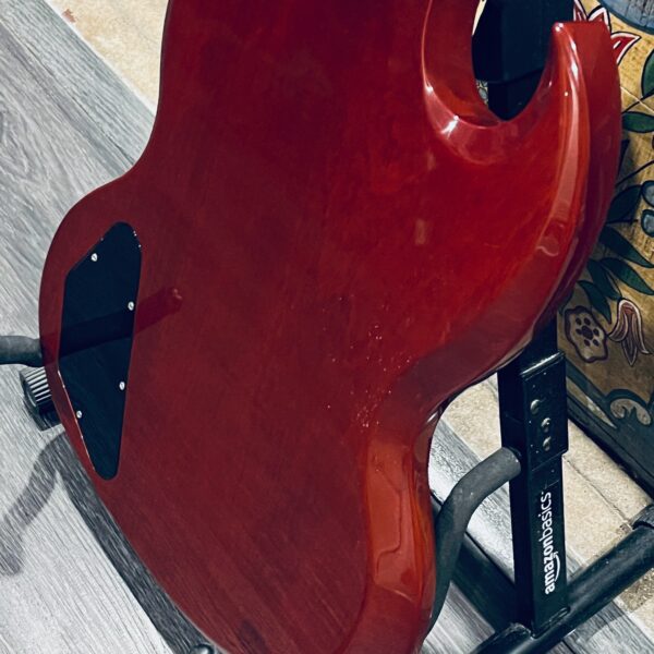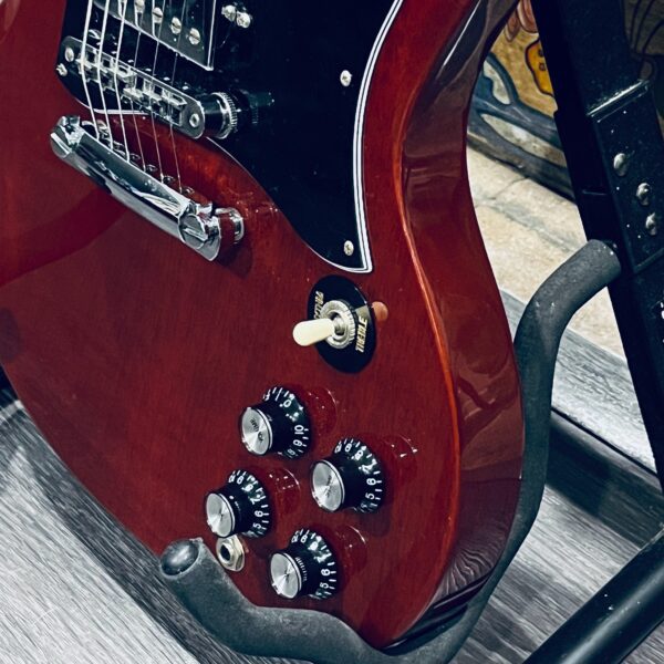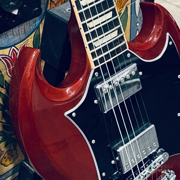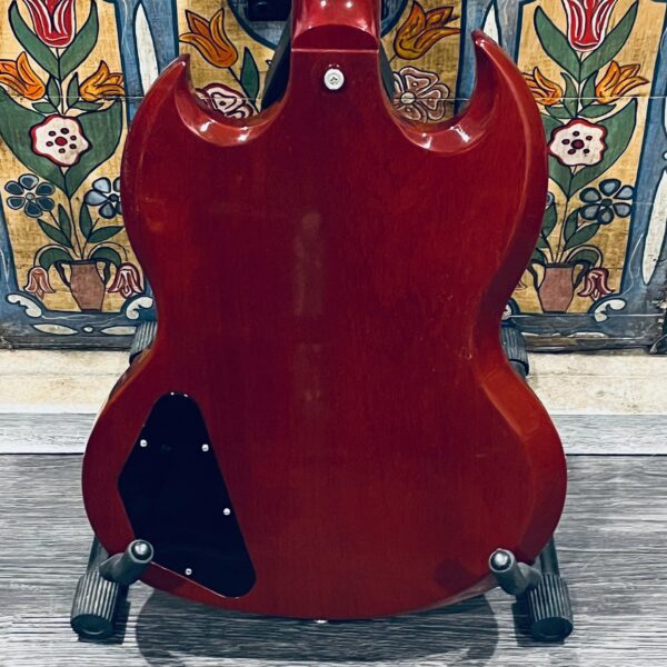 The Gibson SG Standard rocks the classic looks and features associated with the late-60s-style SG™ models so many players love. A solid mahogany body provides the backbone for singing sustain, while a rounded profile mahogany neck and bound rosewood fingerboard deliver a comfortable playing experience across all 22 frets. A long tenon 19th fret neck joint enhances resonance, making it ideal for everything from vintage blues to modern high-gain solos. In the electronics department, the 490R (neck) and 490T (bridge) Alnico 2 humbuckers™ produce a versatile range of tones. Their clear, balanced output can easily cover a wide range of genres—softening nicely for warm clean passages and roaring to life when pushing an amp into overdrive. Dedicated volume and tone controls, along with a 3-way toggle switch, offer quick access to any sound you need. Visually, a black 5-ply full-face pickguard sets this SG Standard apart from other models, and chrome-finished hardware adds a timeless touch. Grover® Rotomatics® tuners keep tuning precise, while the aluminum Tune-O-Matic™ bridge and Stop Bar tailpiece ensure reliable intonation. Rounded out by black Top Hat knobs with silver reflectors, this SG Standard captures the look and spirit of Gibson’s classic late-60s design. Beautiful deep Heritage Cherry nitro finish looks excellent, comes with original plastics, cream switch tip, beautiful almost ebony dark rosewood fretboard, 22 clean frets. Weighs an amazing 6lb and 8oz and is set up on 10s. Comes in a clean aftermarket hardshell case.