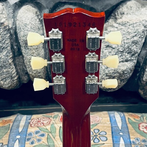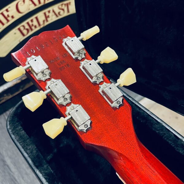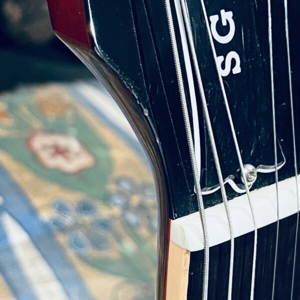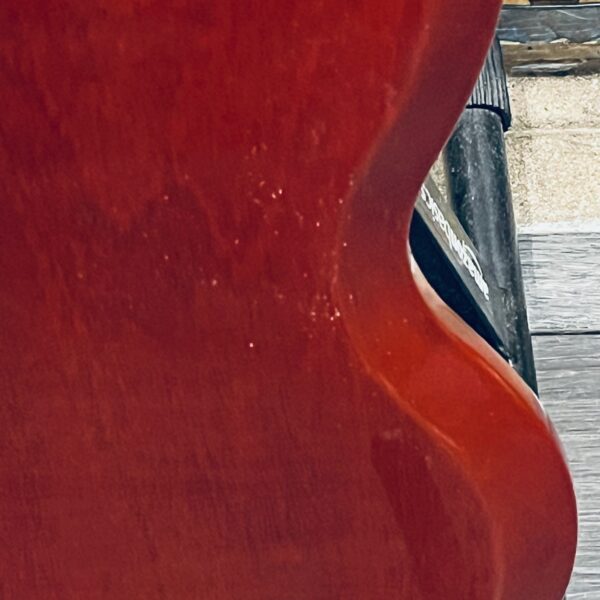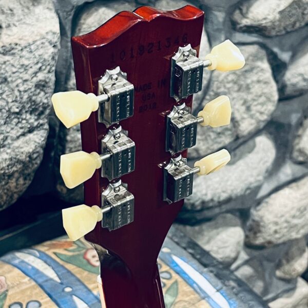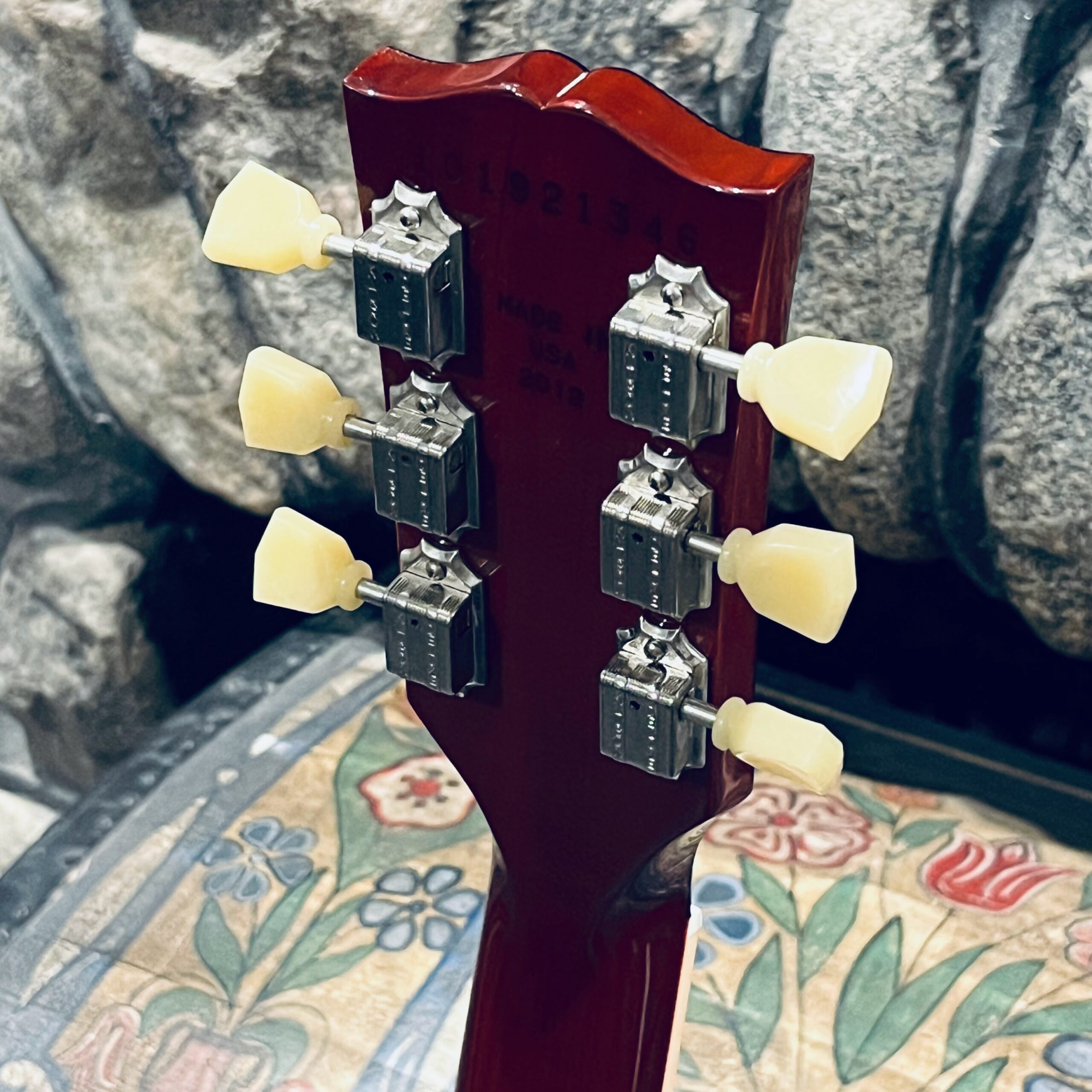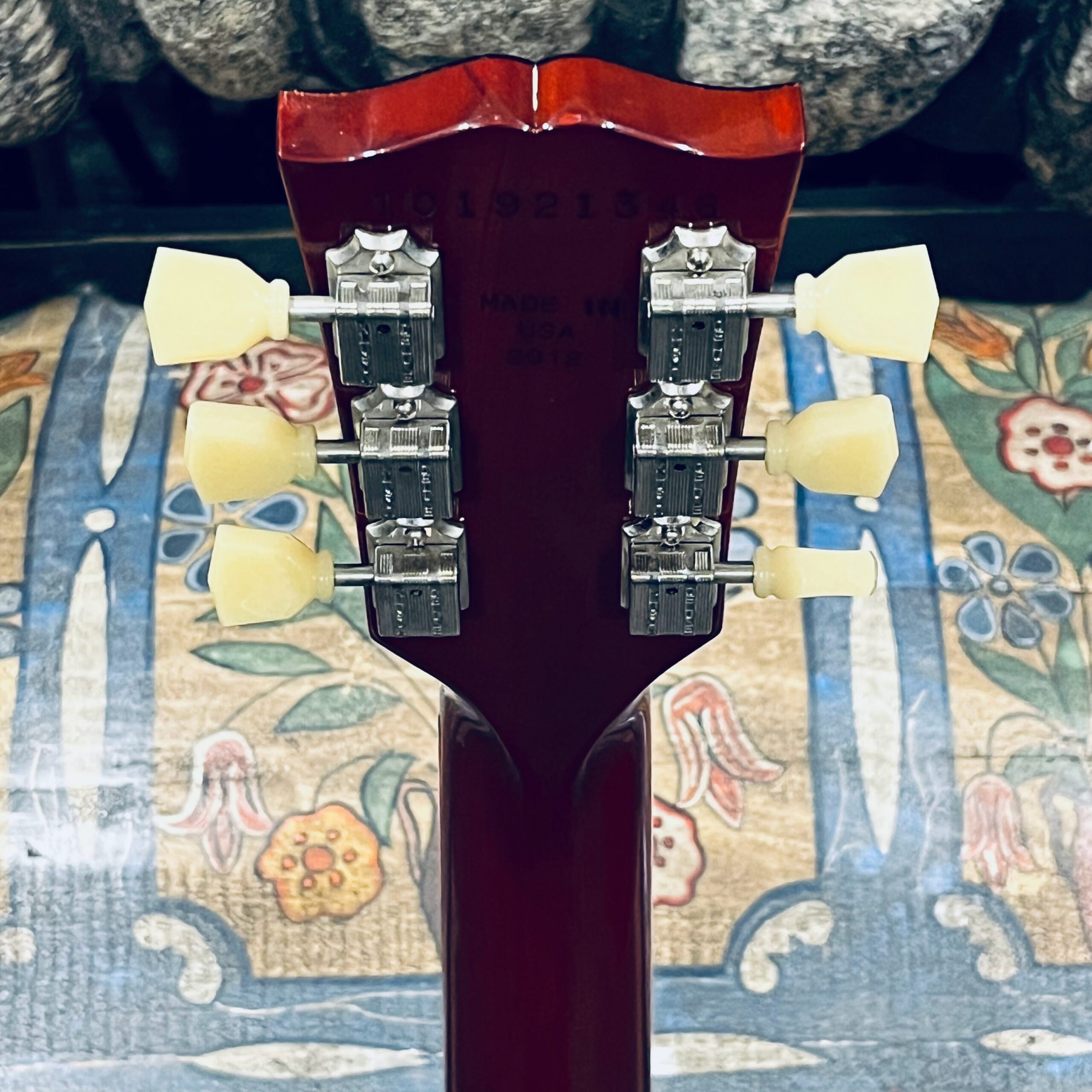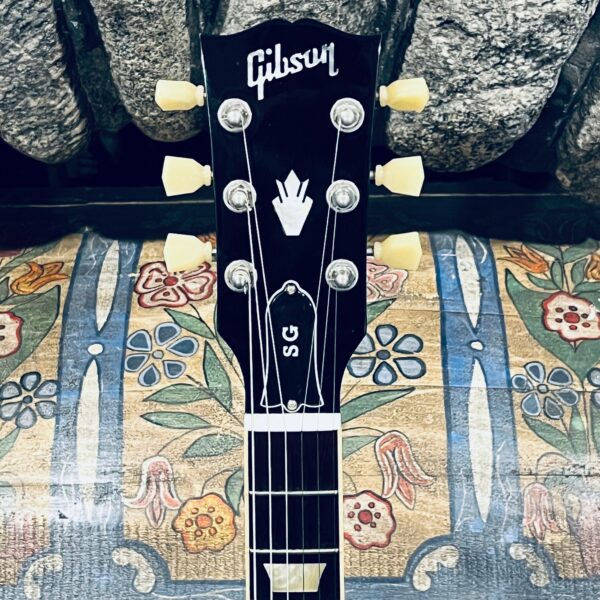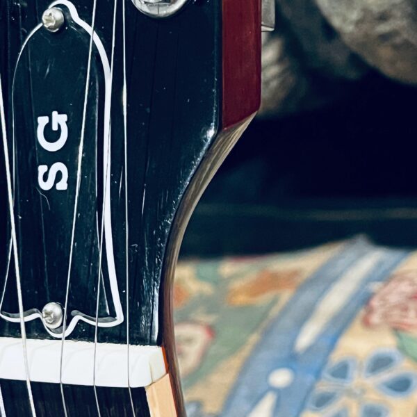 The Gibson SG Standard rocks the classic looks and features associated with the late-60s-style SG™ models so many players love. A solid mahogany body provides the backbone for singing sustain, while a rounded profile mahogany neck and bound rosewood fingerboard deliver a comfortable playing experience across all 22 frets. A long tenon 19th fret neck joint enhances resonance, making it ideal for everything from vintage blues to modern high-gain solos. In the electronics department, the 490R (neck) and 490T (bridge) Alnico 2 humbuckers™ produce a versatile range of tones. Their clear, balanced output can easily cover a wide range of genres—softening nicely for warm clean passages and roaring to life when pushing an amp into overdrive. Dedicated volume and tone controls, along with a 3-way toggle switch, offer quick access to any sound you need. Visually, a black 5-ply full-face pickguard sets this SG Standard apart from other models, and chrome-finished hardware adds a timeless touch. Grover® Rotomatics® tuners keep tuning precise, while the aluminum Tune-O-Matic™ bridge and Stop Bar tailpiece ensure reliable intonation. Rounded out by black Top Hat knobs with silver reflectors, this SG Standard captures the look and spirit of Gibson’s classic late-60s design. Beautiful deep Heritage Cherry nitro finish looks excellent, comes with original plastics, cream switch tip, beautiful almost ebony dark rosewood fretboard, 22 clean frets. Weighs an amazing 6lb and 8oz and is set up on 10s. Comes in a clean aftermarket hardshell case.